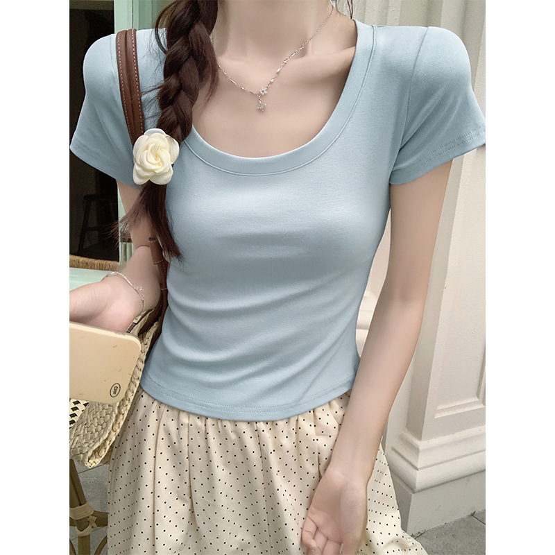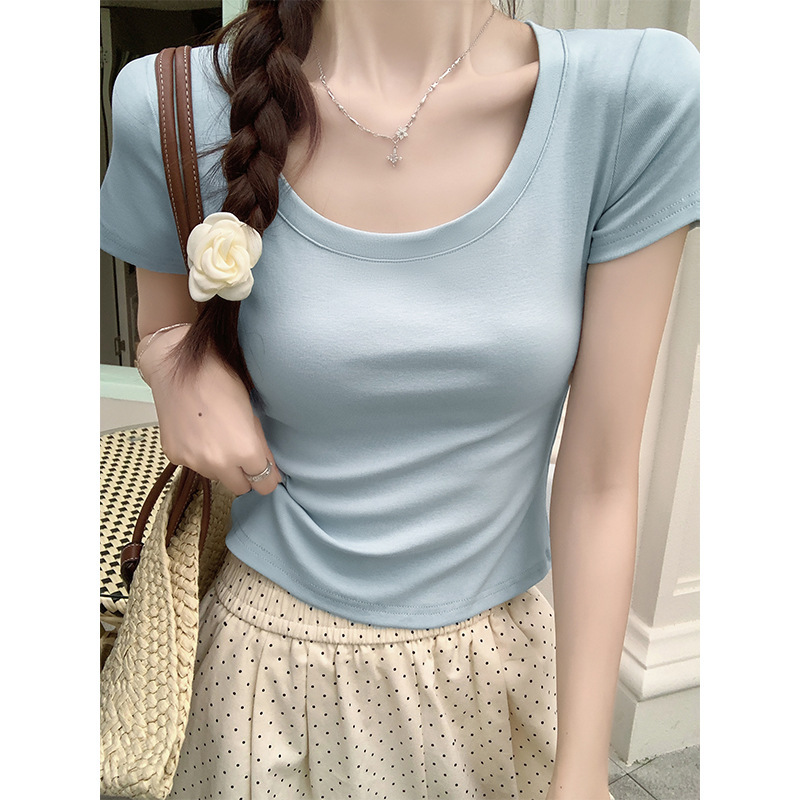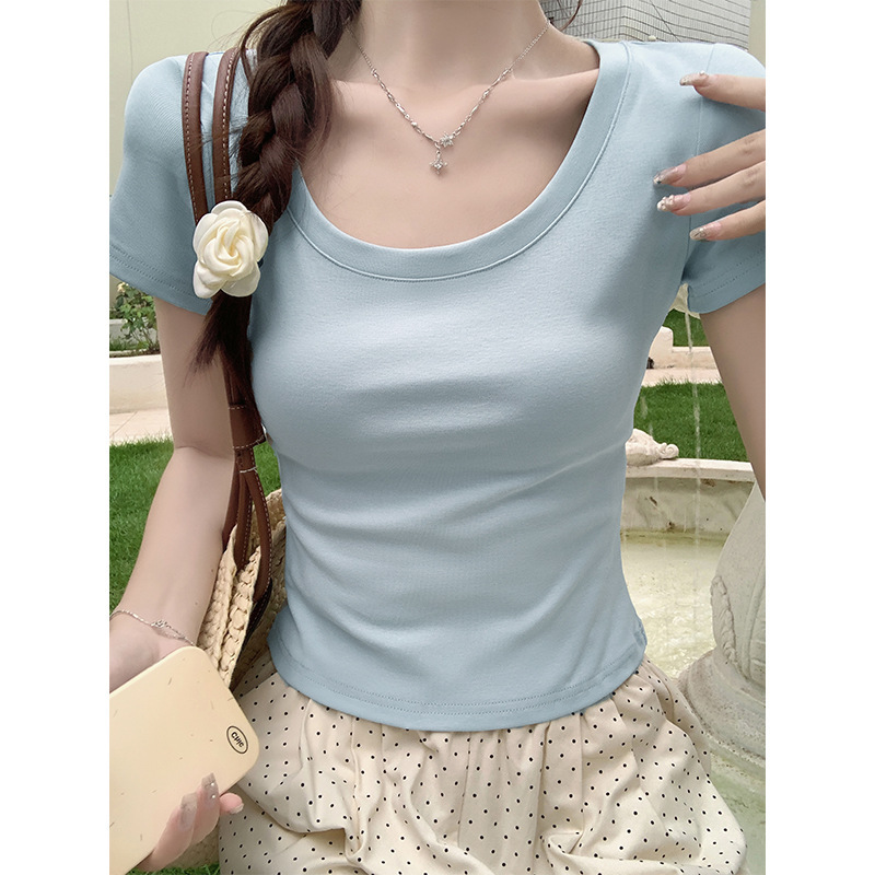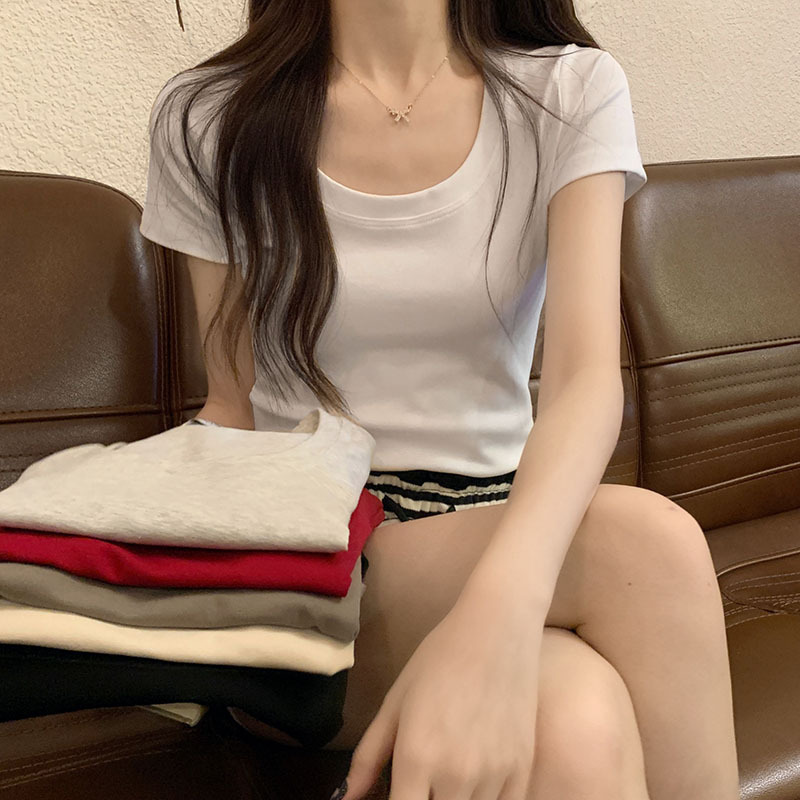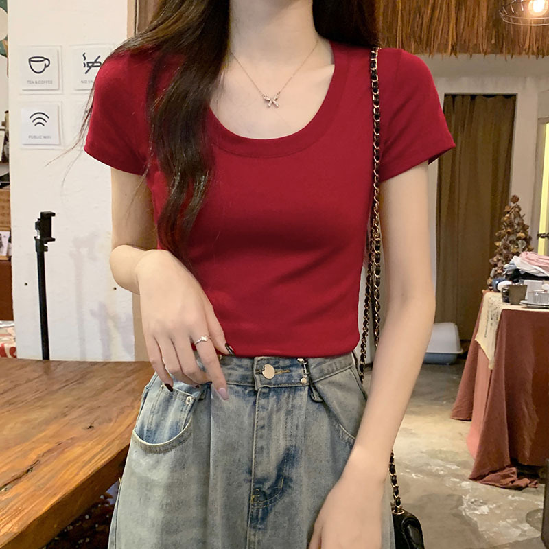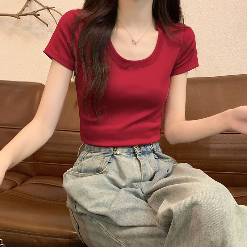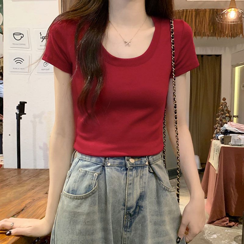 酒红色露锁骨短袖t恤女2025夏季新款修身低圆领正肩纯棉短款上衣