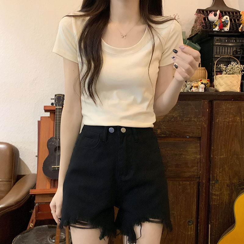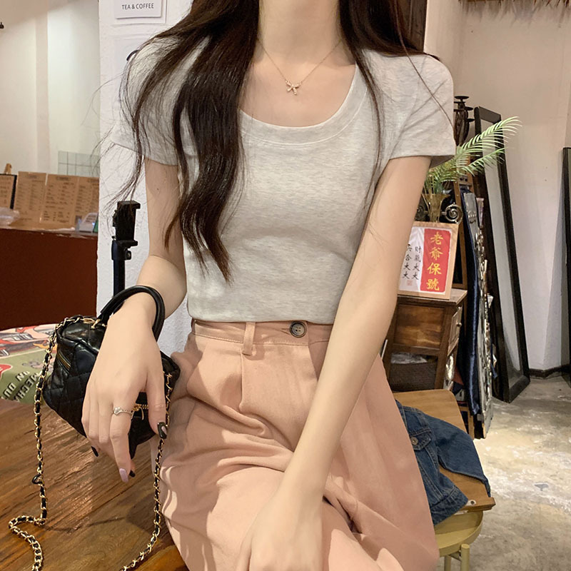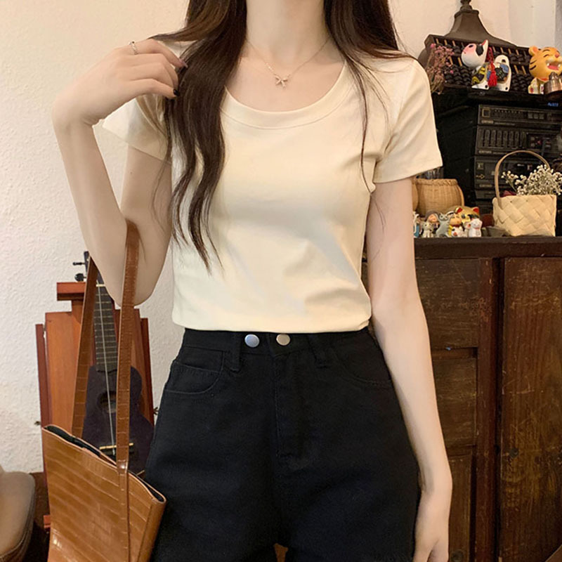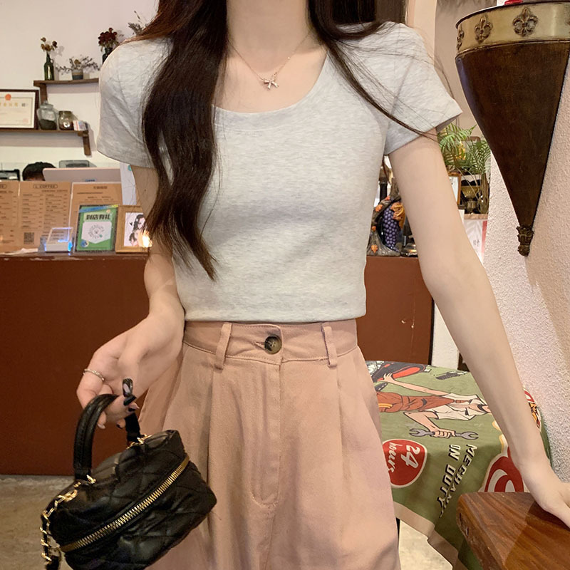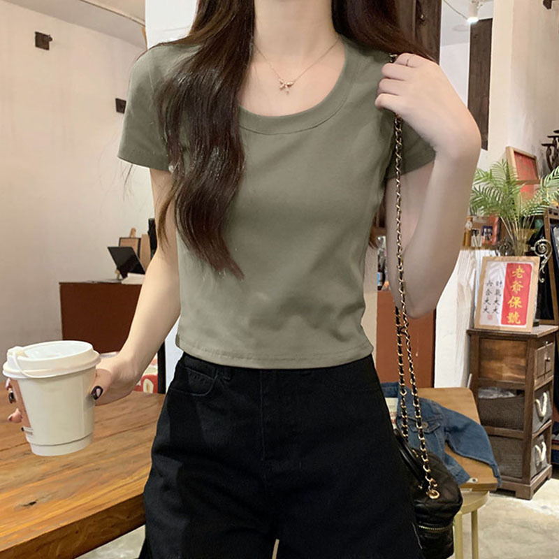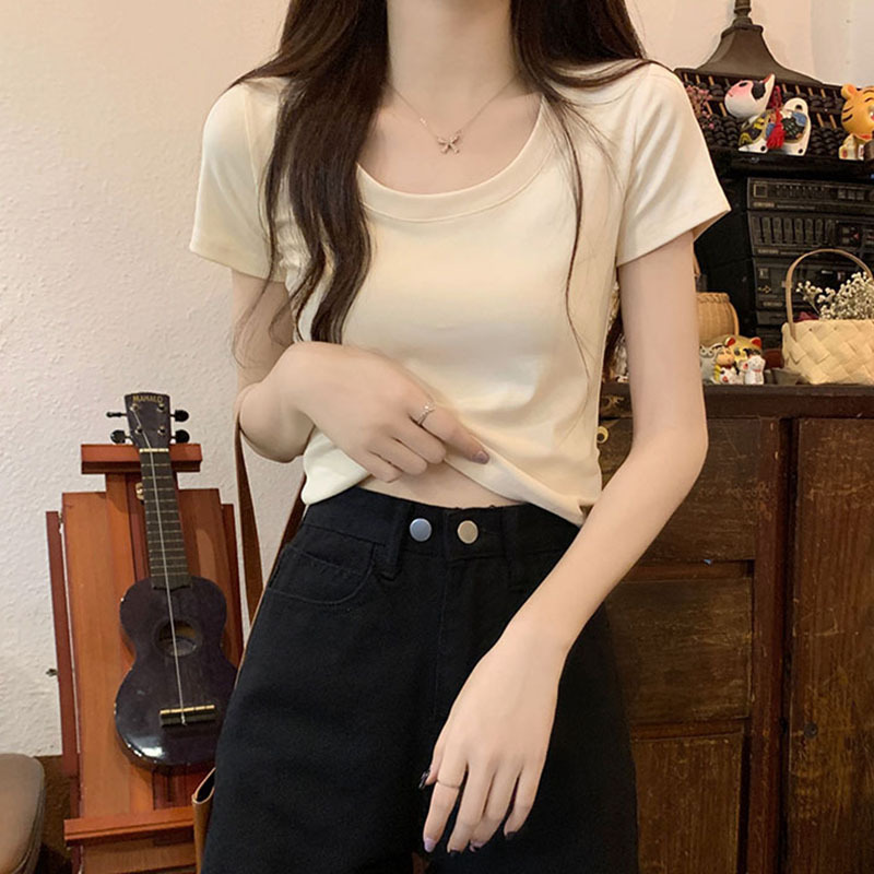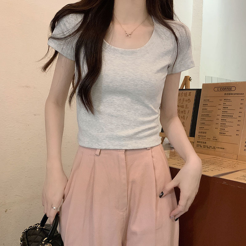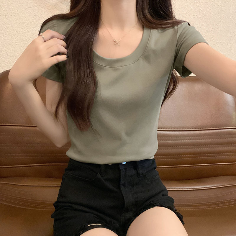 酒红色露锁骨短袖t恤女2025夏季新款修身低圆领正肩纯棉短款上衣