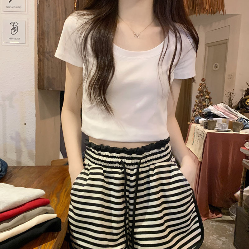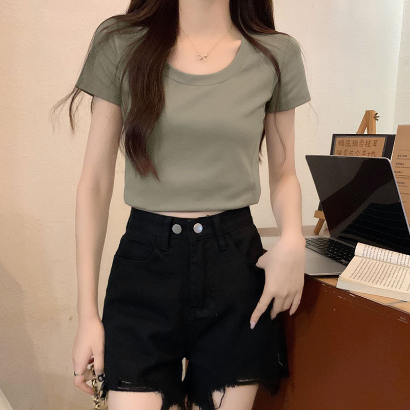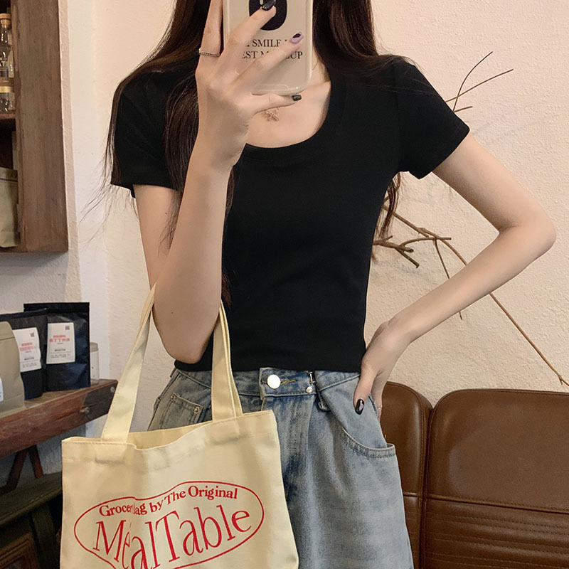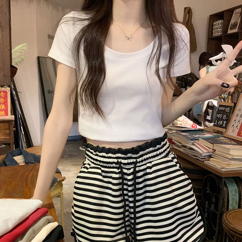 버건디 칼라 본 반팔 티셔츠 여성용 2025 년 여름 새로운 슬림 핏 로우 크루 넥 숄더 코튼 쇼트 탑
