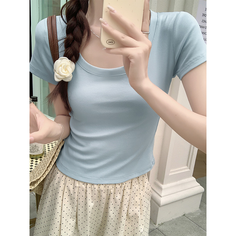 버건디 칼라 본 반팔 티셔츠 여성용 2025 년 여름 새로운 슬림 핏 로우 크루 넥 숄더 코튼 쇼트 탑스토어 가기