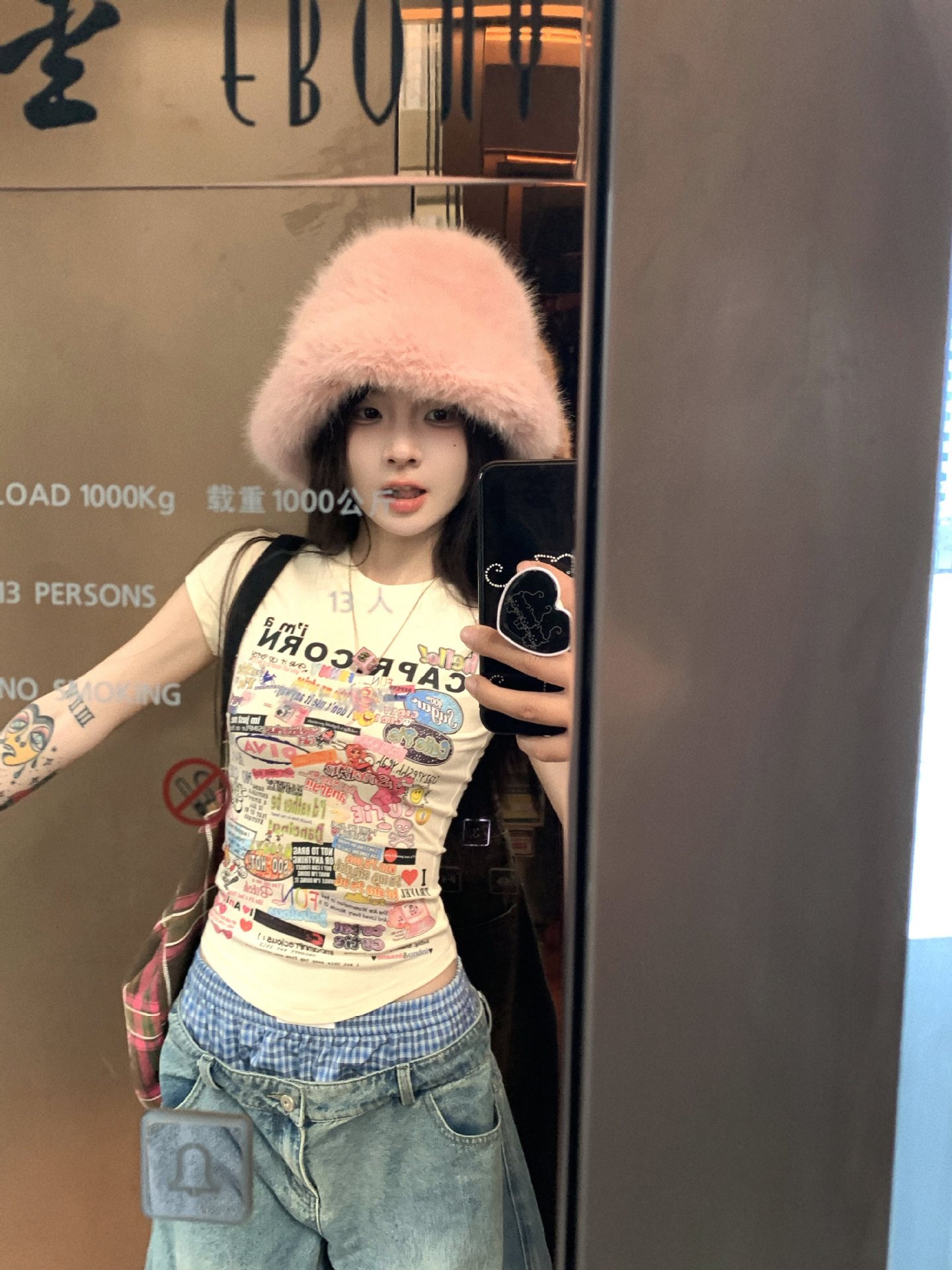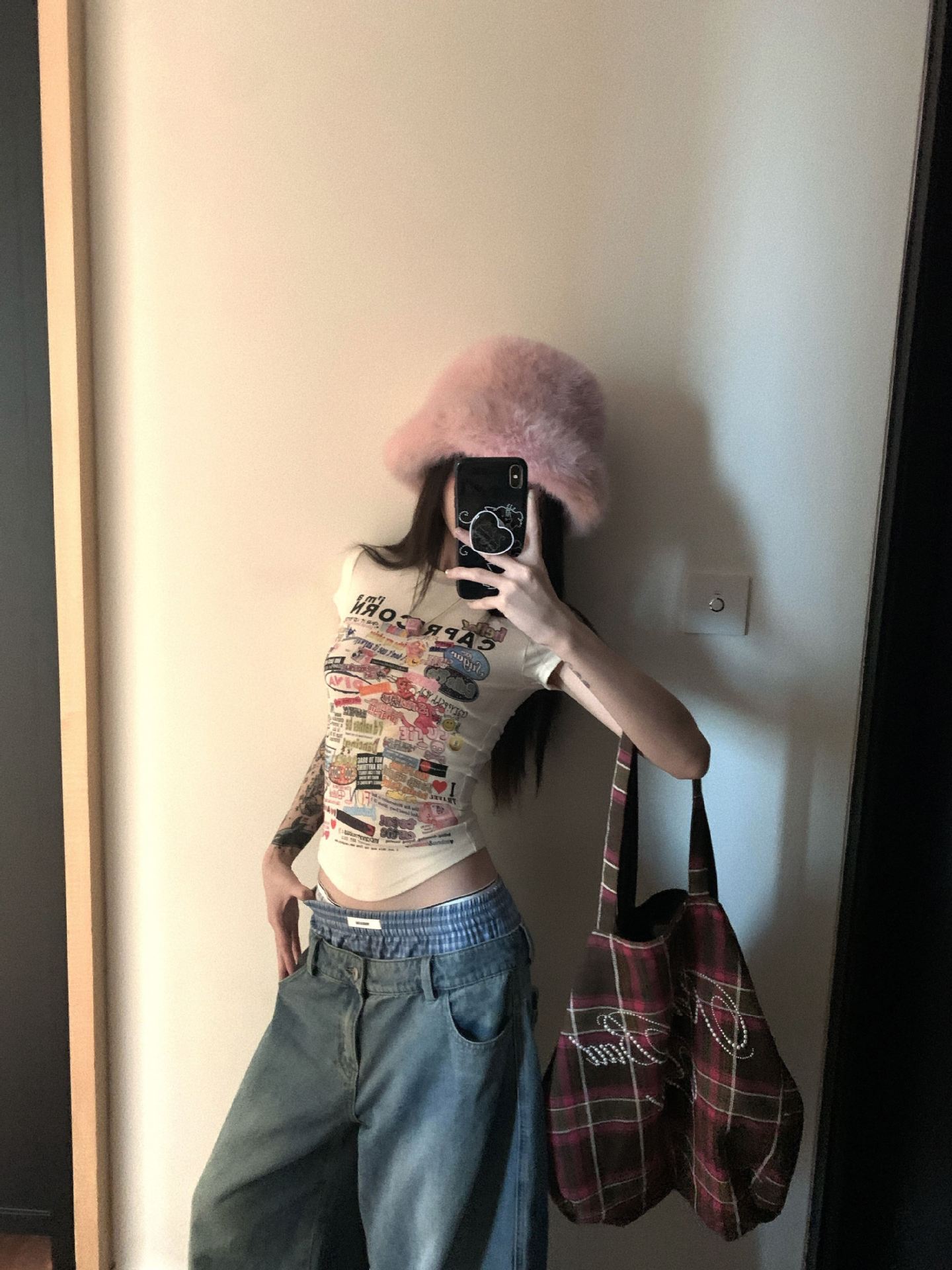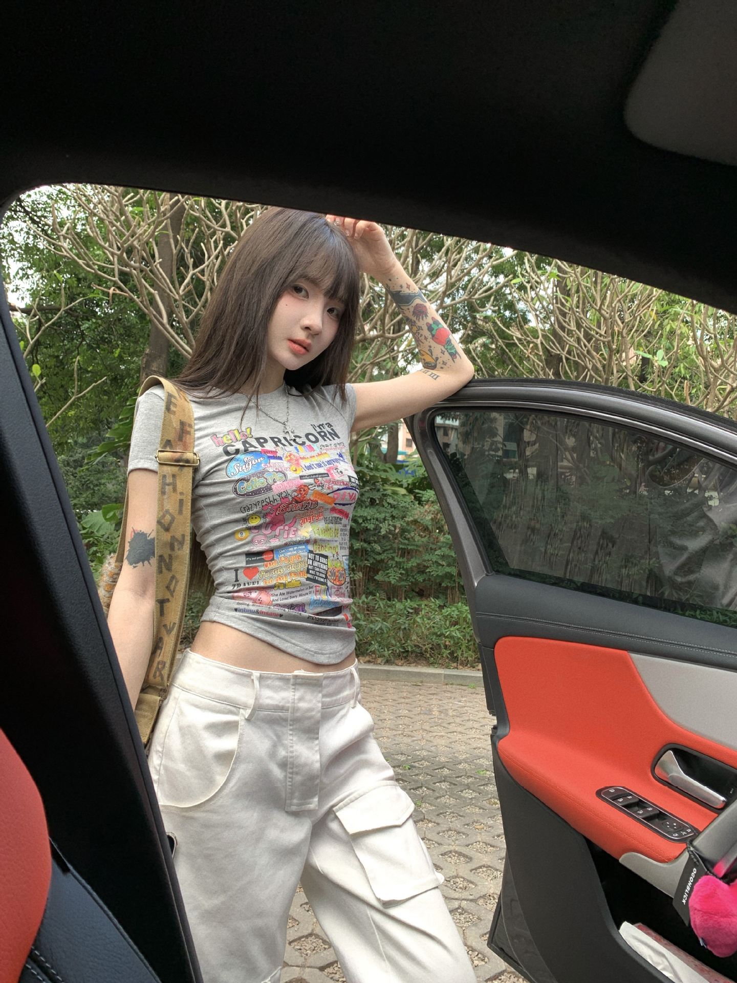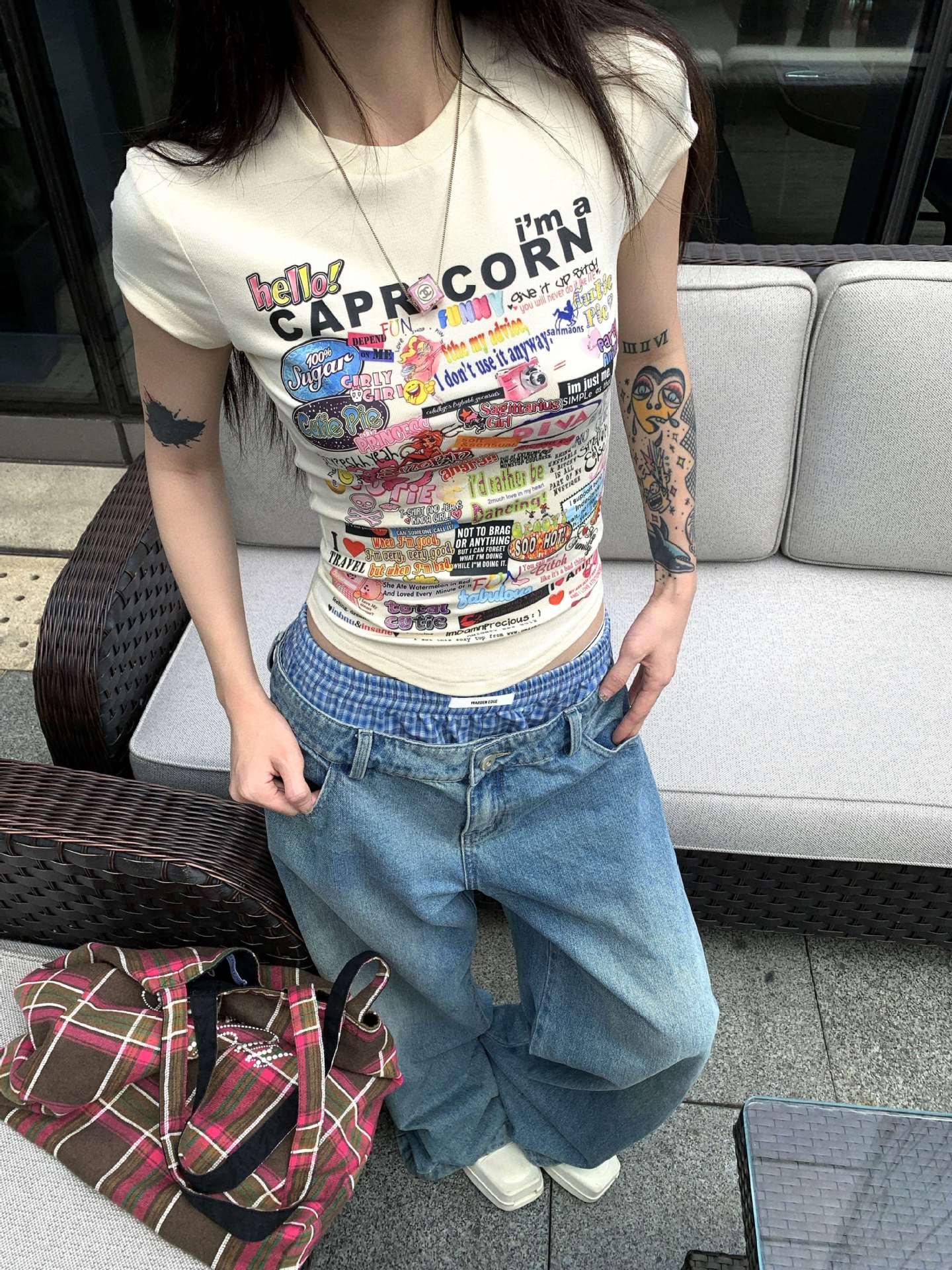 아메리칸 스타일 핫 걸 만화 인쇄 라운드 넥 반팔 티셔츠 여성 여름 2025 새로운 도착 슬림 핏 타이트 허리 쇼트 탑 트렌디스토어 가기