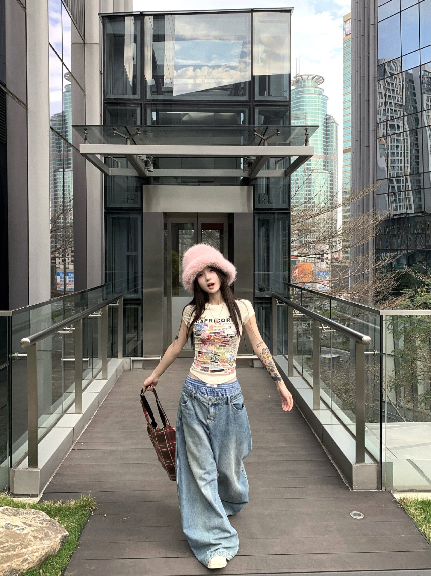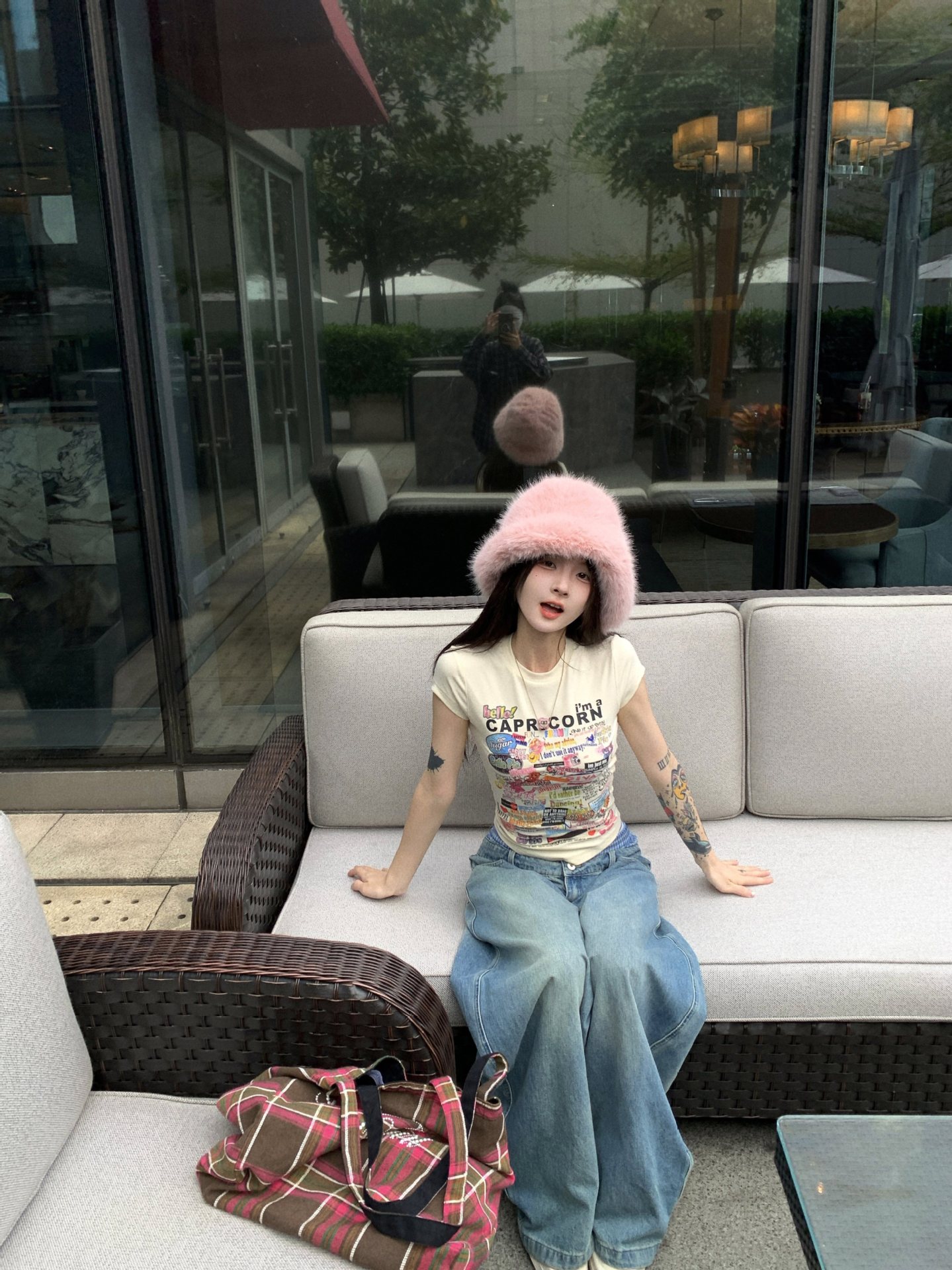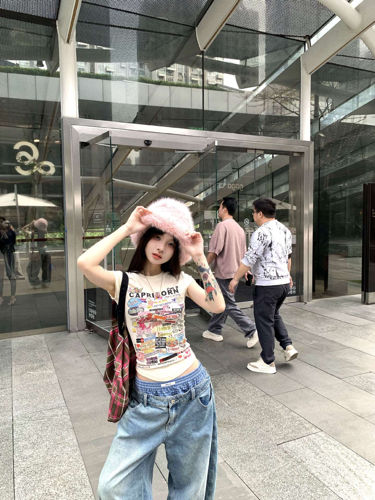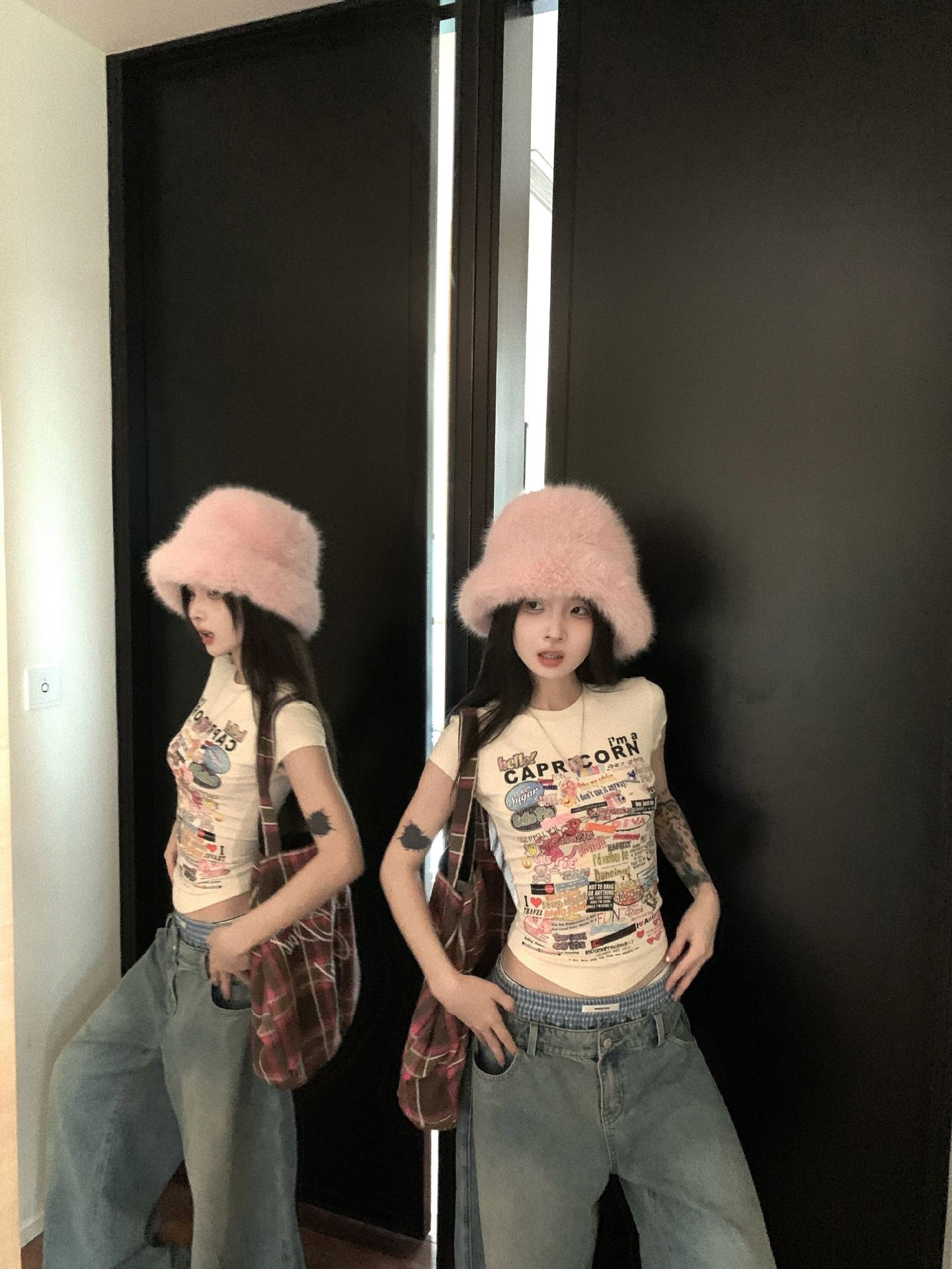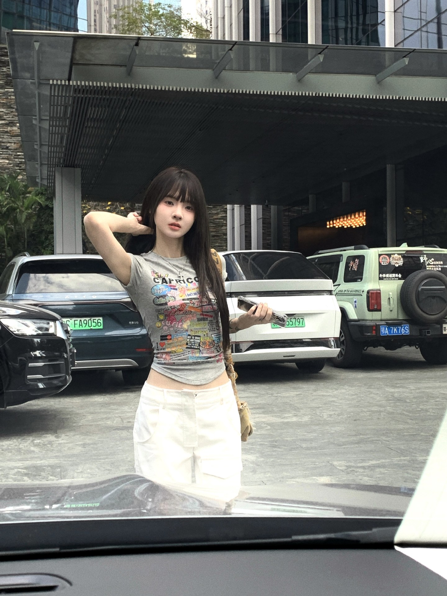 아메리칸 스타일 핫 걸 만화 인쇄 라운드 넥 반팔 티셔츠 여성 여름 2025 새로운 도착 슬림 핏 타이트 허리 쇼트 탑 트렌디스토어 가기