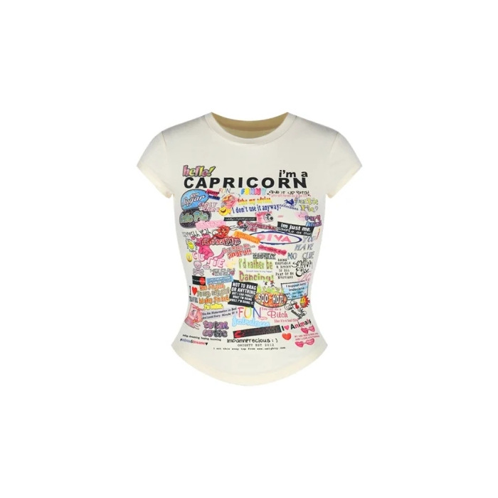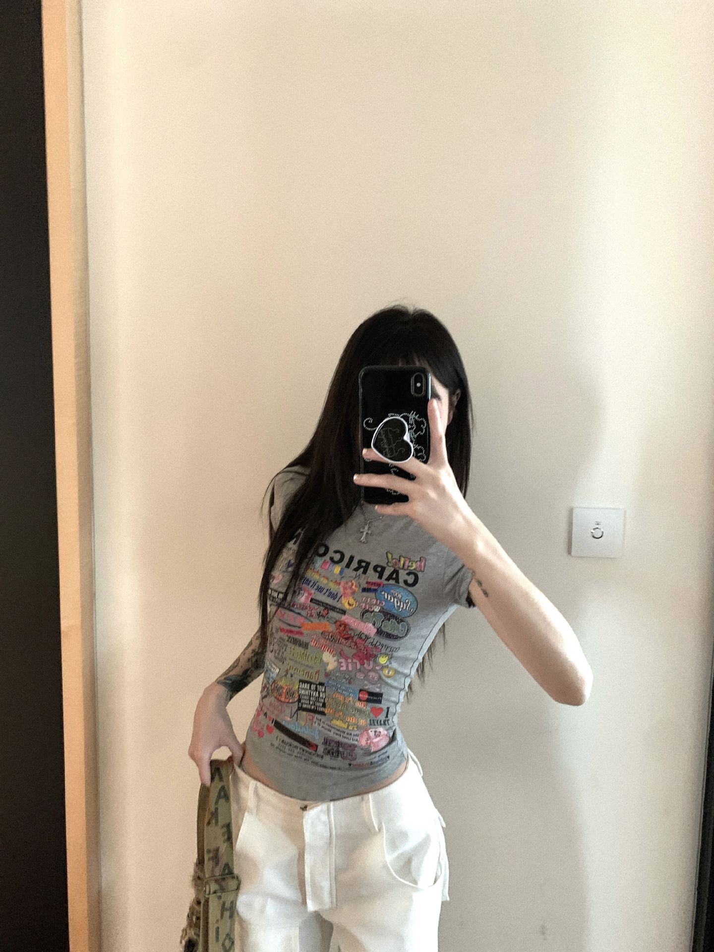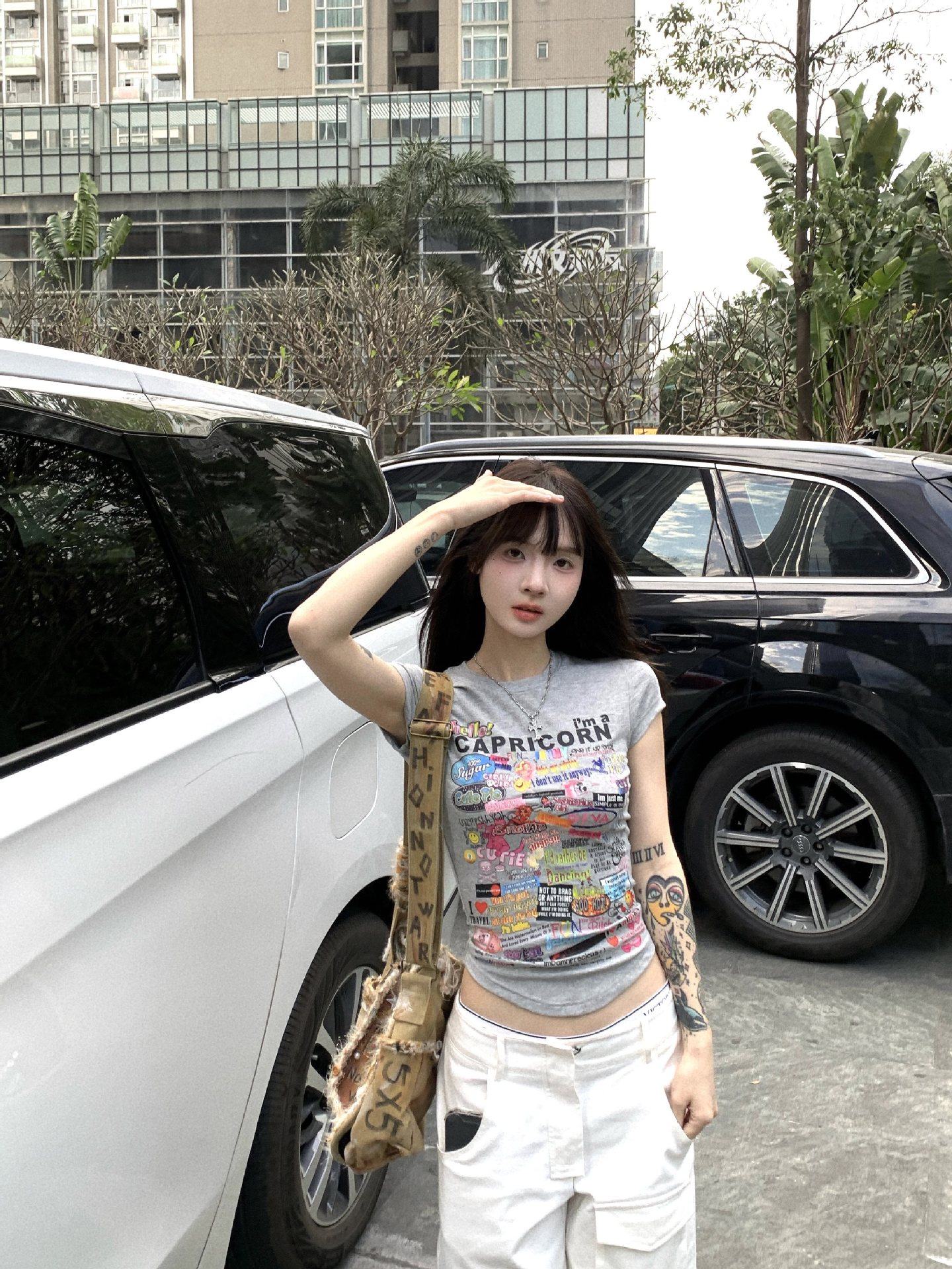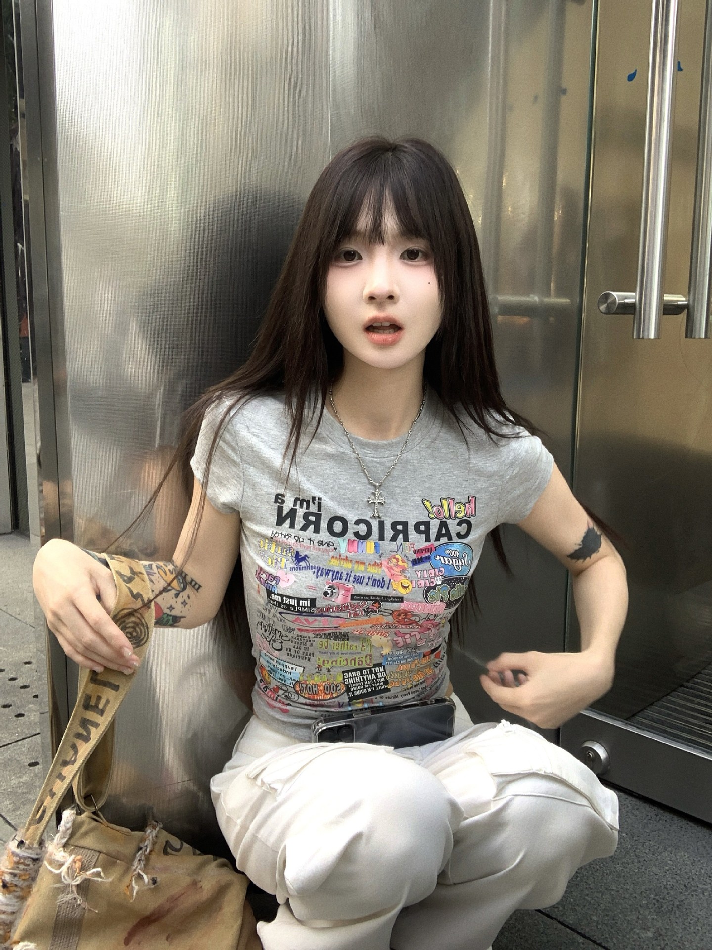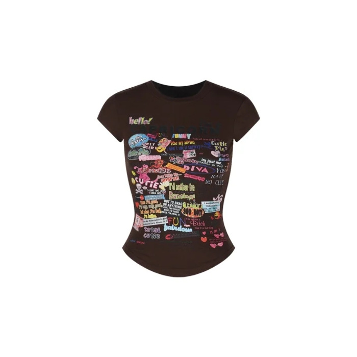 아메리칸 스타일 핫 걸 만화 인쇄 라운드 넥 반팔 티셔츠 여성 여름 2025 새로운 도착 슬림 핏 타이트 허리 쇼트 탑 트렌디
