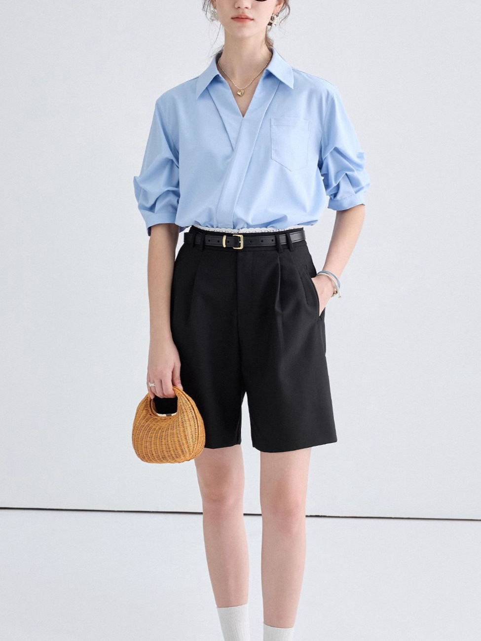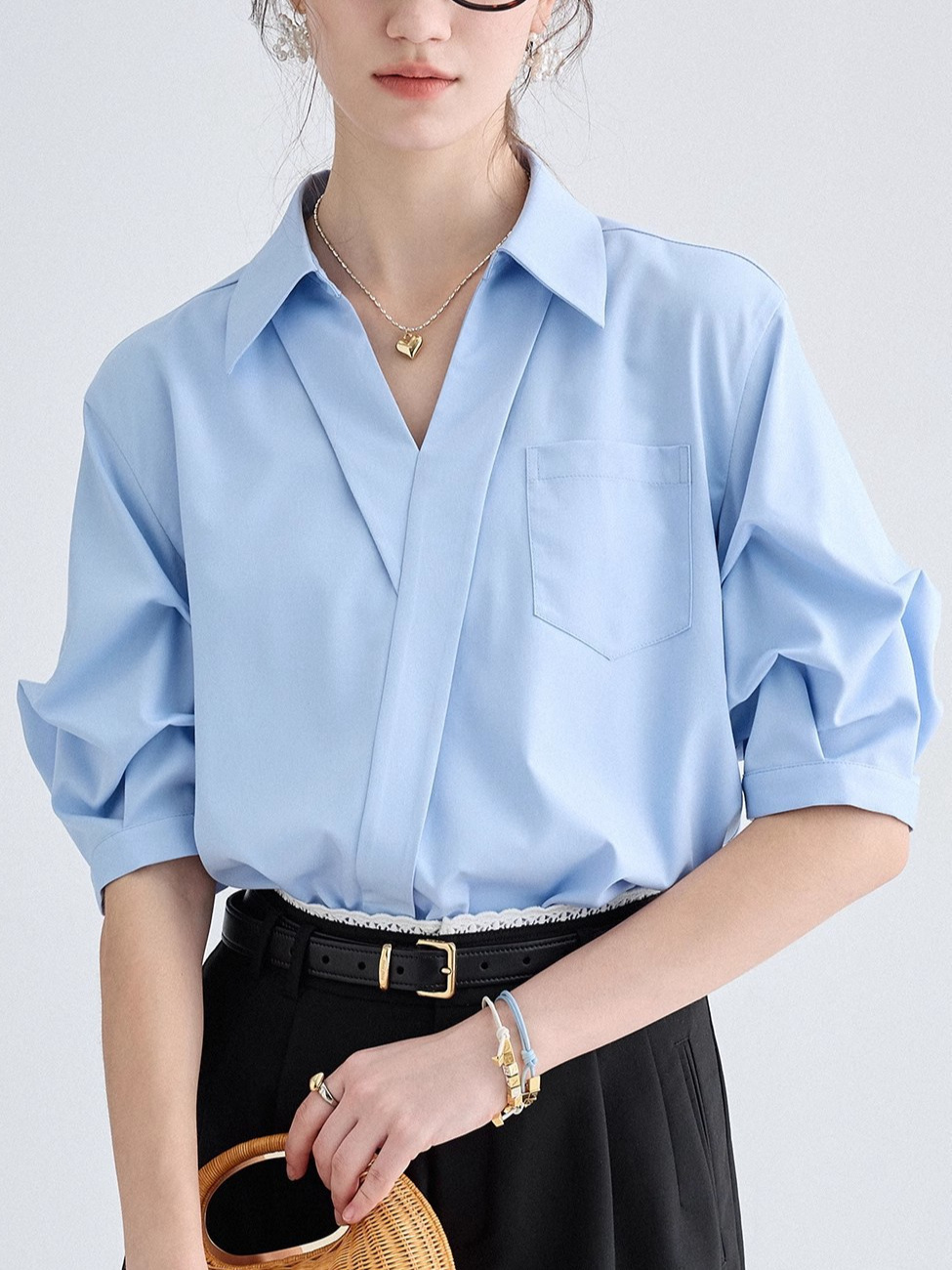 VEGA 화이트 셔츠 여성 2025 년 여름 새로운 캐주얼 루즈 프로 프랑스 틈새 최고 V-넥 짧은 소매 라이닝
