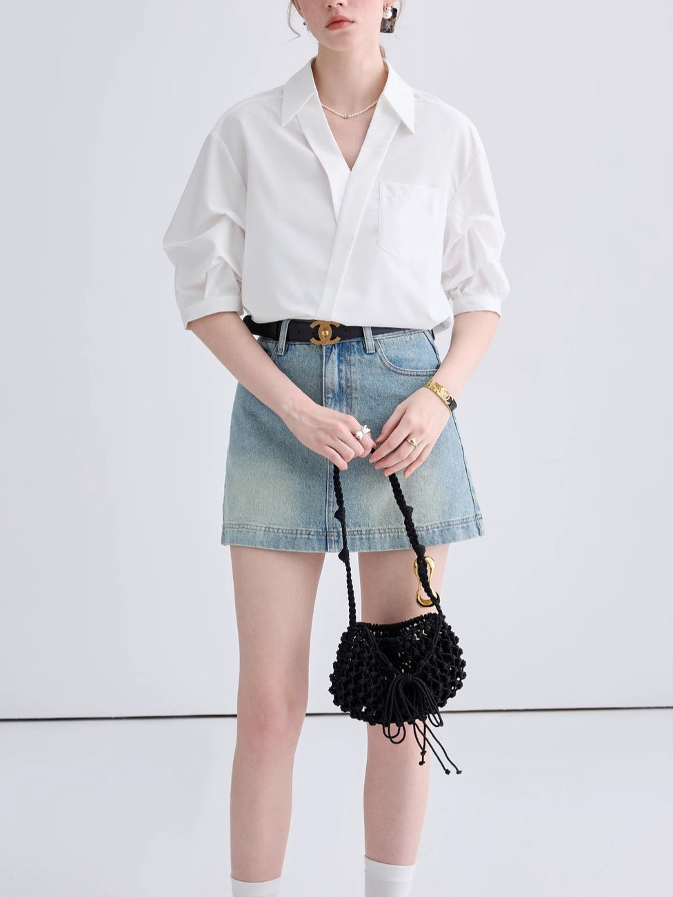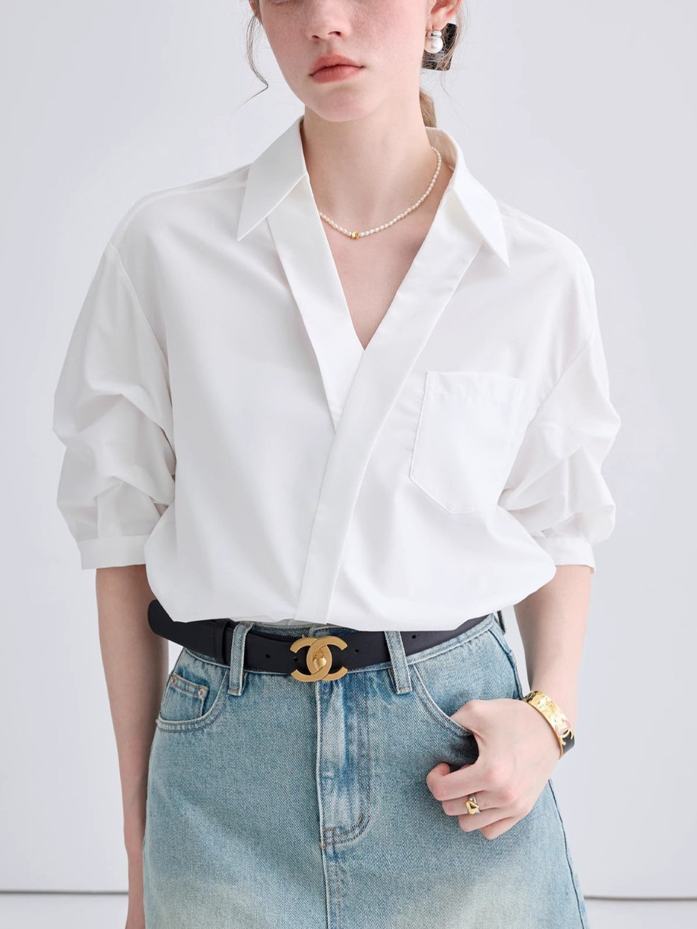 VEGA 화이트 셔츠 여성 2025 년 여름 새로운 캐주얼 루즈 프로 프랑스 틈새 최고 V-넥 짧은 소매 라이닝스토어 가기