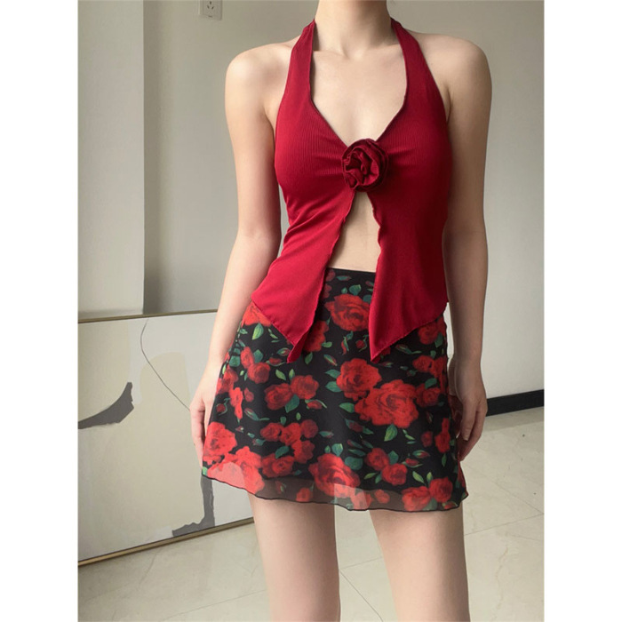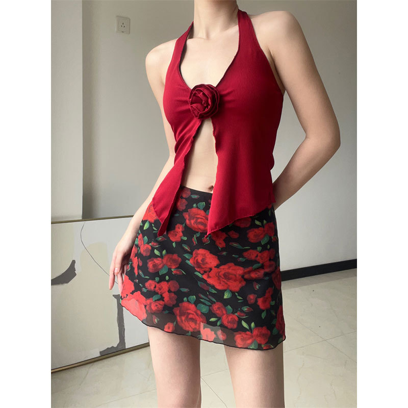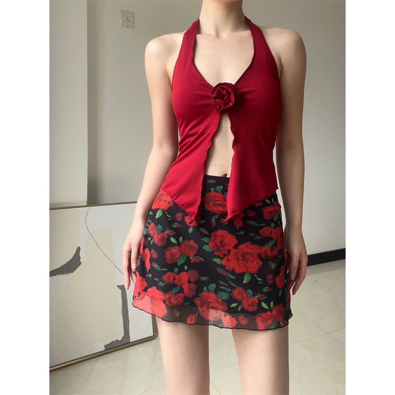 Chenling [슈퍼 배수 모델] 여름 신작 레트로 로즈 프린트 메쉬 스커트 하이 웨이스트 힙 커버 짧은 스커트
