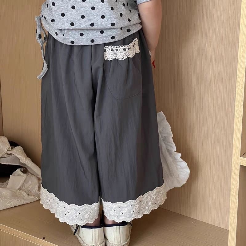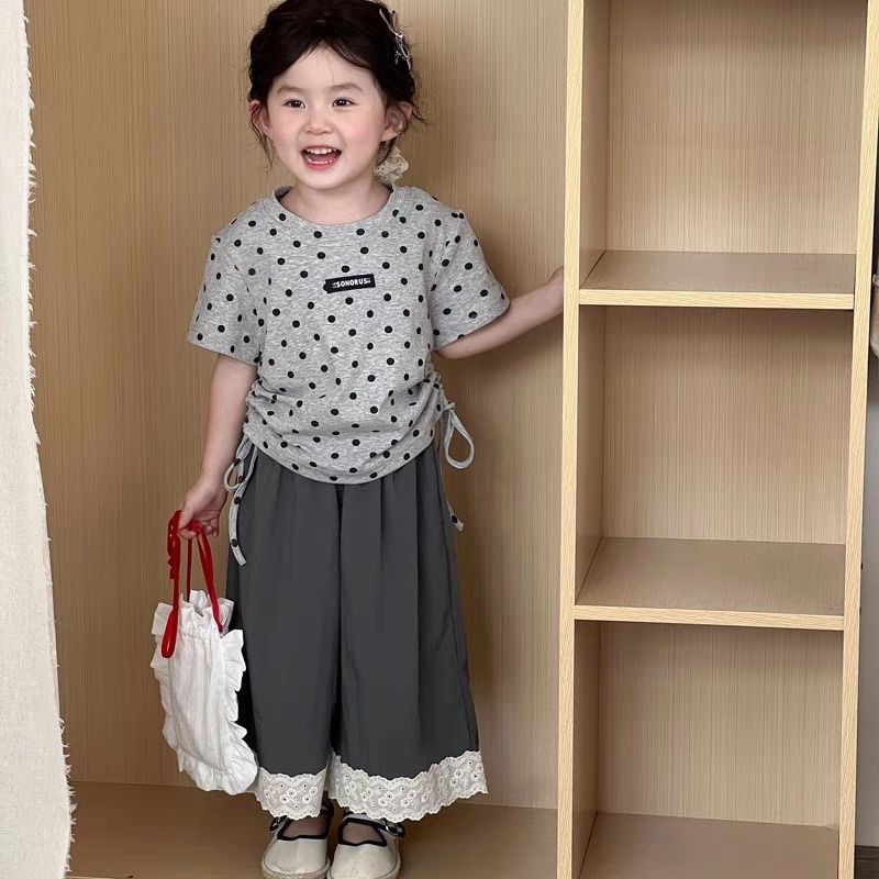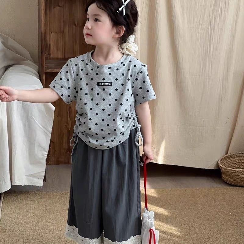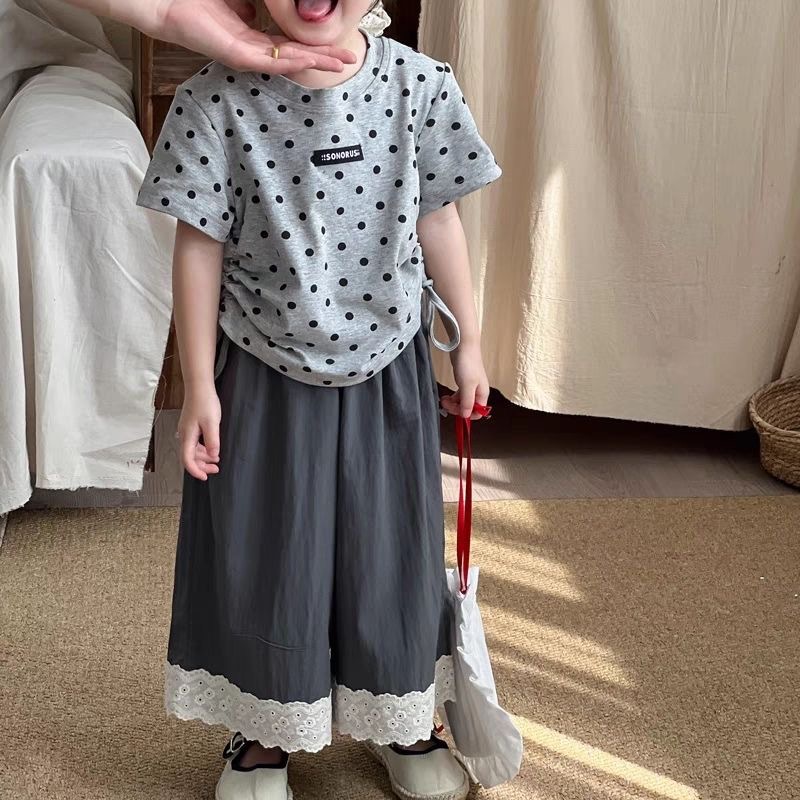 여자 여름 반팔 2025 새로운 여성 보물 반소매 최고 올매치 레이스 스트레이트 바지 어린이 봄 투피스 세트