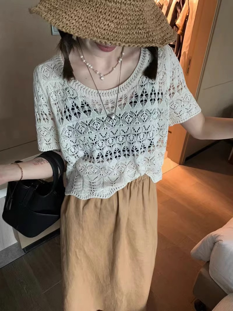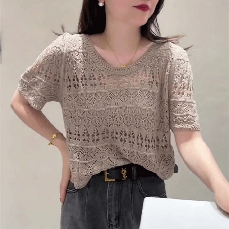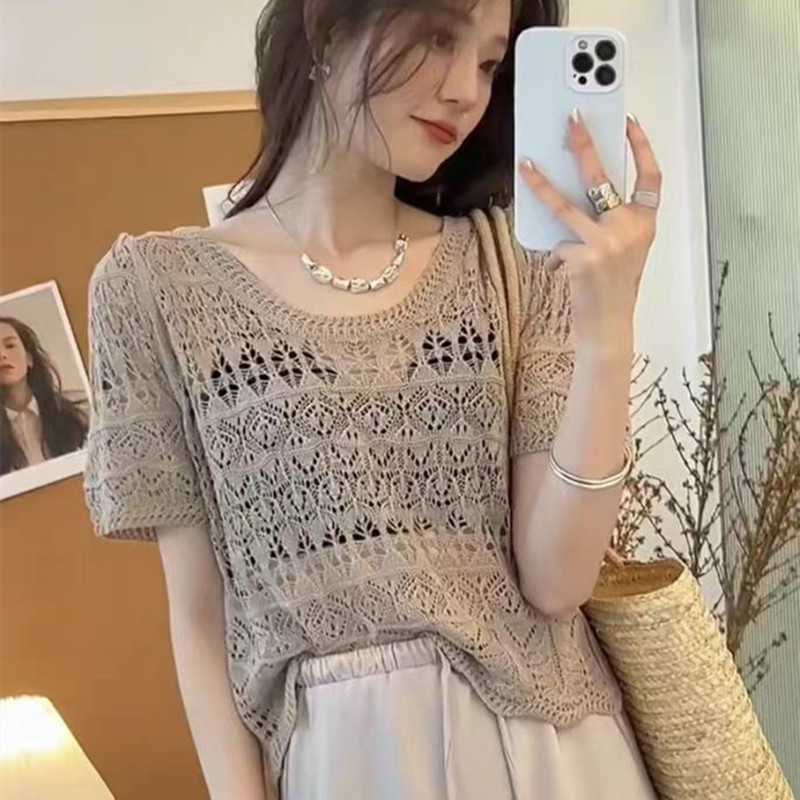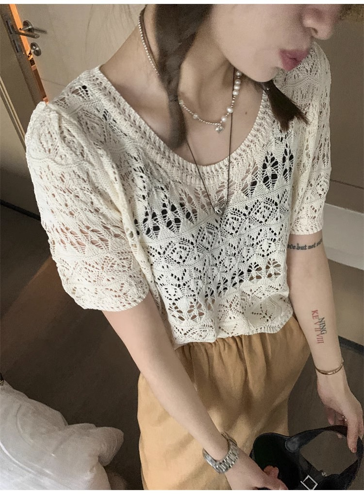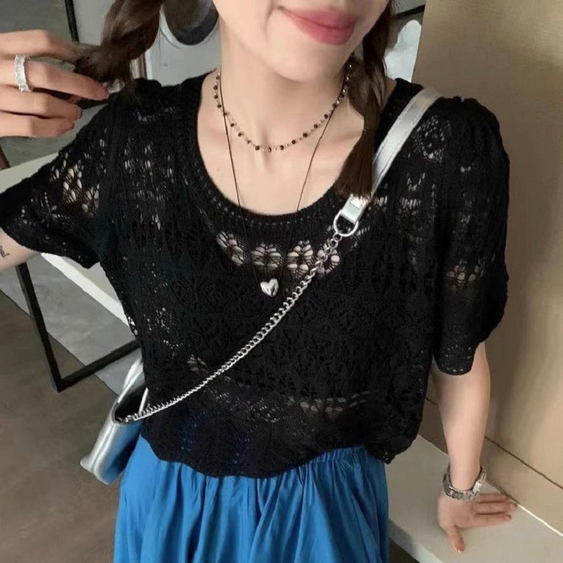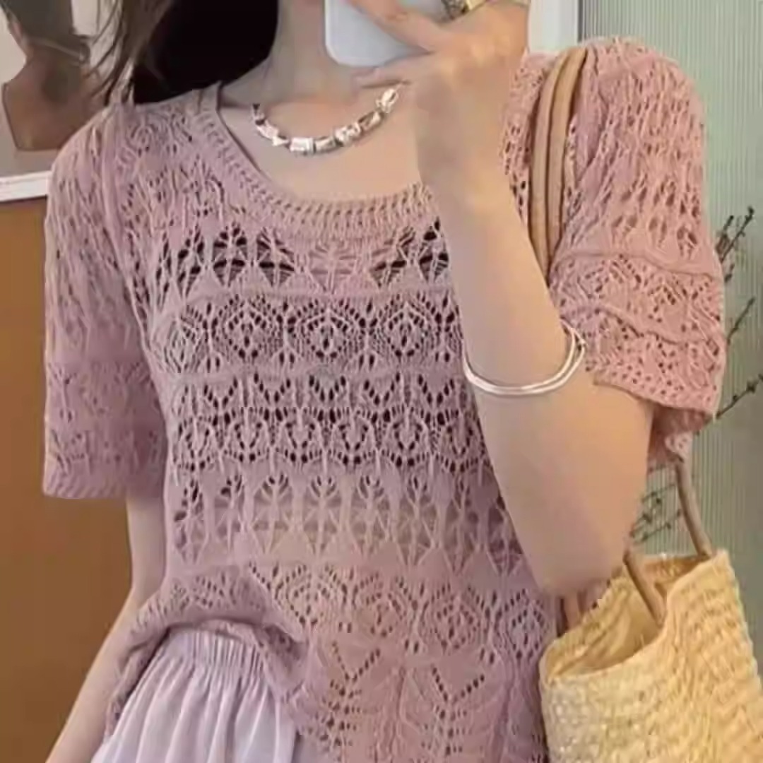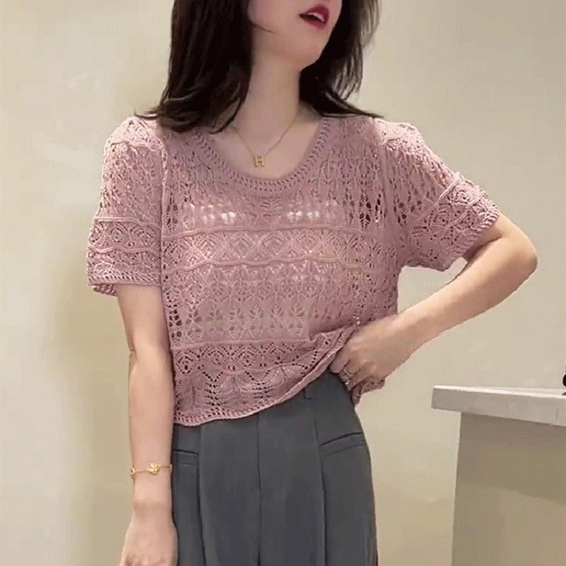 여름 달콤한 소녀 스타일 크로 셰 뜨개질 반팔 얇은 니트 스웨터 신선한 외부 할로우 아웃 블라우스 크루 넥 쇼트 탑