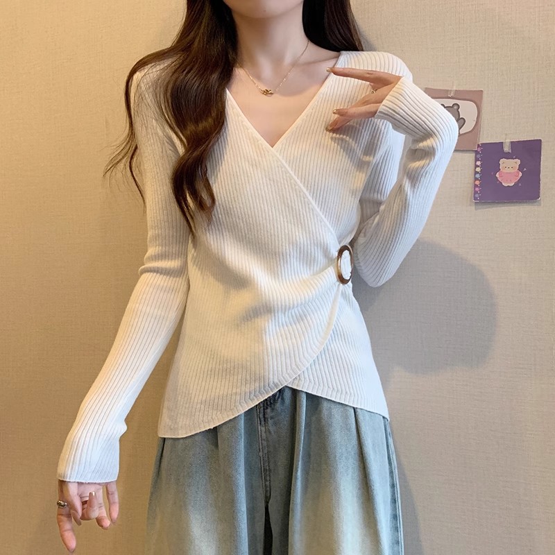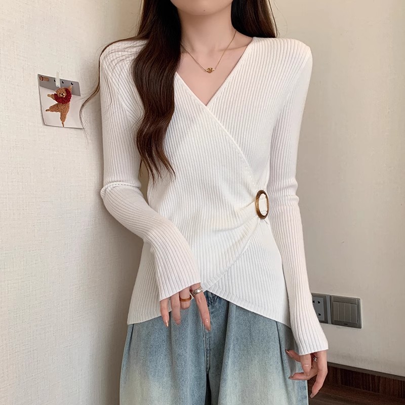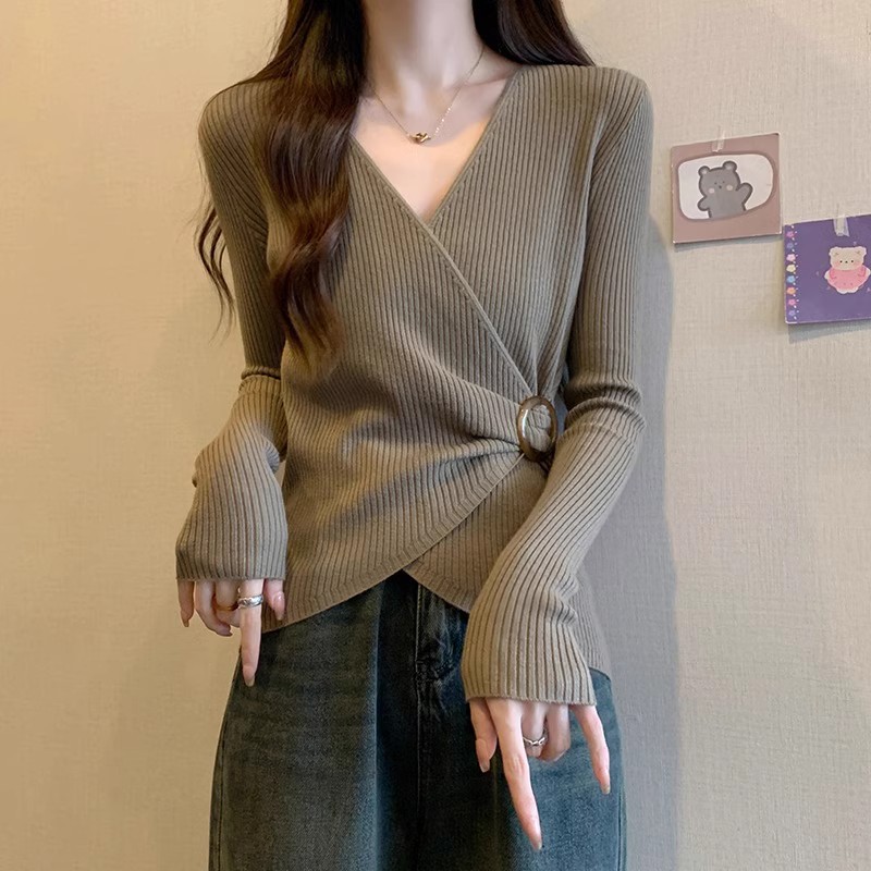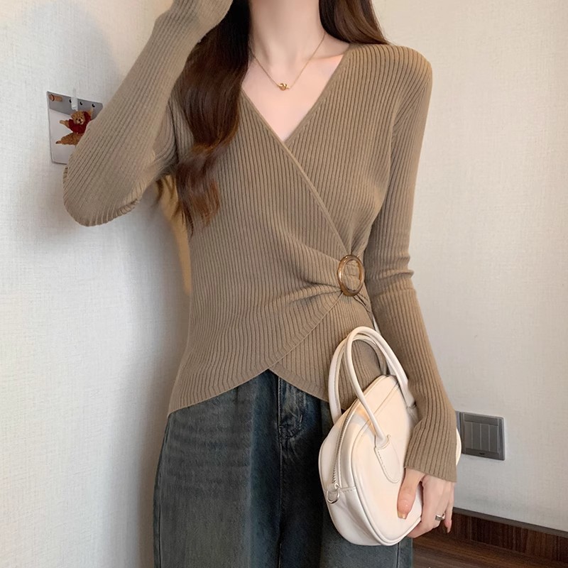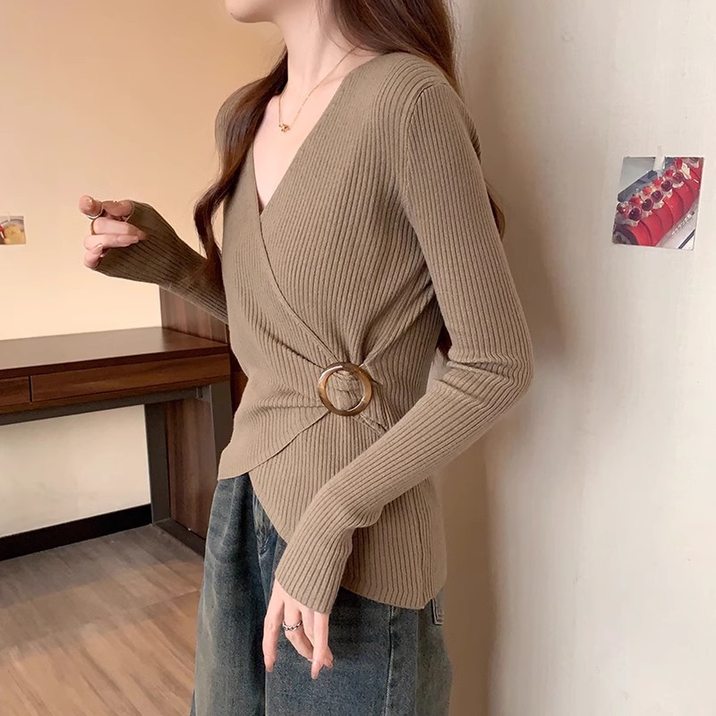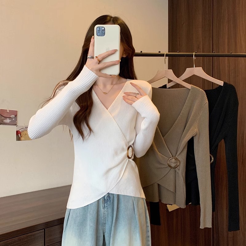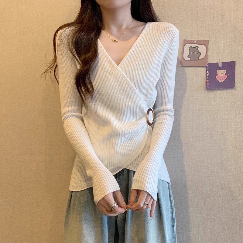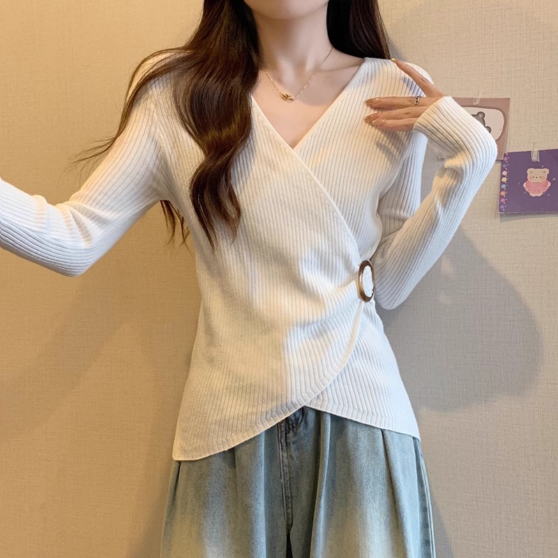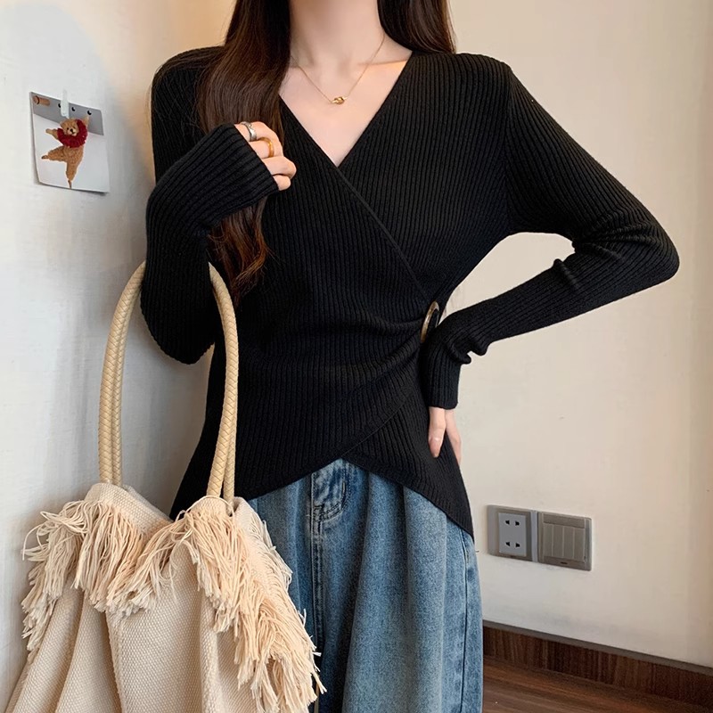 가을 겨울 슬림핏 허리 짧은 브이넥 니트 바닥 셔츠 탑 디자인 틈새 긴팔 스웨터 여성용
