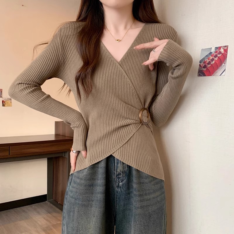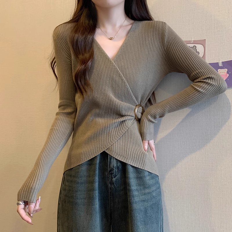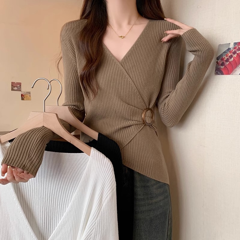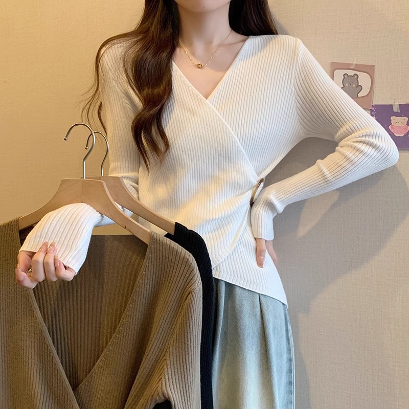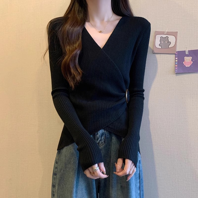 가을 겨울 슬림핏 허리 짧은 브이넥 니트 바닥 셔츠 탑 디자인 틈새 긴팔 스웨터 여성용스토어 가기