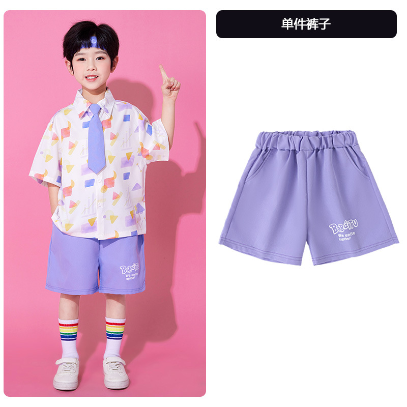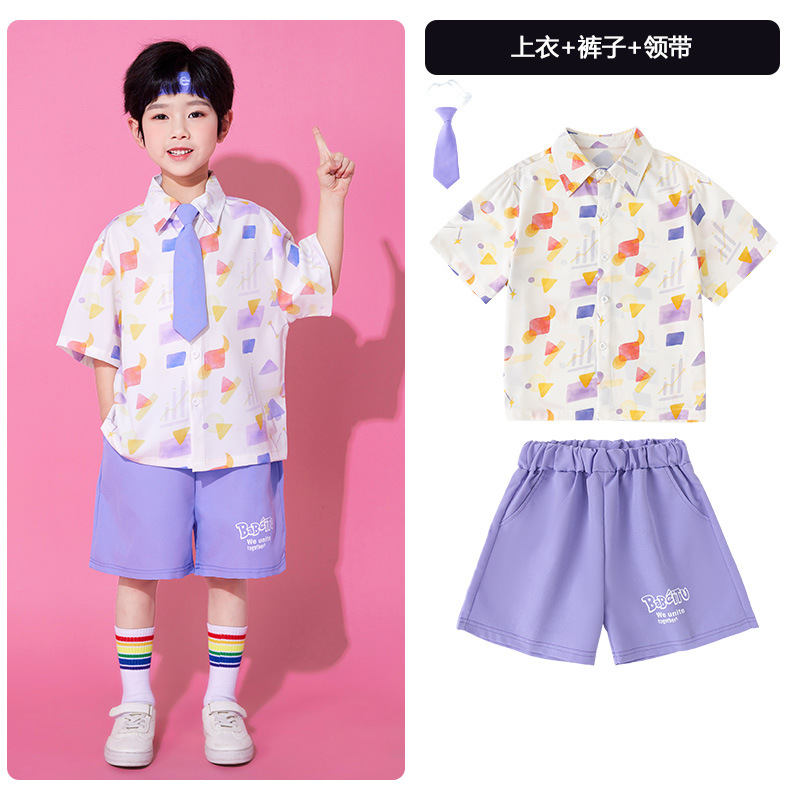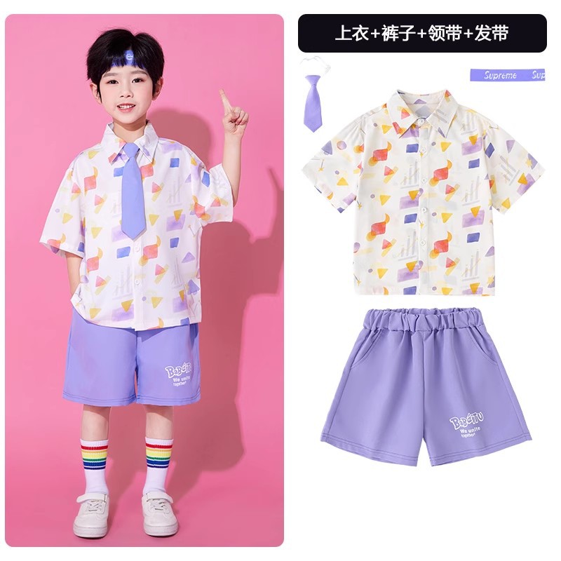 • A502 보라색 기하학 셔츠 + A512 보라색 반바지 + 보라색 넥타이 + 보라색 S 머리띠