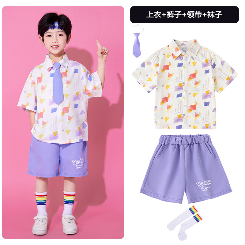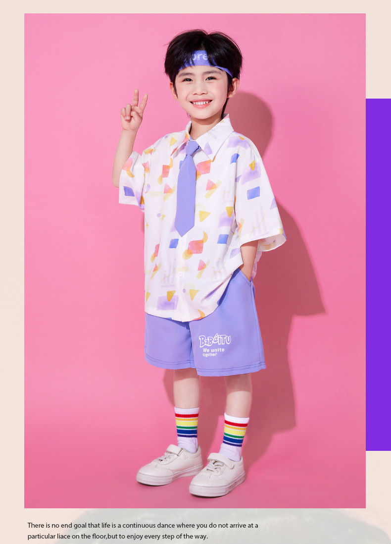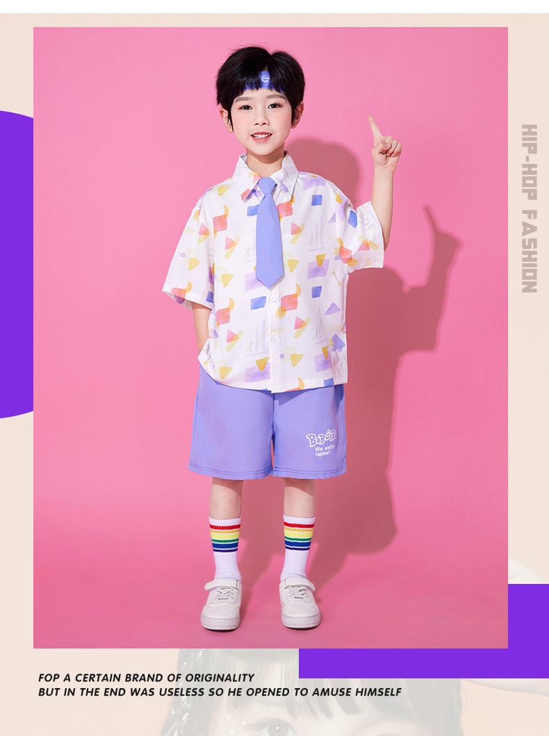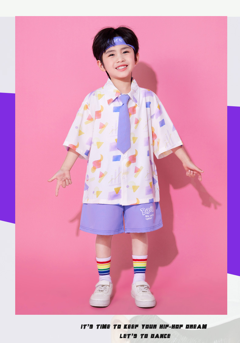 • A502 보라색 기하학 셔츠 + A512 보라색 반바지 + 보라색 넥타이 + 무지개 튜브 양말