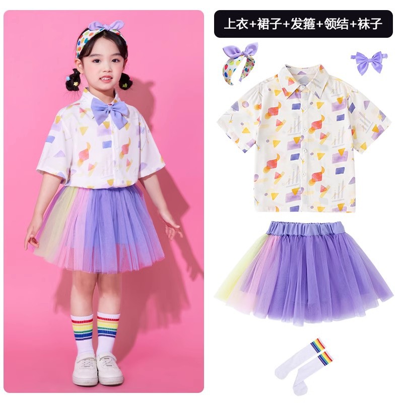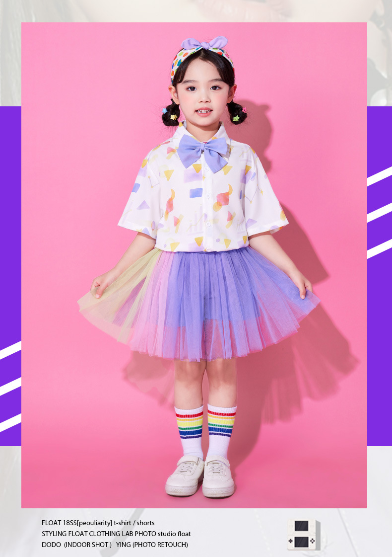 • A502 보라색 기하학 셔츠 + Q12 보라색 배색 거즈 스커트 + 보라색 나비넥타이 + 무지개 튜브 양말