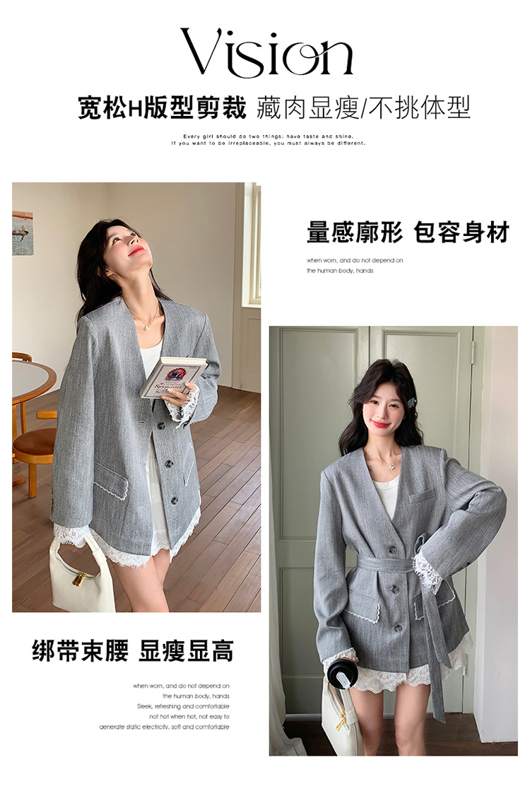 리얼 샷 레이스 스티칭 그레이 캐주얼 세트 재킷 여성 봄 2025 새로운 하이 엔드 센스 루즈 패션 세트스토어 가기