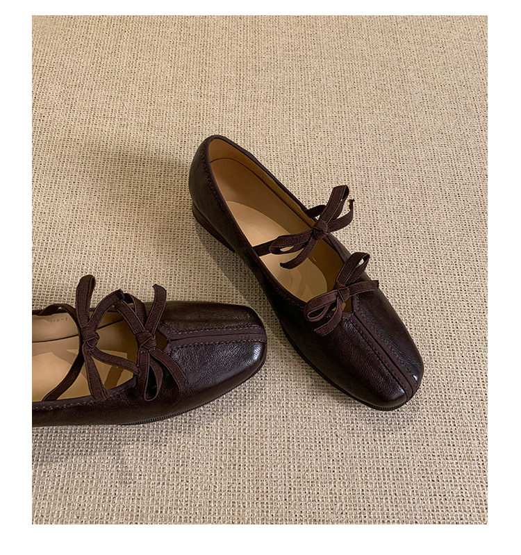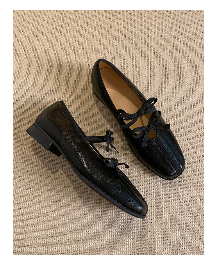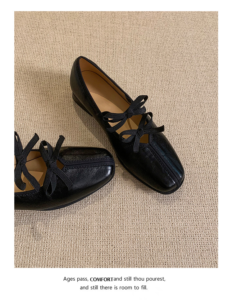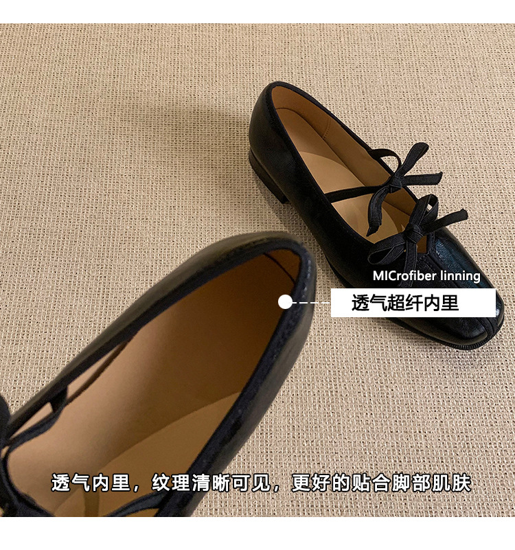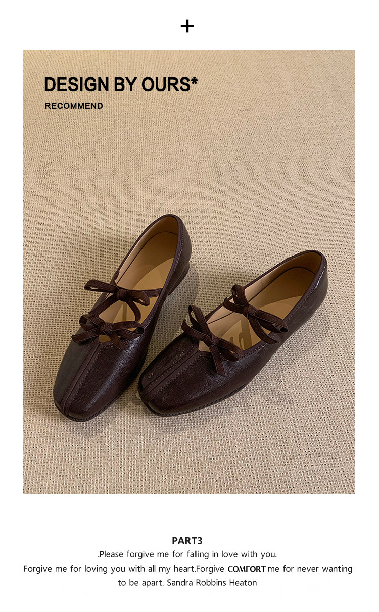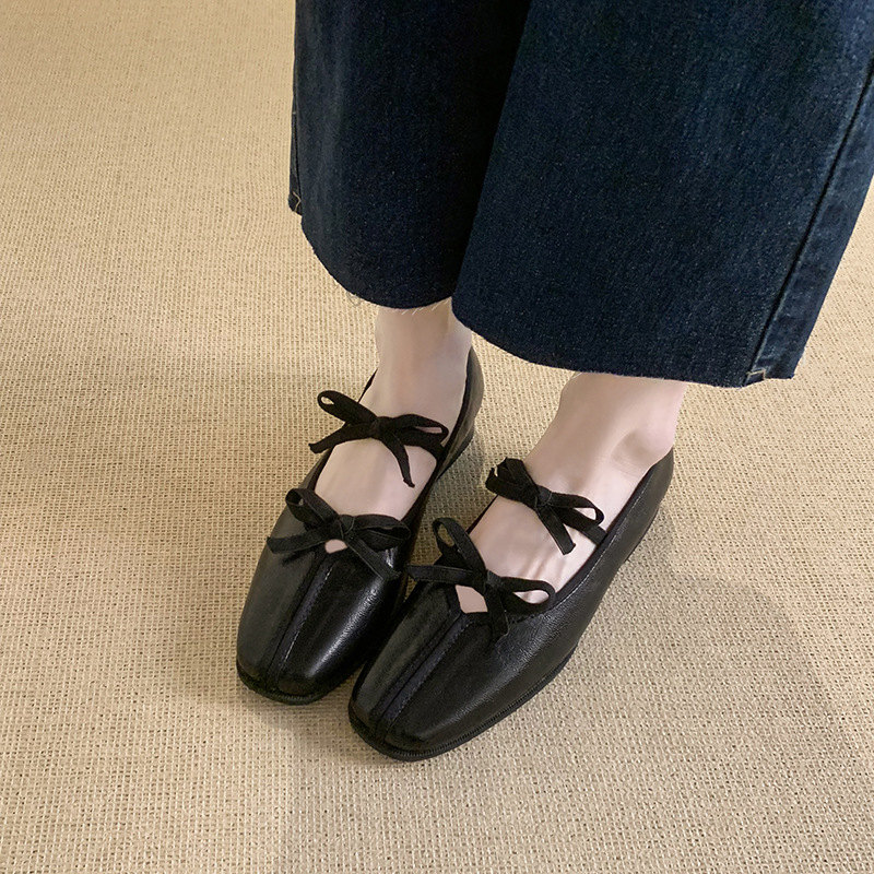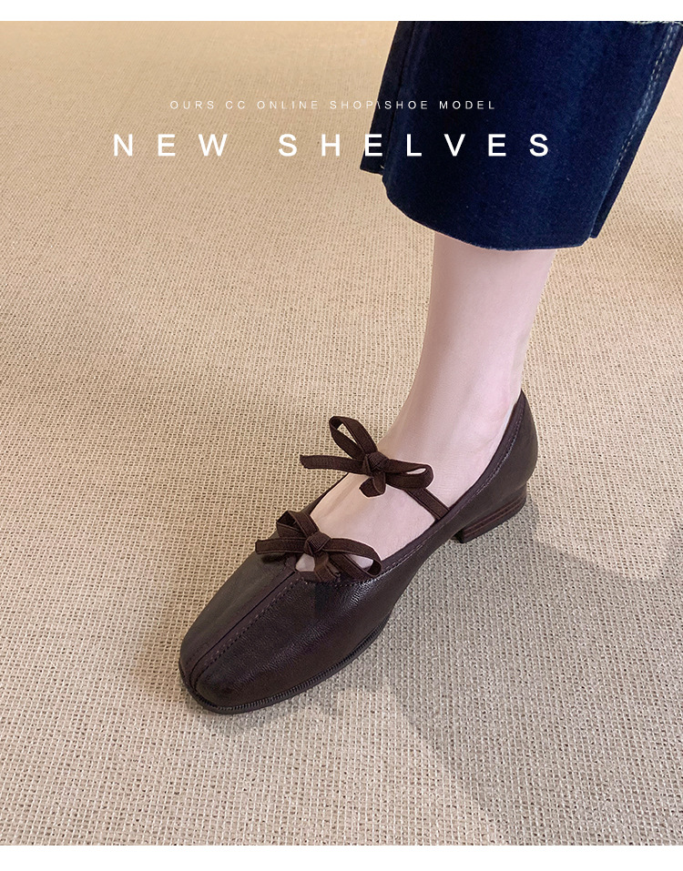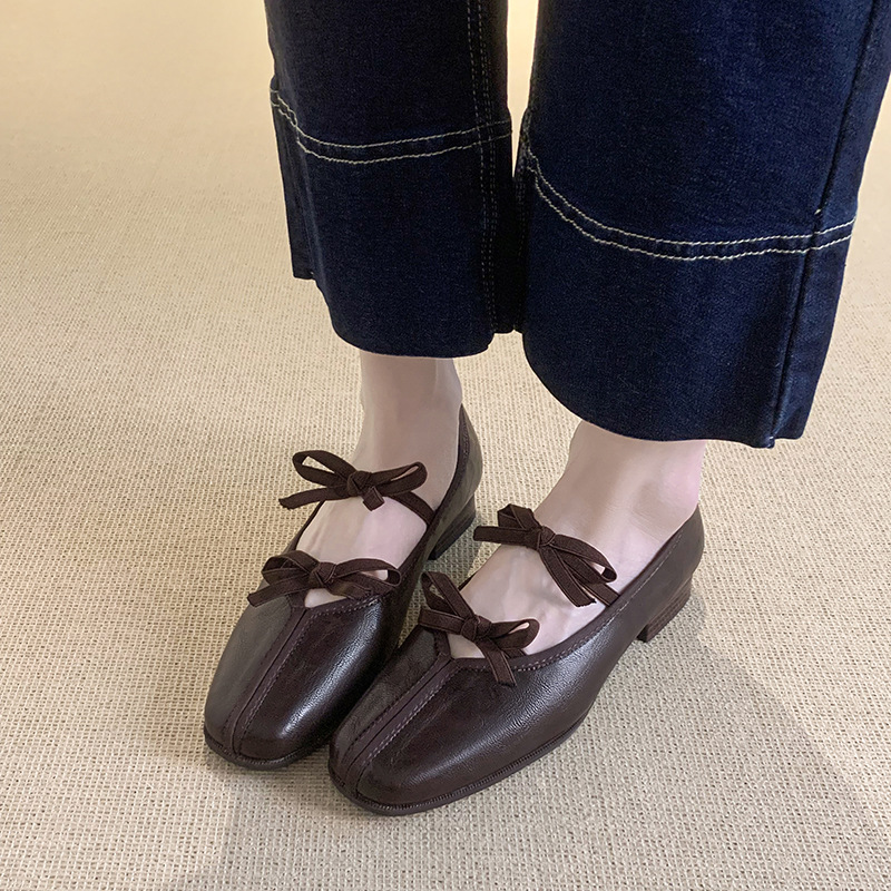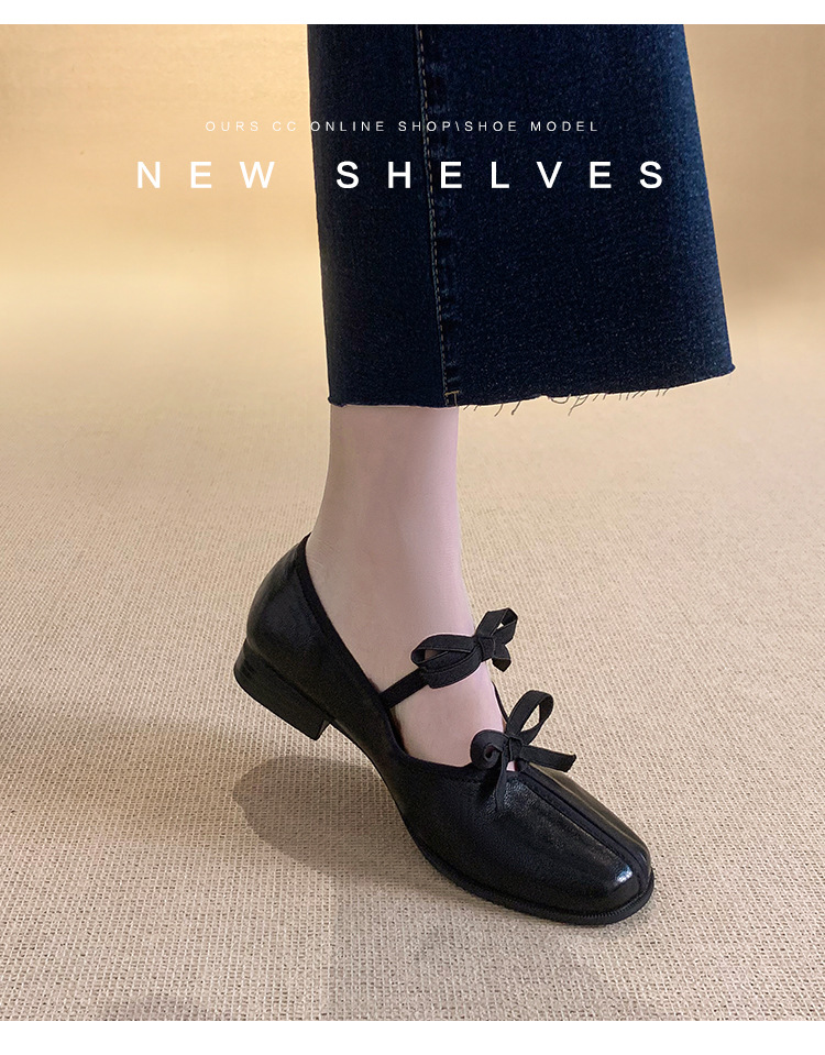 수제 소프트 가죽 스퀘어 토 레트로 보우 메리 제인 신발 여성용 얕은 입 슬립 온 로우 힐 프렌치 발레 스타일 신발