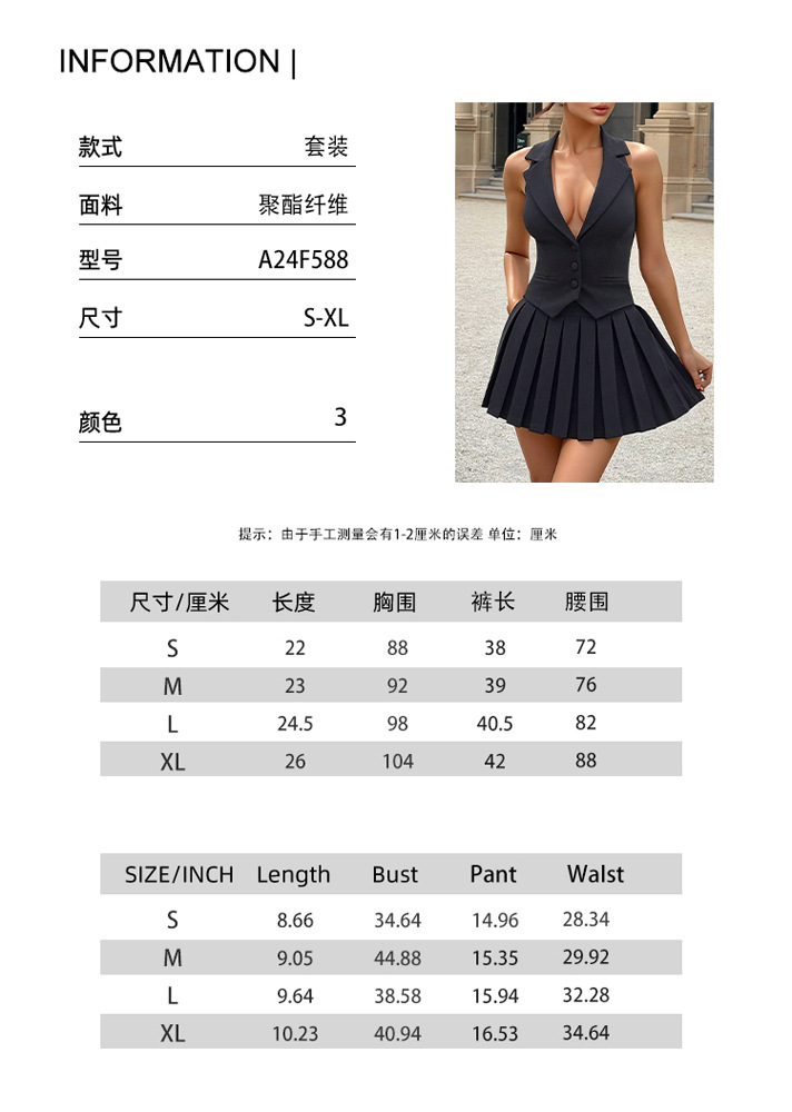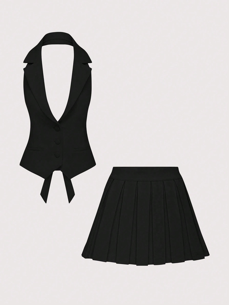 유럽과 미국 스타일의 여성 2025 봄 새로운 우아한 민소매 V 넥 버튼 조끼 주름 치마 투피스 세트스토어 가기