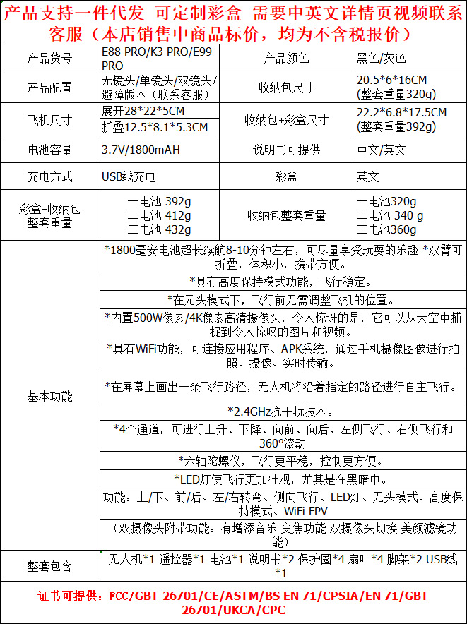 국경 간 E88pro UAV HD 항공 사진 E99 4 축 항공기 원격 제어 항공기 대외 무역 장난감 K3드론