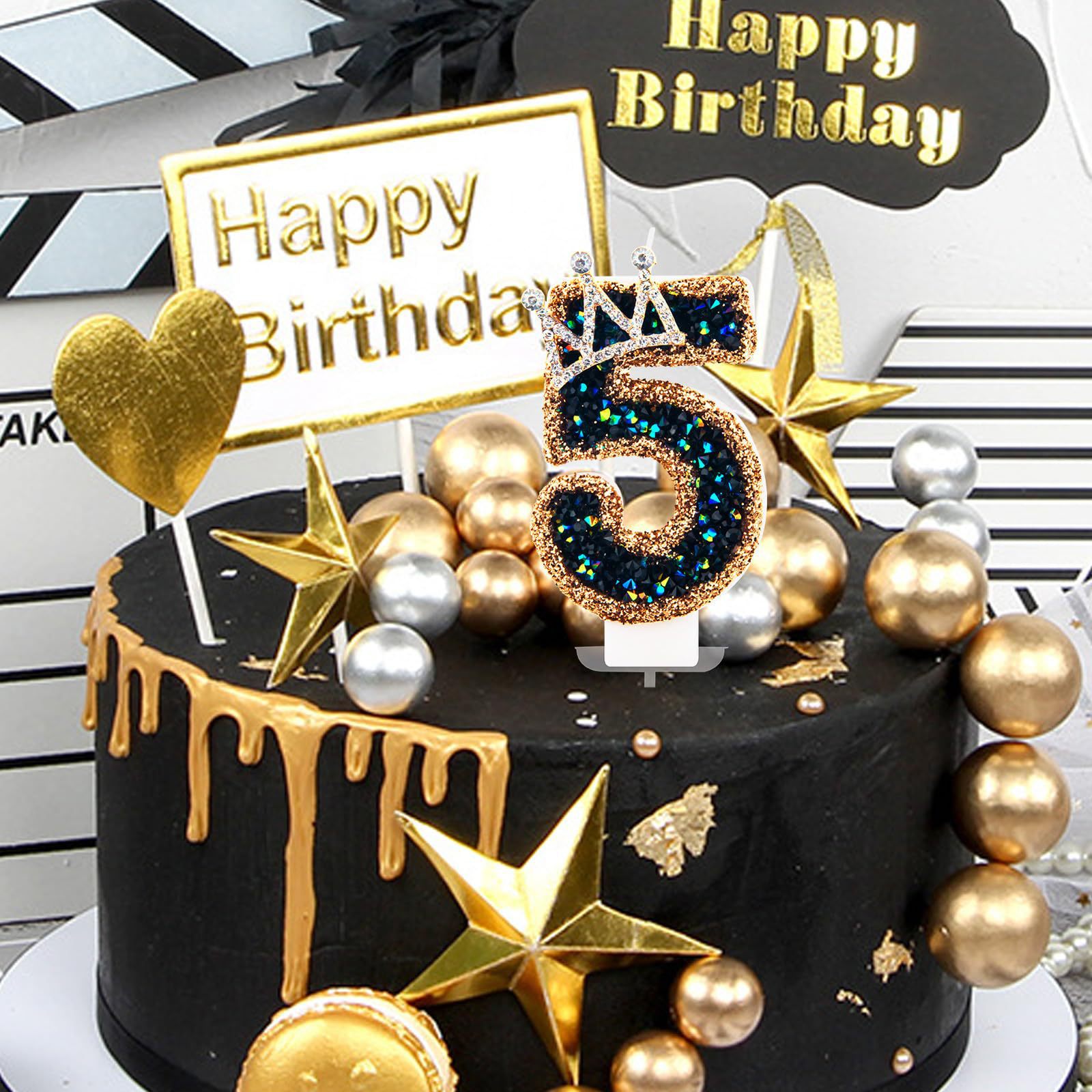 국경 간 블랙 골드 크라운 촛불 귀여운 핑크 그라데이션 보라색 활 디지털 어린이 생일 촛불 장식 케이크