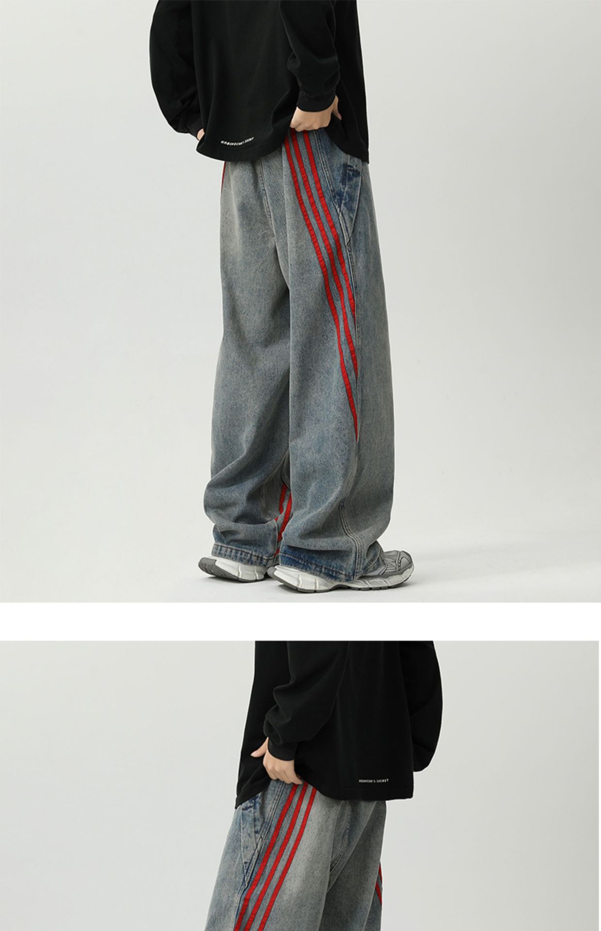 미국식 스트라이프 툴링 청바지 소년 유행 브랜드 새로운 루즈 와이드 레그 하이 스트리트 퍼피 핸섬 캐주얼 롱 팬츠