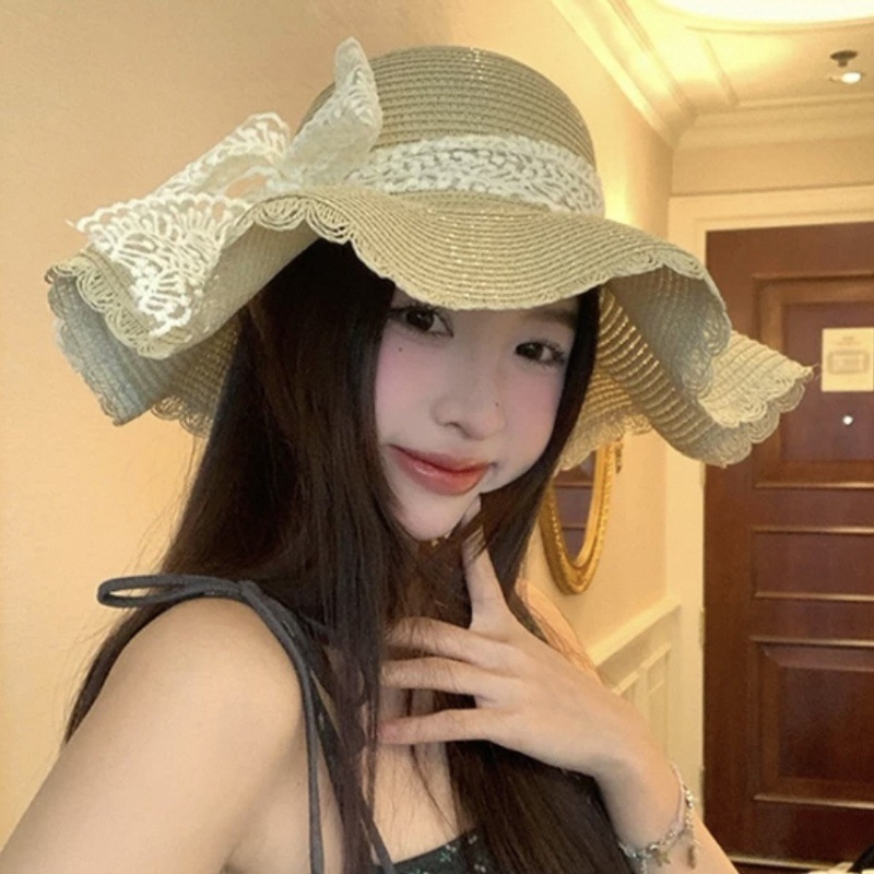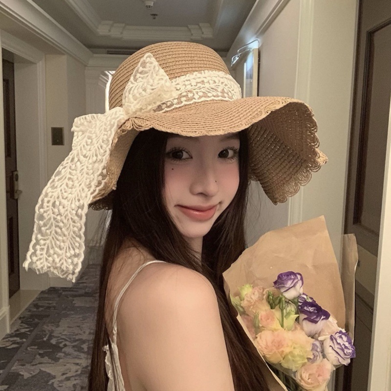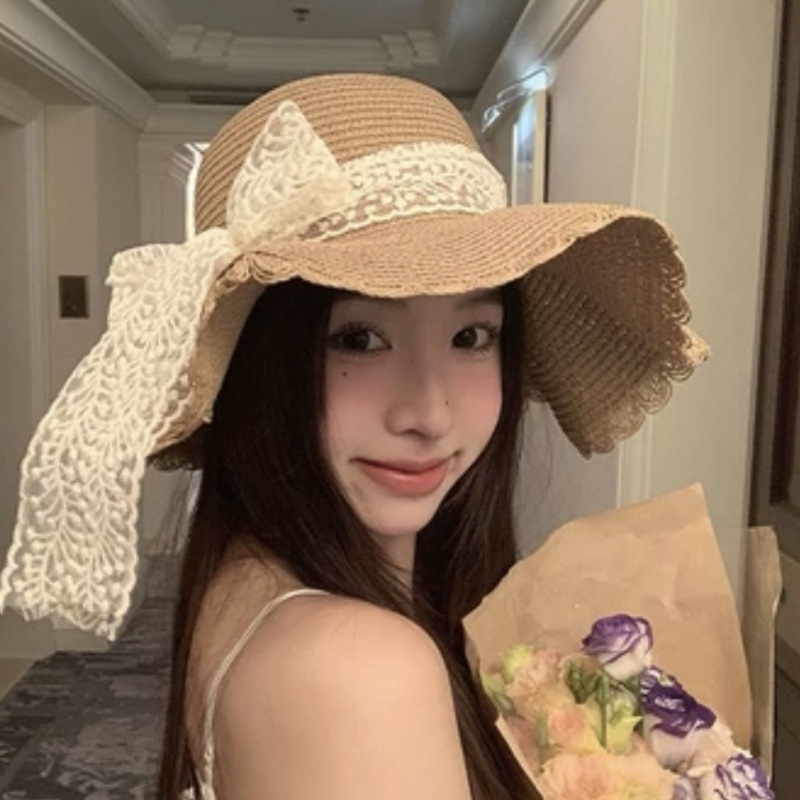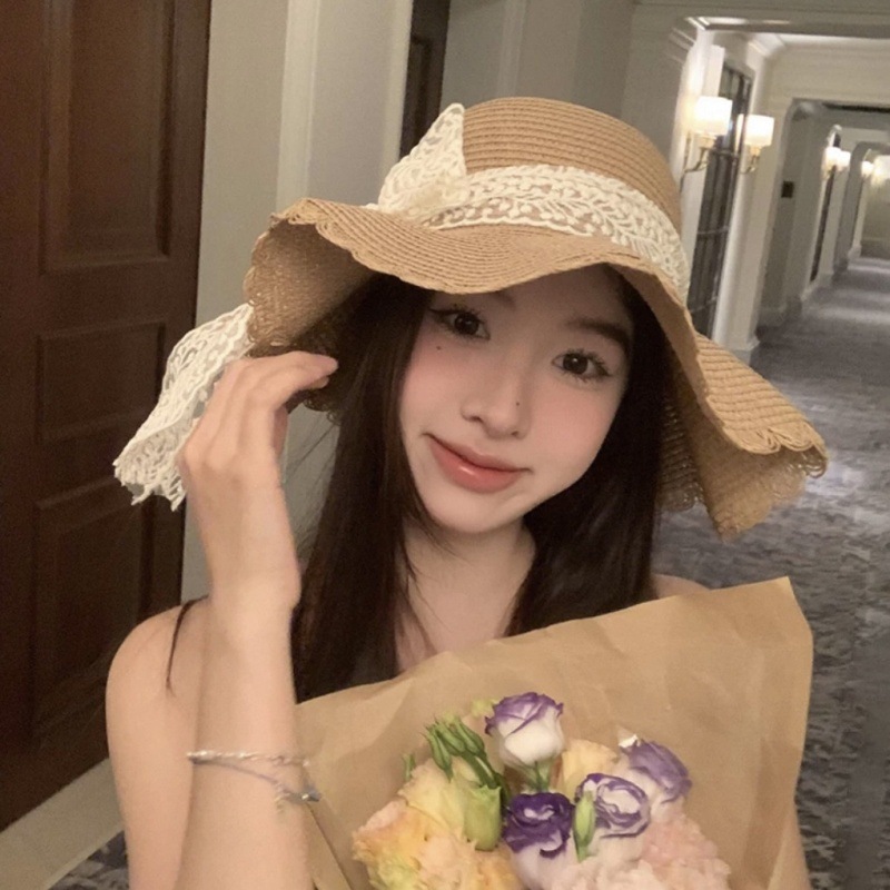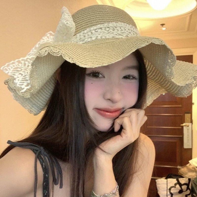 여름 레이스 밀짚 모자 밀짚 모자 안티 자외선 태양 보호 해변 사진 인터넷 인기있는 소녀의 빅 햇 브림