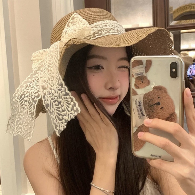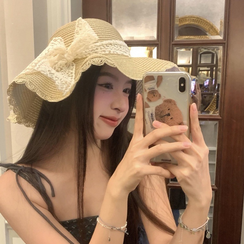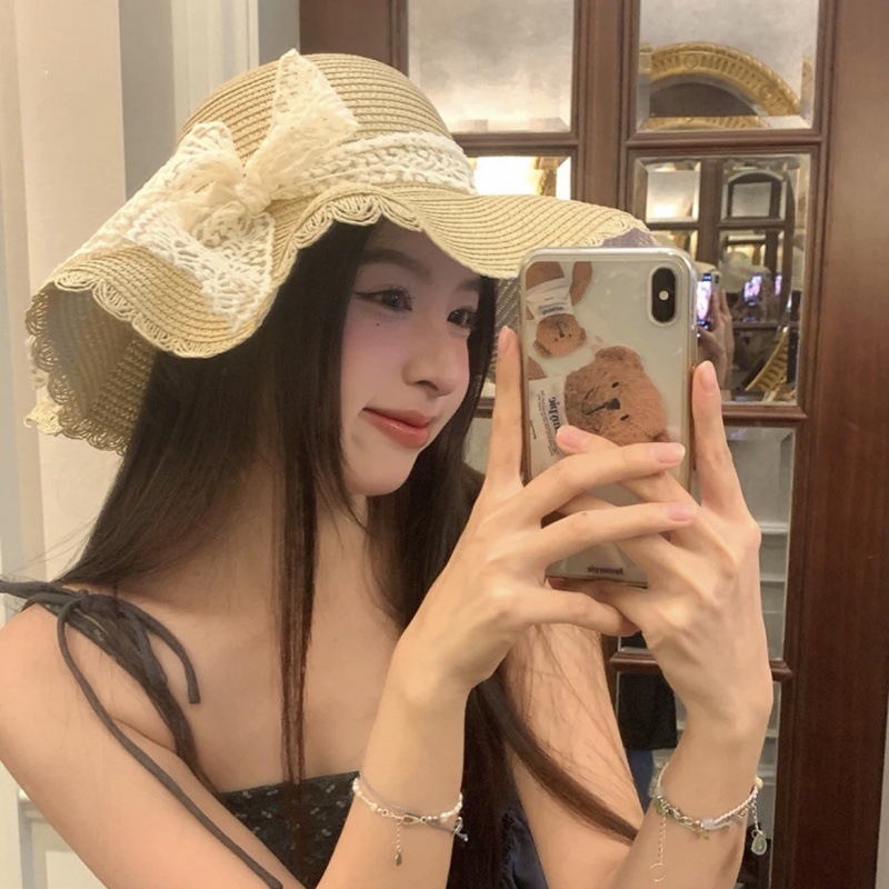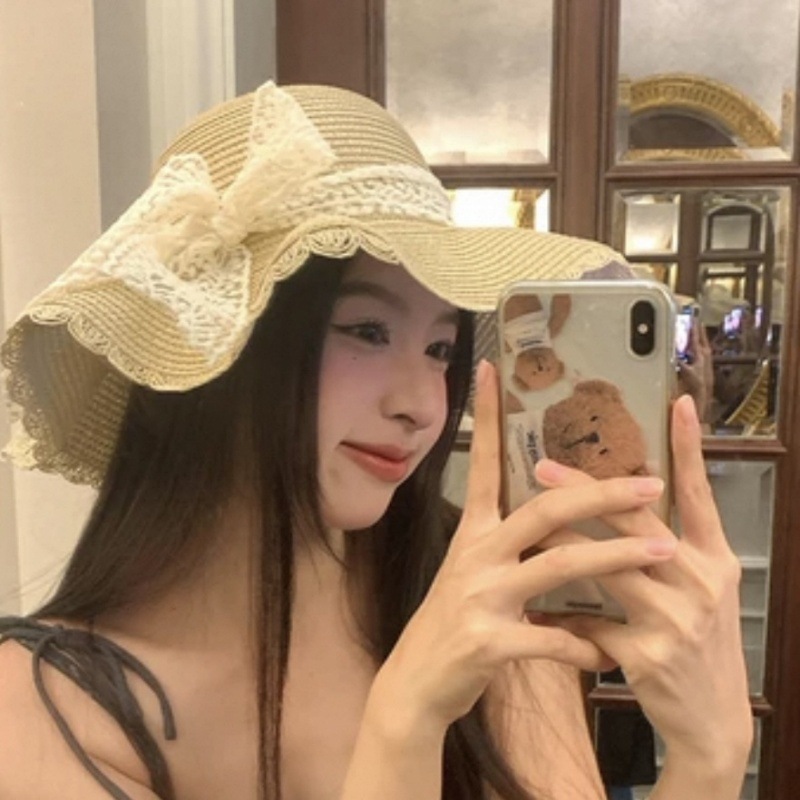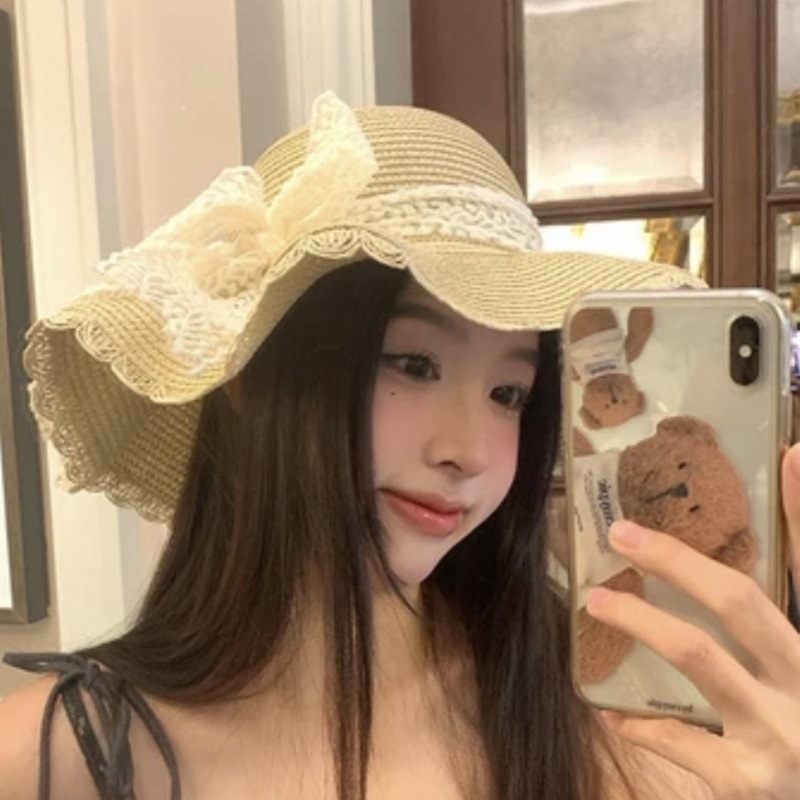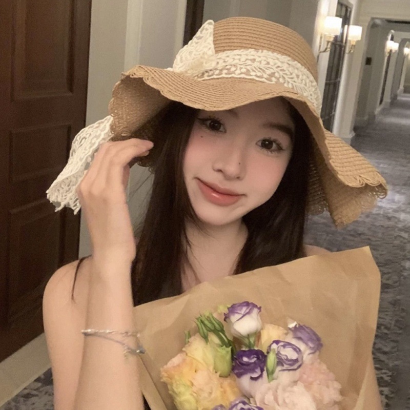 여름 레이스 밀짚 모자 밀짚 모자 안티 자외선 태양 보호 해변 사진 인터넷 인기있는 소녀의 빅 햇 브림