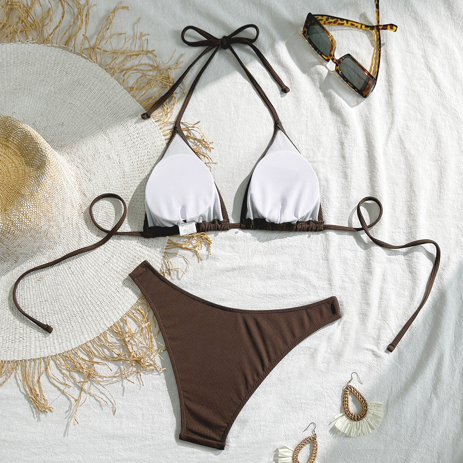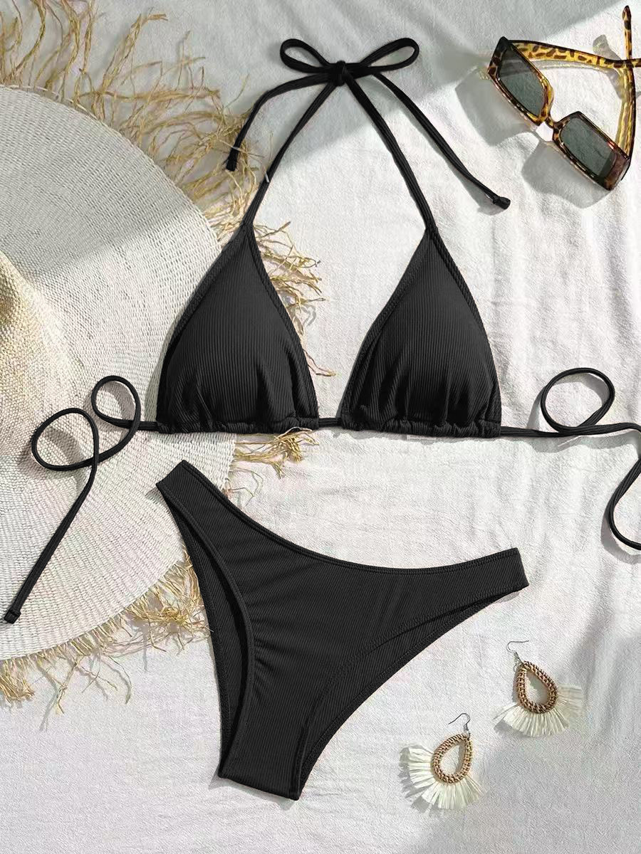 재고 2025 유럽과 미국의 섹시한 3 점 단색 단순 분할 비키니 비키니 수영복 여성용 소형 핏 스트립