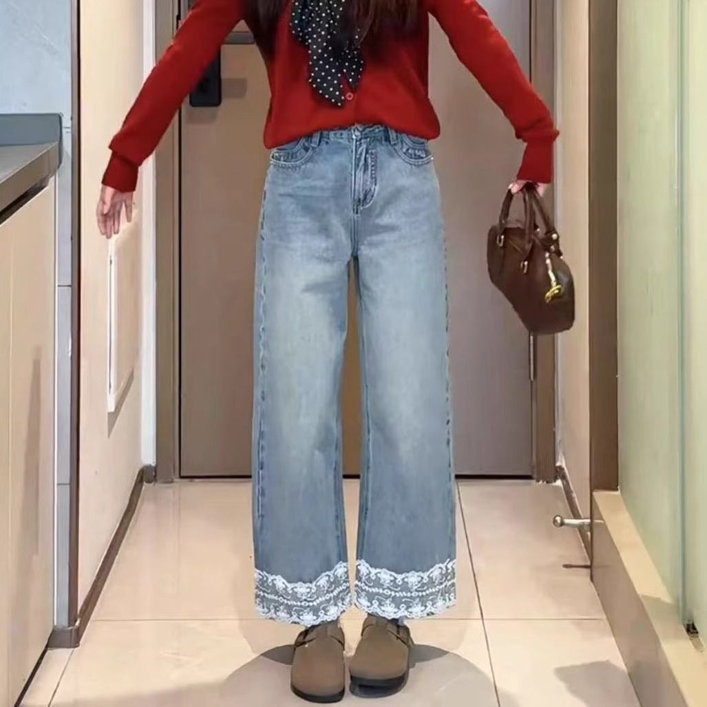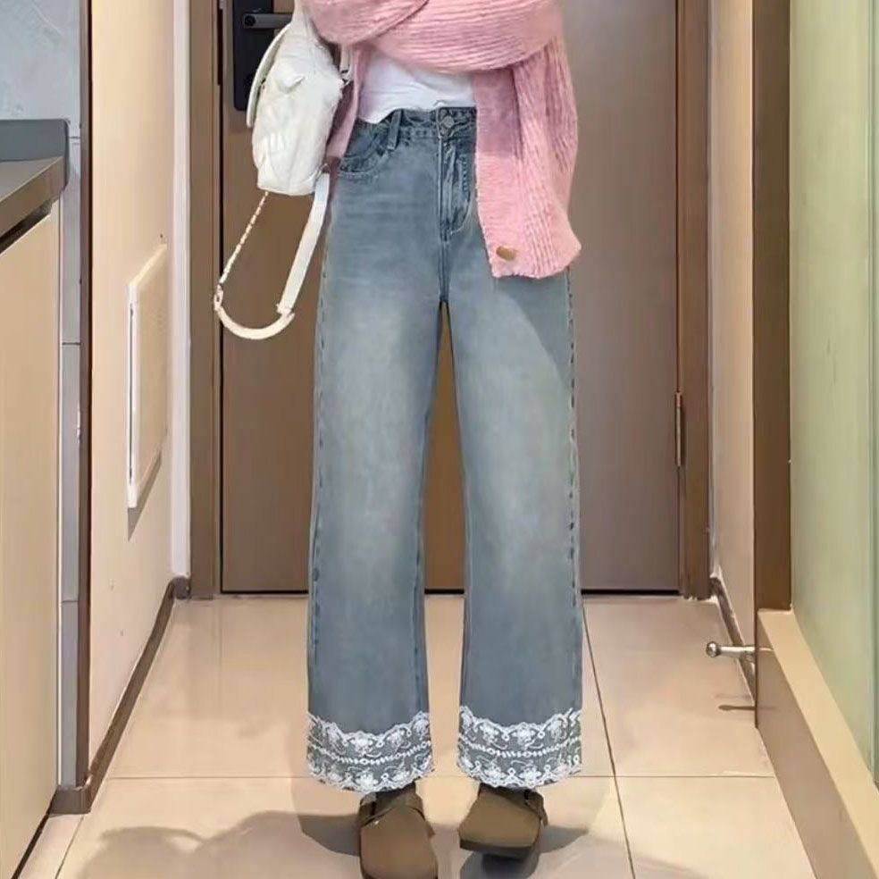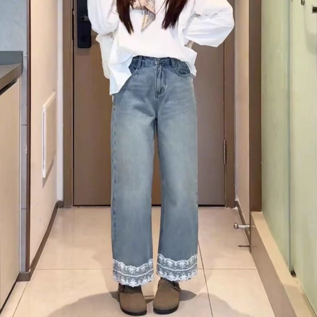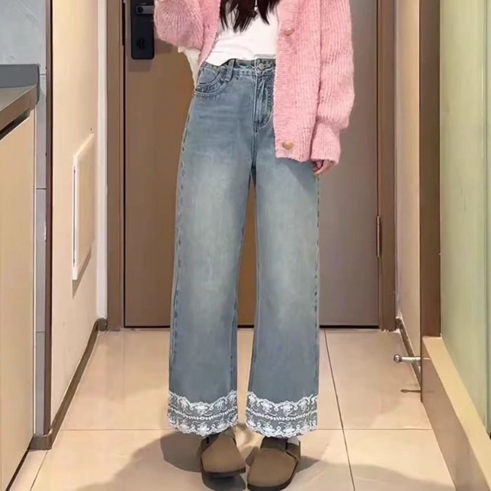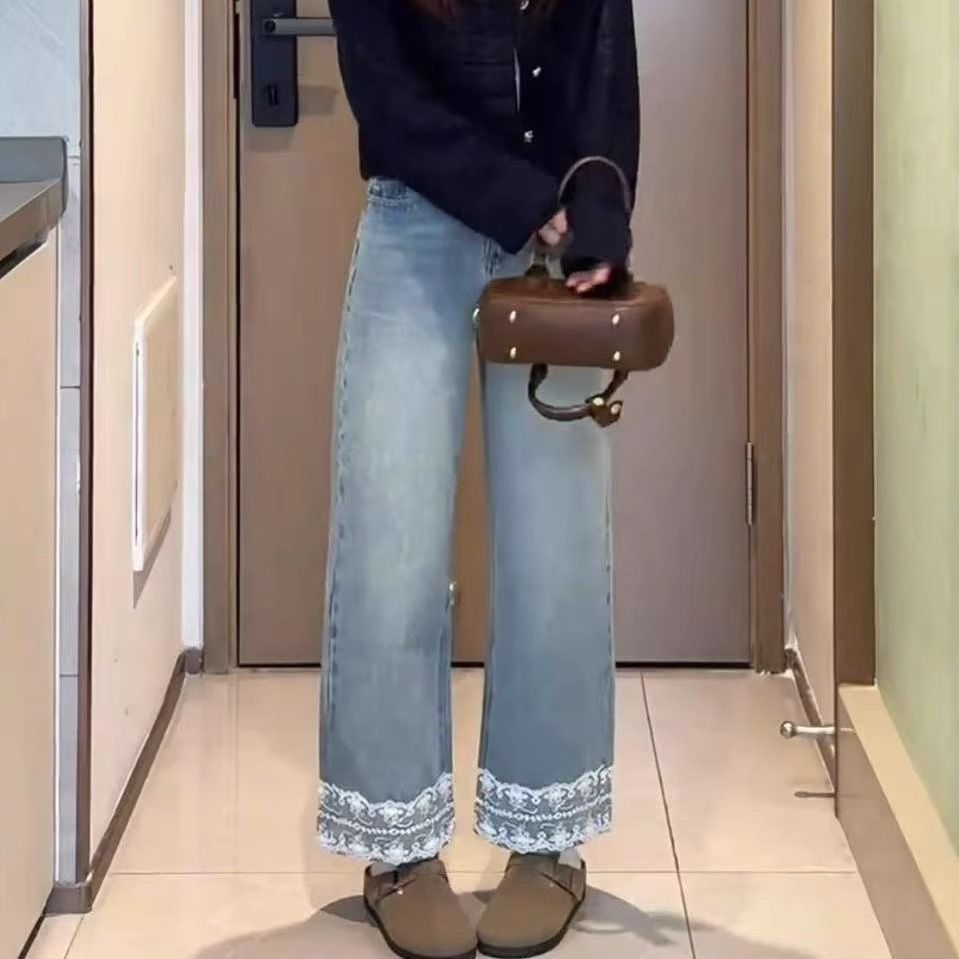 레이스 스티칭 벨트 작은 스트레이트 바지 여성의 2025 년 초 봄 새로운 틈새 디자인 센스 슬리밍 바지스토어 가기