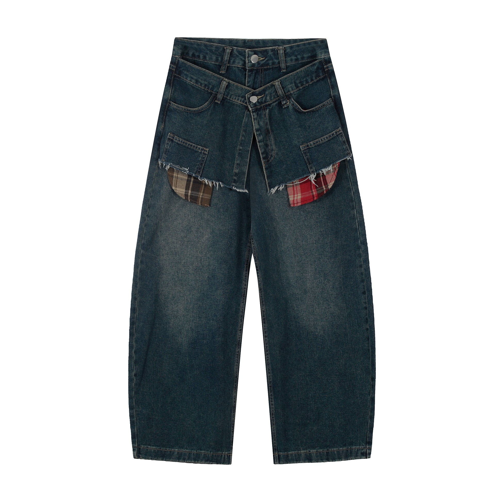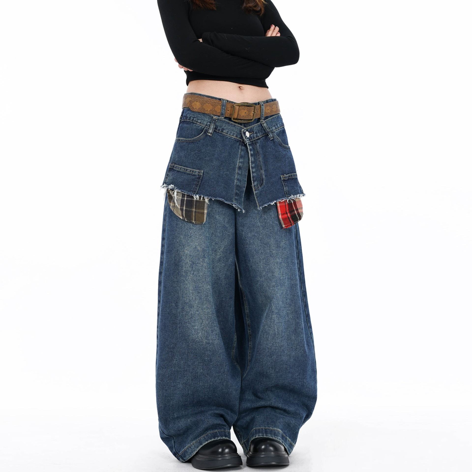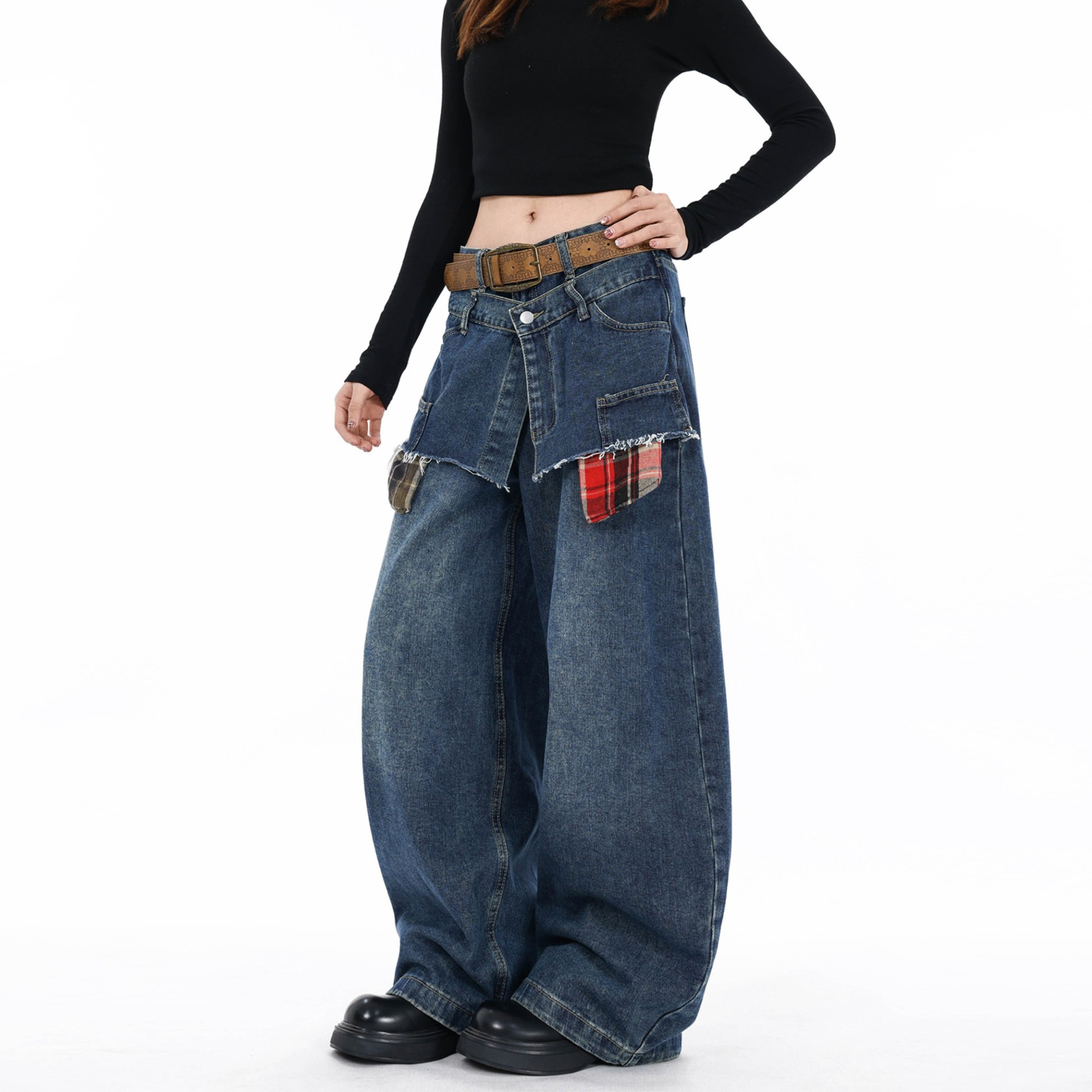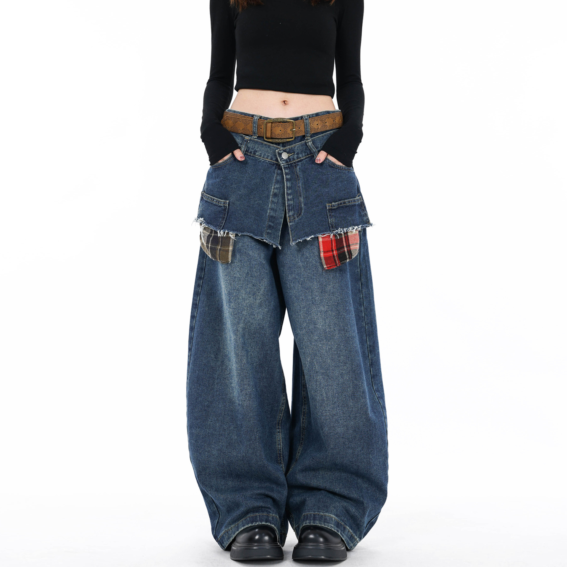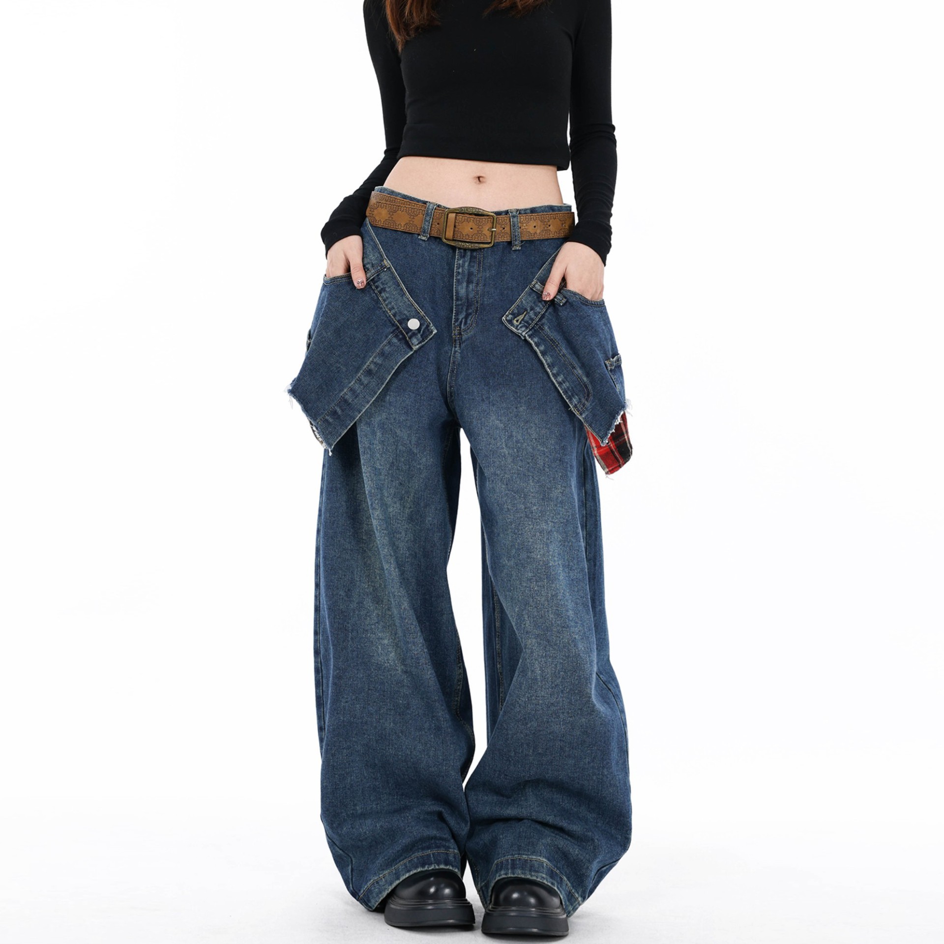 가짜 투피스 포켓 청바지 남성 봄과 가을 미국 스타일 오버 사이즈 바지 하이 스트리트 루즈 와이드 레그 바지스토어 가기