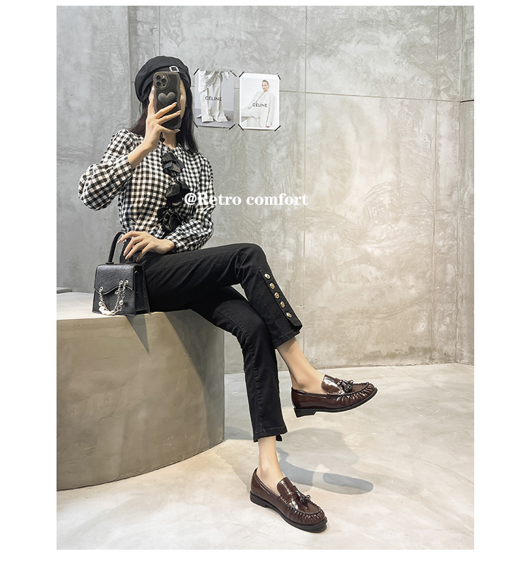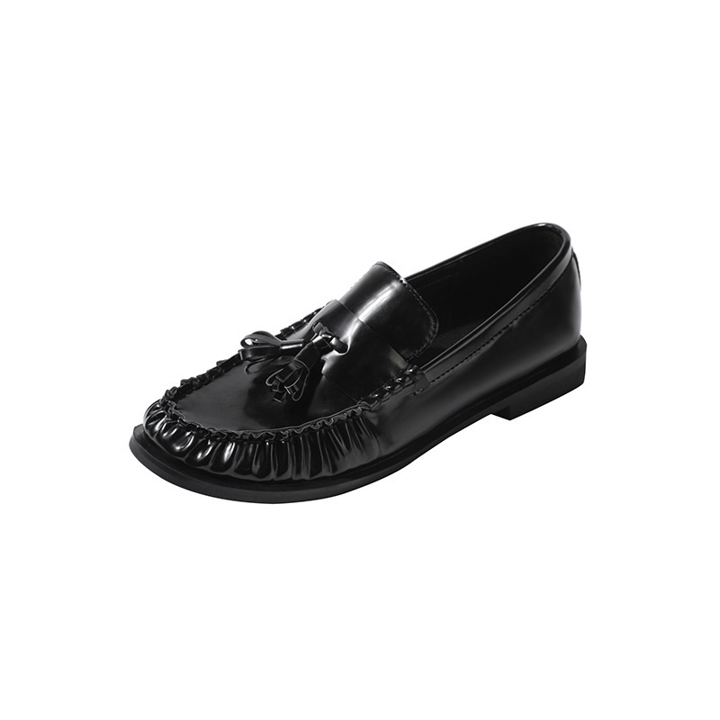 정품 가죽 신발 영국 스타일 2025 새로운 특허 가죽 술 짠 둥근 단층 신발 슬립 온 로퍼 여성용