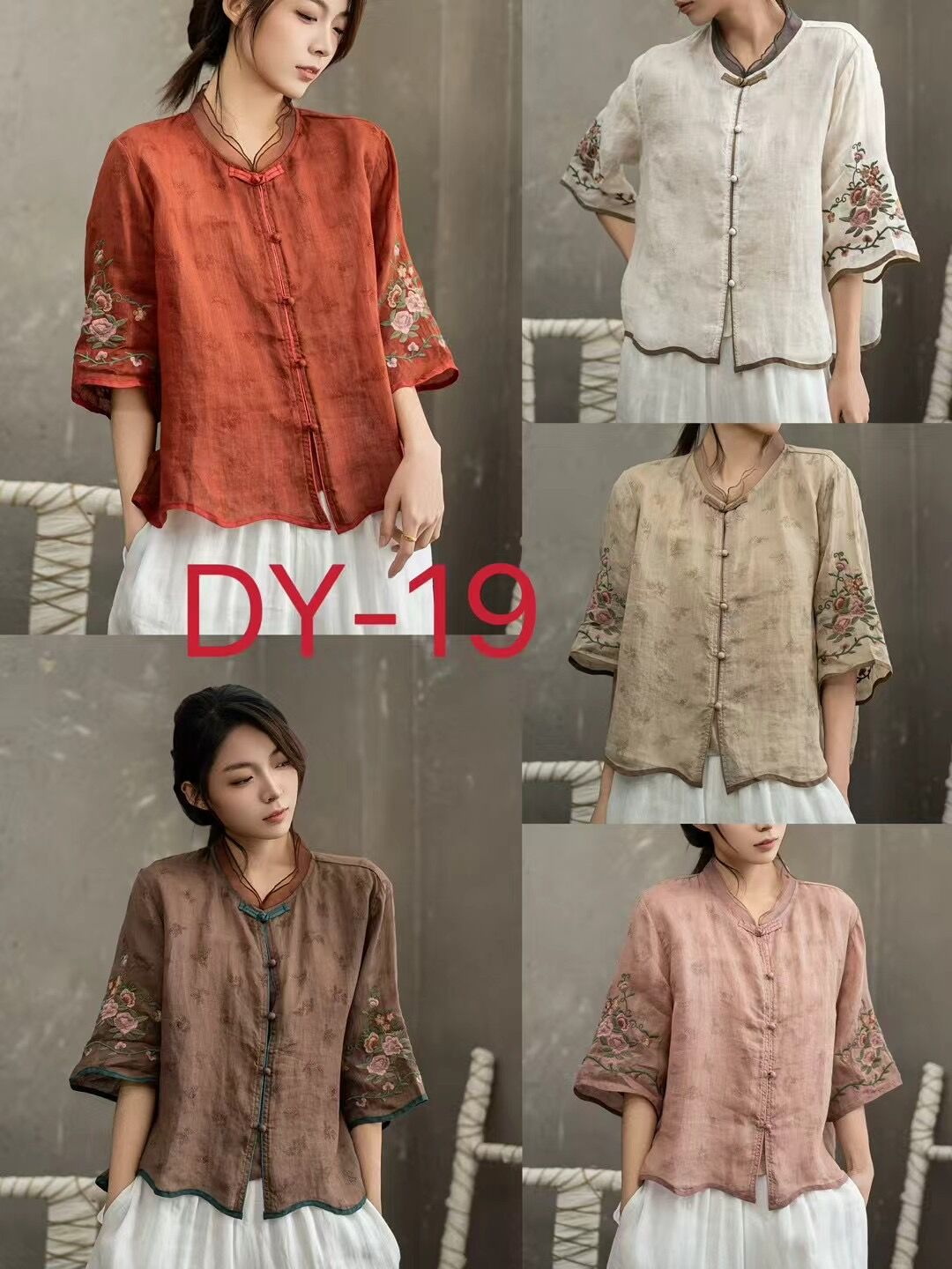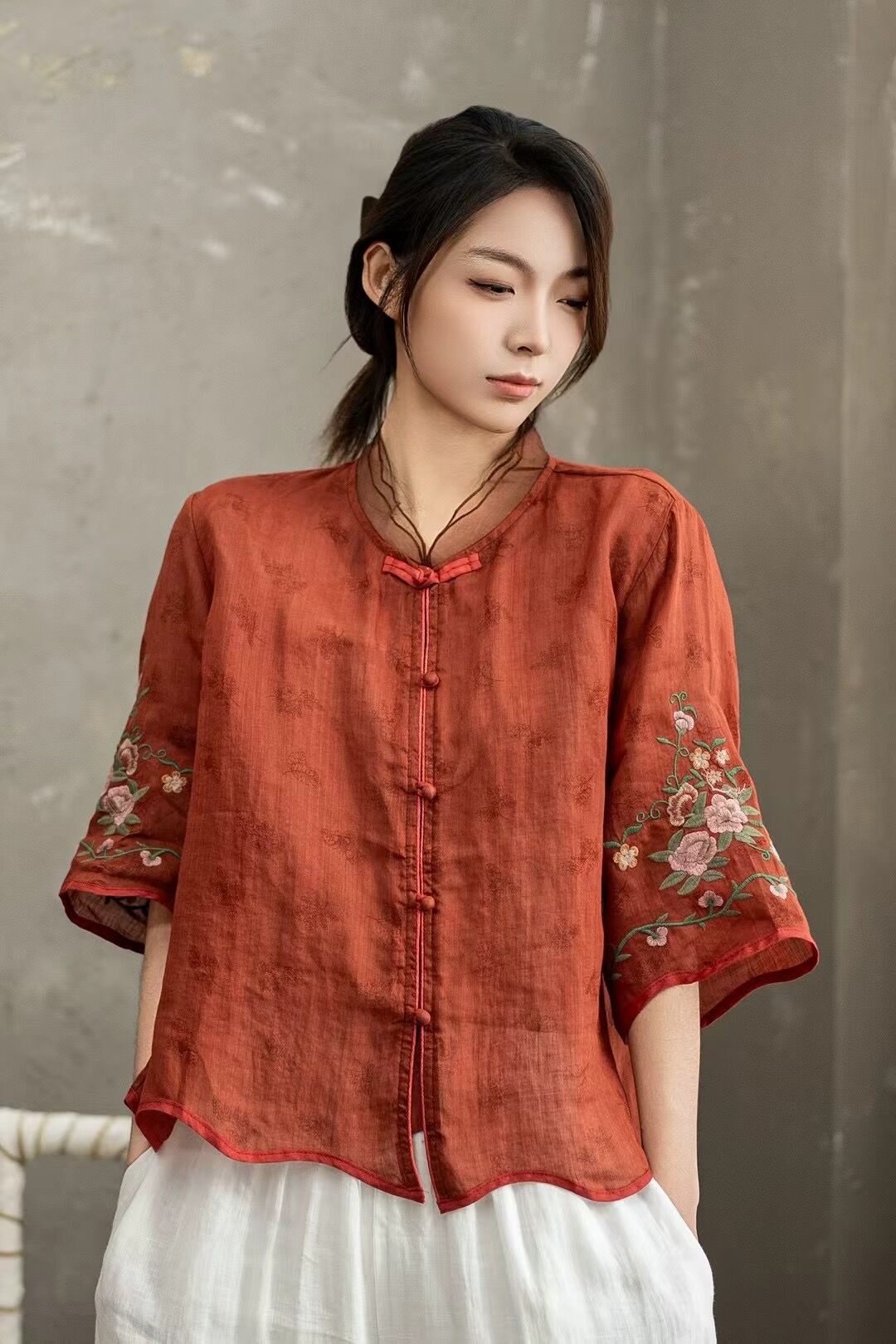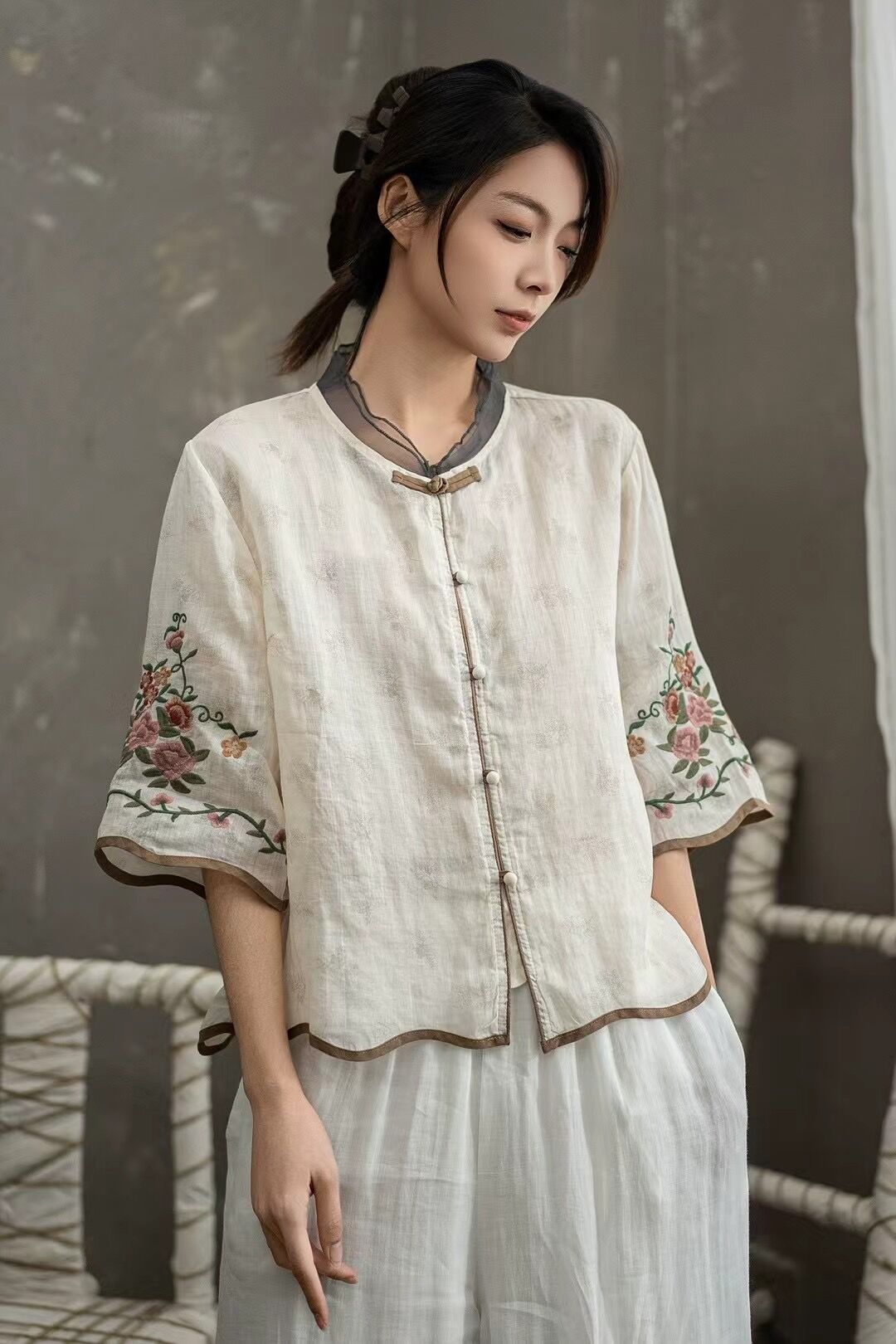 셔츠 선불 자수 셔츠 중국 스타일 모시 버튼 5점 19 탑 슬리브 중국 스타일 2025 여름 여성 신작스토어 가기