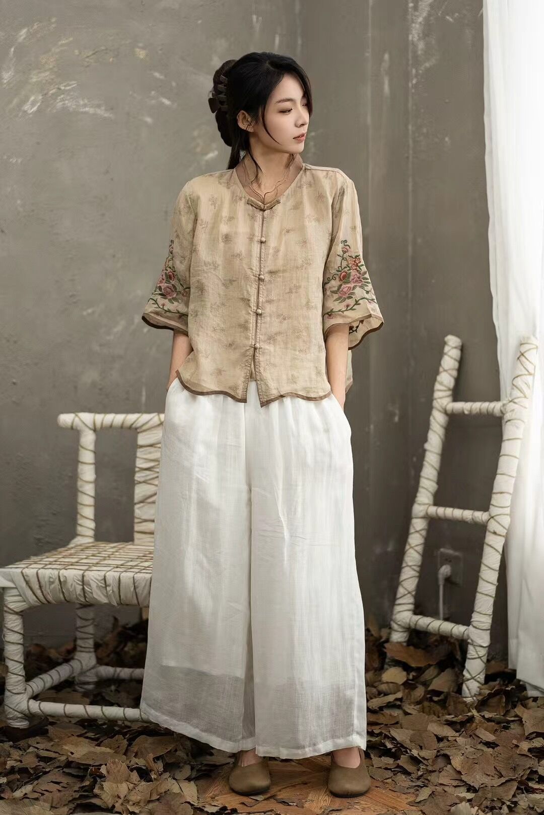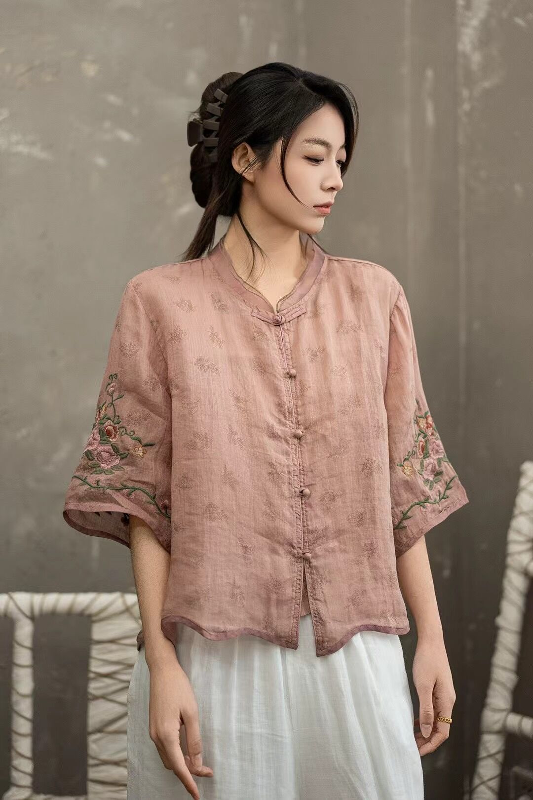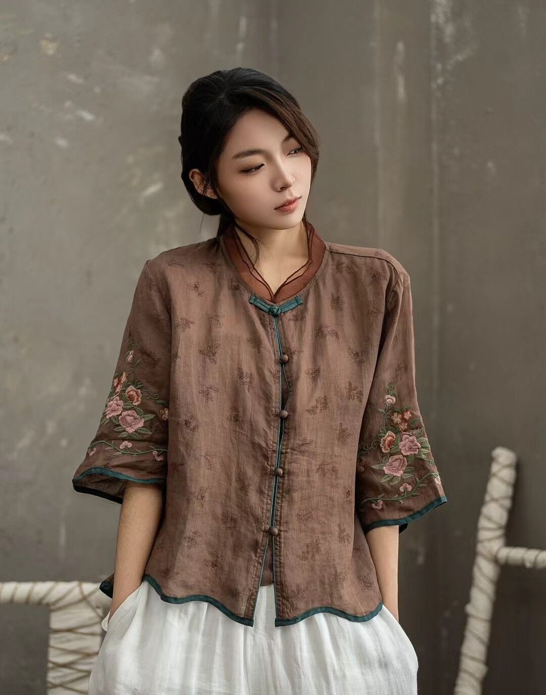 셔츠 선불 자수 셔츠 중국 스타일 모시 버튼 5점 19 탑 슬리브 중국 스타일 2025 여름 여성 신작스토어 가기