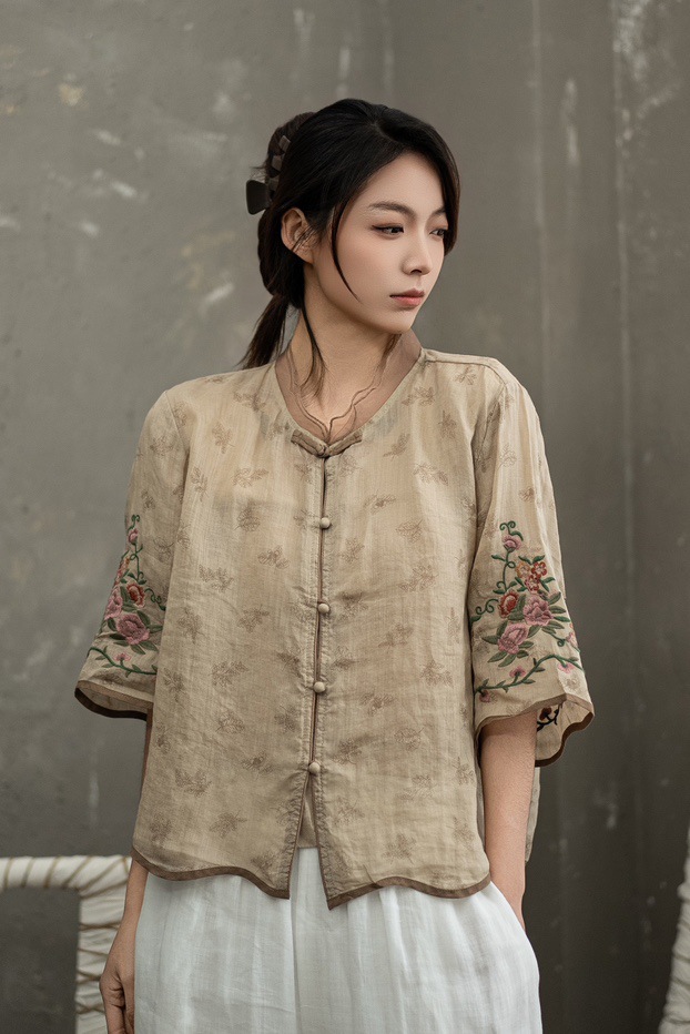 셔츠 선불 자수 셔츠 중국 스타일 모시 버튼 5점 19 탑 슬리브 중국 스타일 2025 여름 여성 신작
