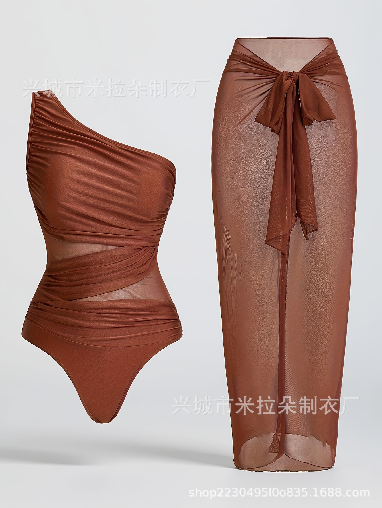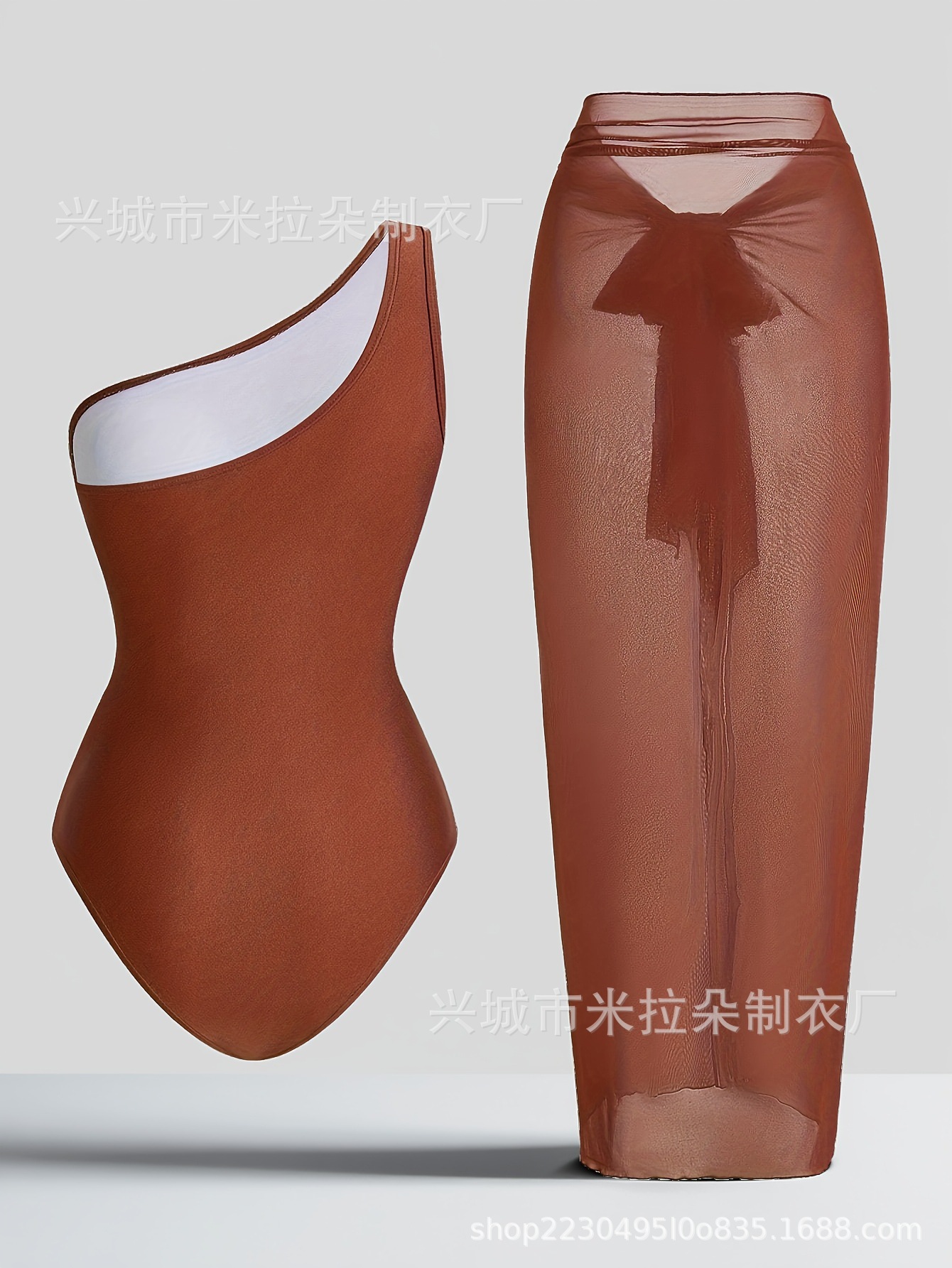 2025 유럽 및 미국 휴가용 자외선 차단 배 가리개 수영복 원피스 메쉬 슬리밍 편안한 브라운 대형 사이즈 여성 수영복