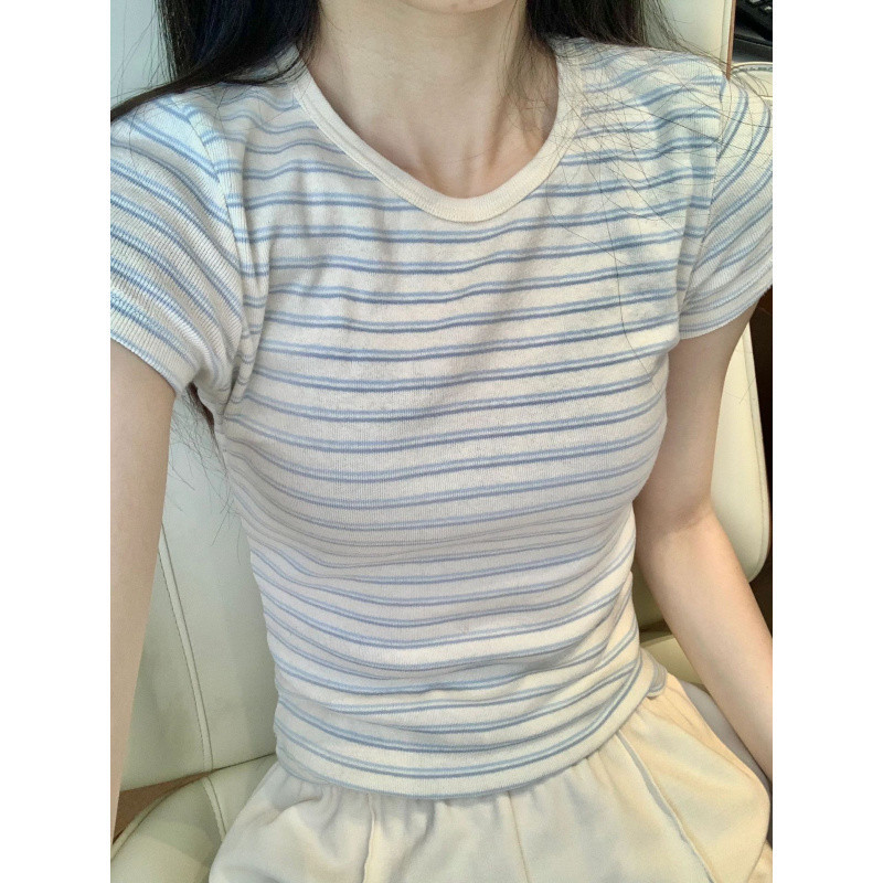 아메리칸 스타일 Bm 달콤하고 매운 스타일 어깨 반팔 티셔츠 여성 디자인 센스 콘트라스트 컬러 스트라이프 슬림베이스 여름 올 매치 탑스토어 가기