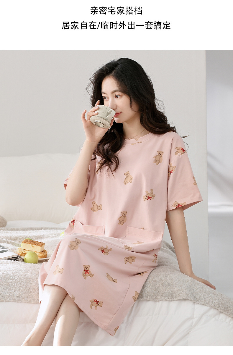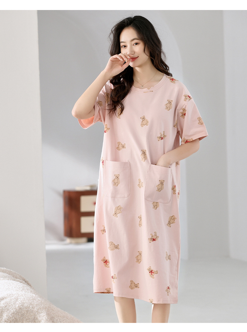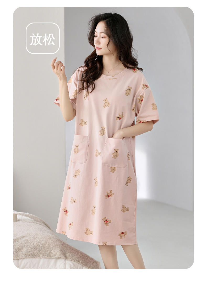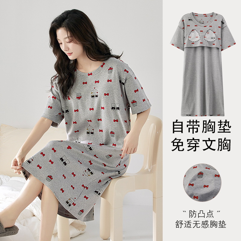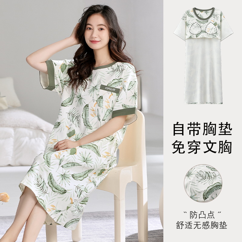여성용 가슴 패드가 있는 잠옷 드레스, 여름 반팔, 중간 길이, 루즈하고 캐주얼한 플러스 사이즈, 봄, 가을 홈웨어, 외부 착용 가능스토어 가기