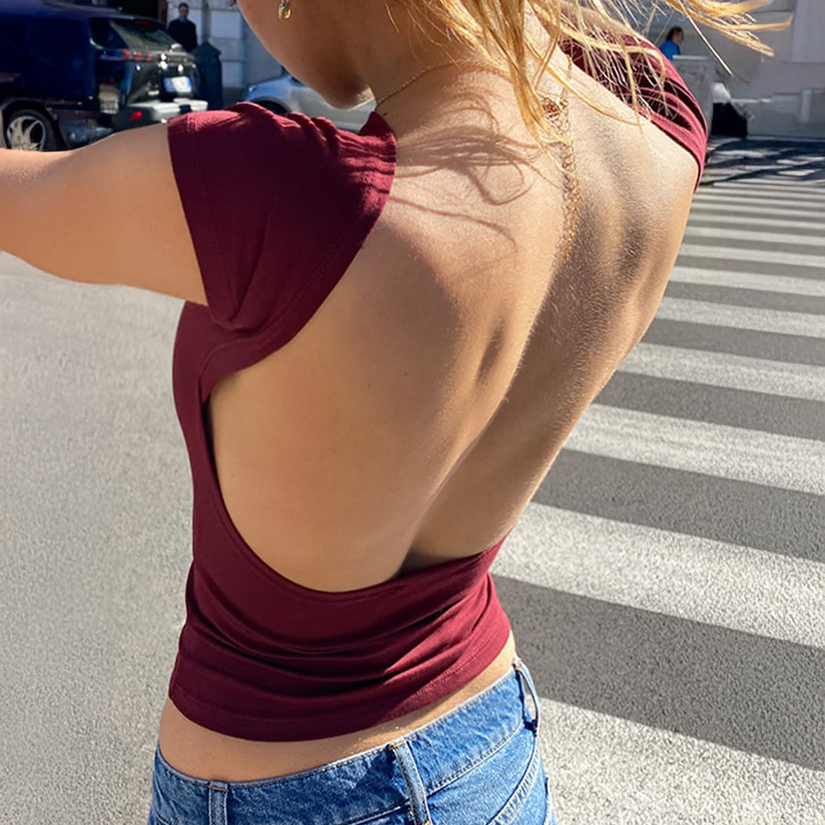 Diyun 2025 봄과 여름 아마존 유럽과 미국 Y2K 섹시한 스파이스 걸스 빈 불없는 단색 탑 짧은 소매 여성용 티셔츠스토어 가기