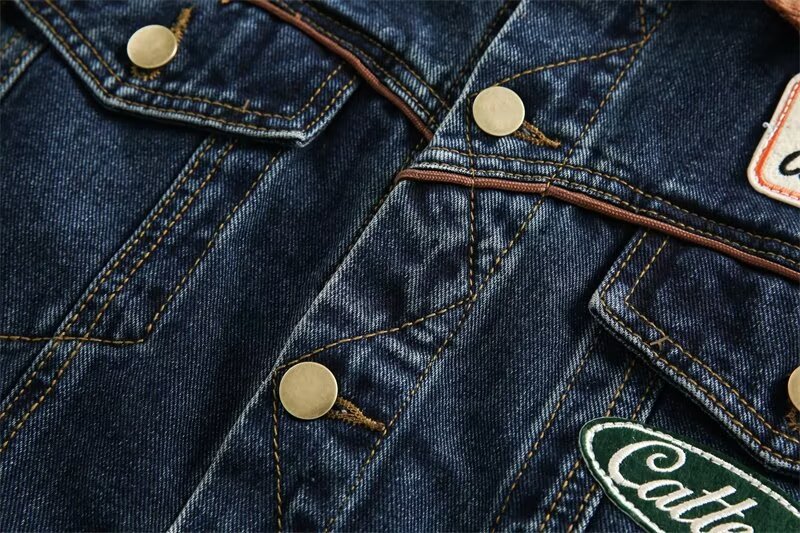 블루 콜라 아메리칸 레트로 자수 데님 코트 여성 가을 ​​새로운 느슨한 대비 색상 옷깃 칼라 카고 자켓