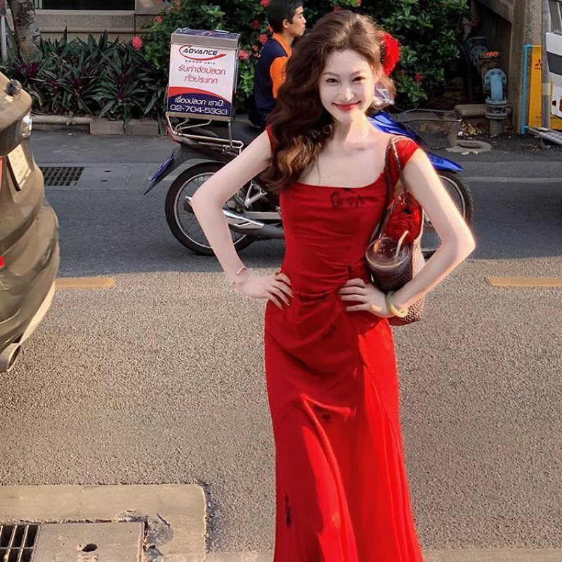치앙마이 레드 로즈 피쉬 테일 티 브레이크 프랑스 붉은 광장 칼라 조끼 할터 스커트 여성 홀리데이 스커트 2025 여름 새 도착스토어 가기
