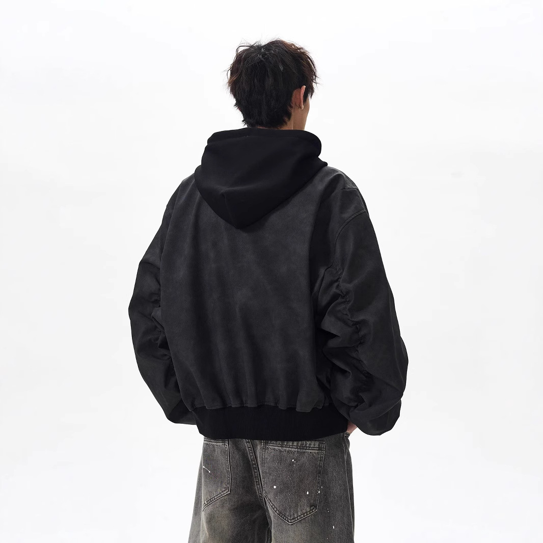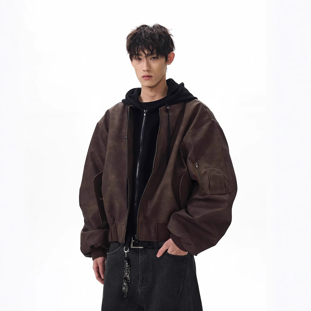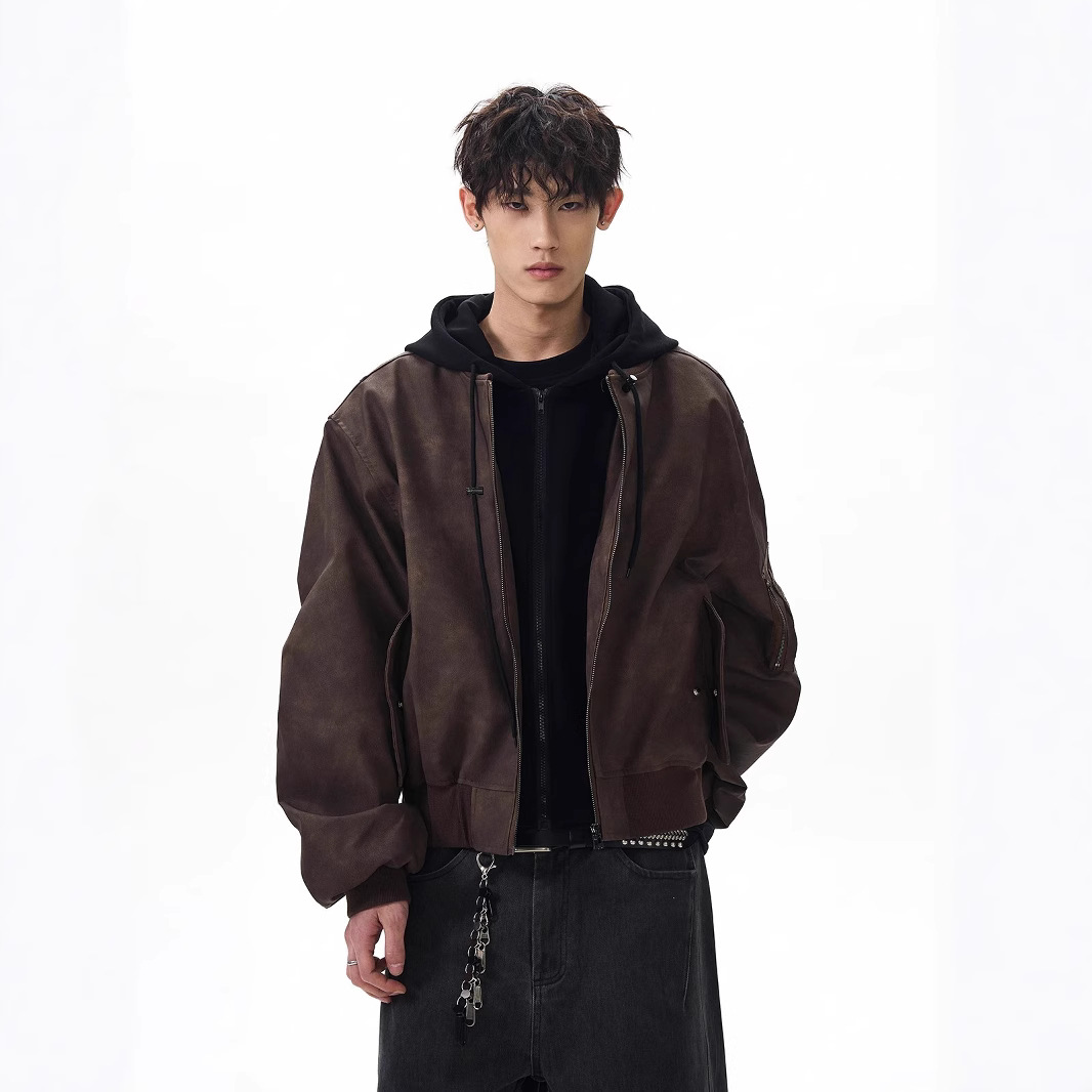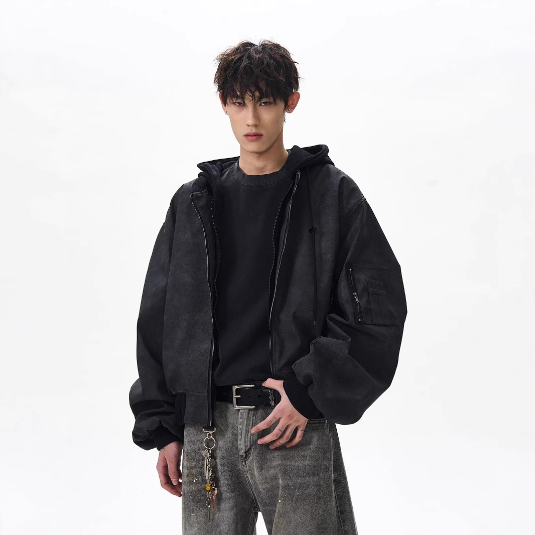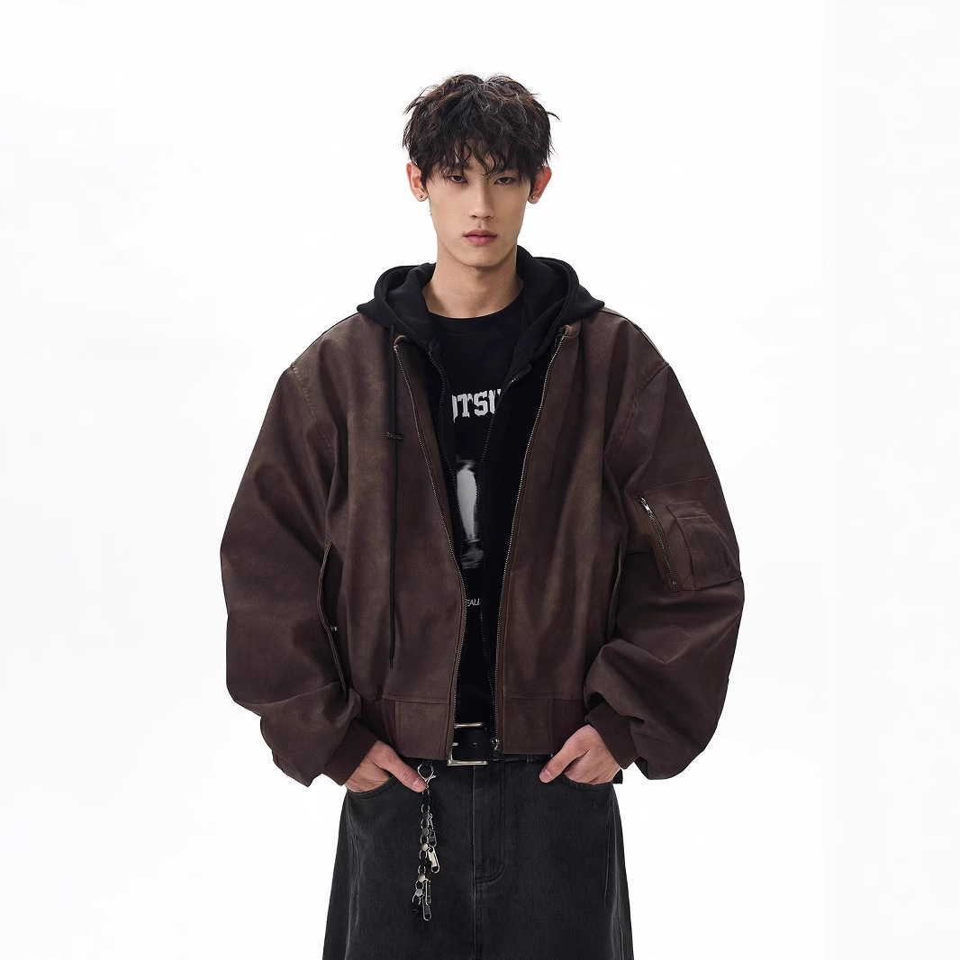 봄버 가짜 투피스 비행 재킷 남성 봄, 가을 느슨한 후드 실루엣 PU 가죽 새로운 복고풍스토어 가기