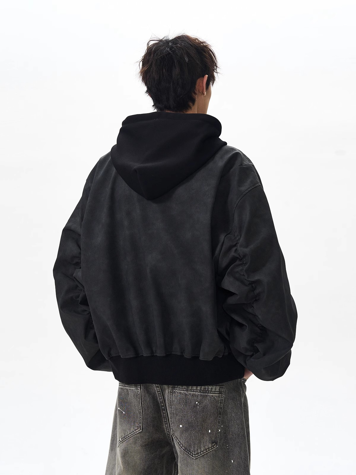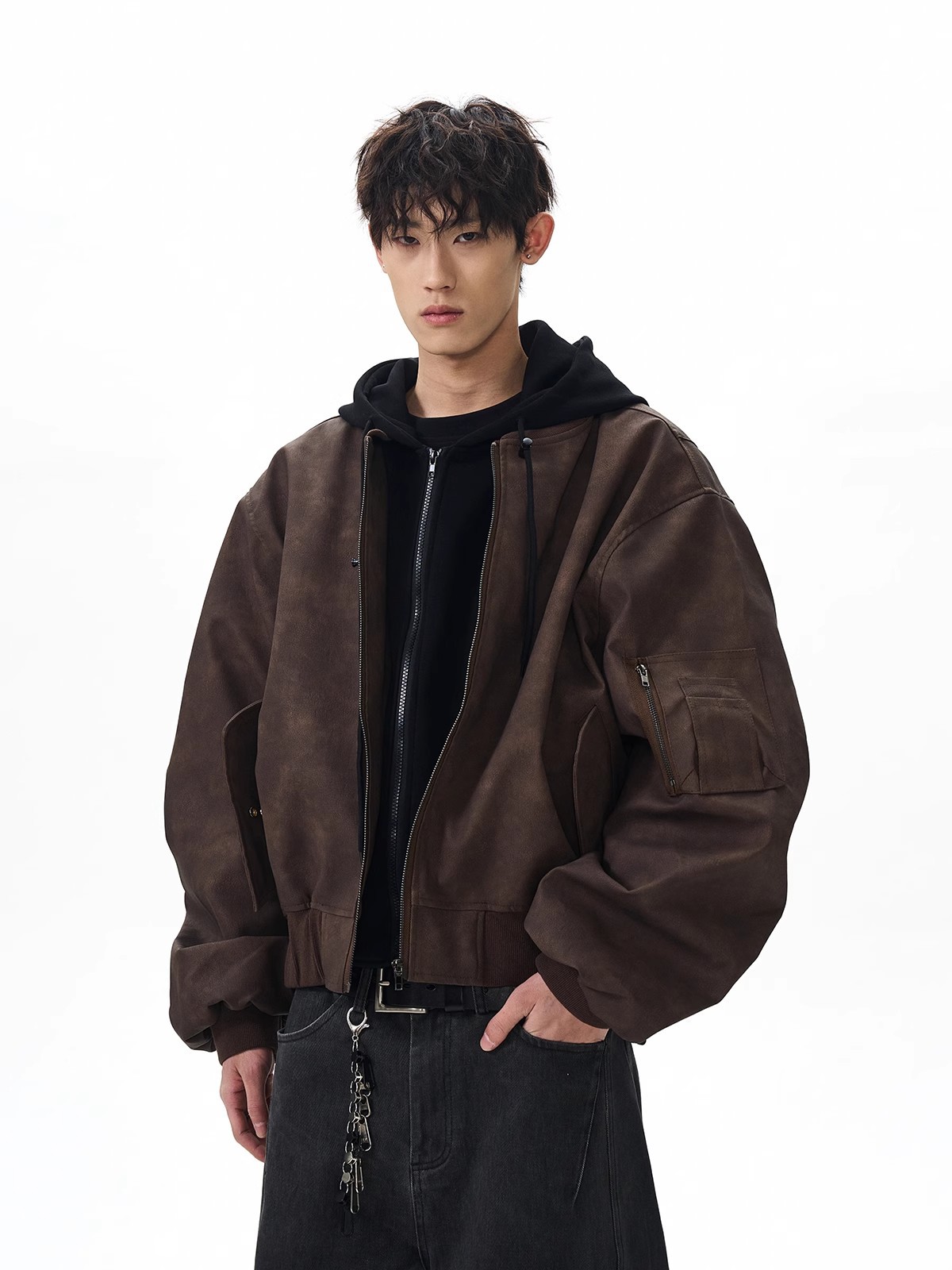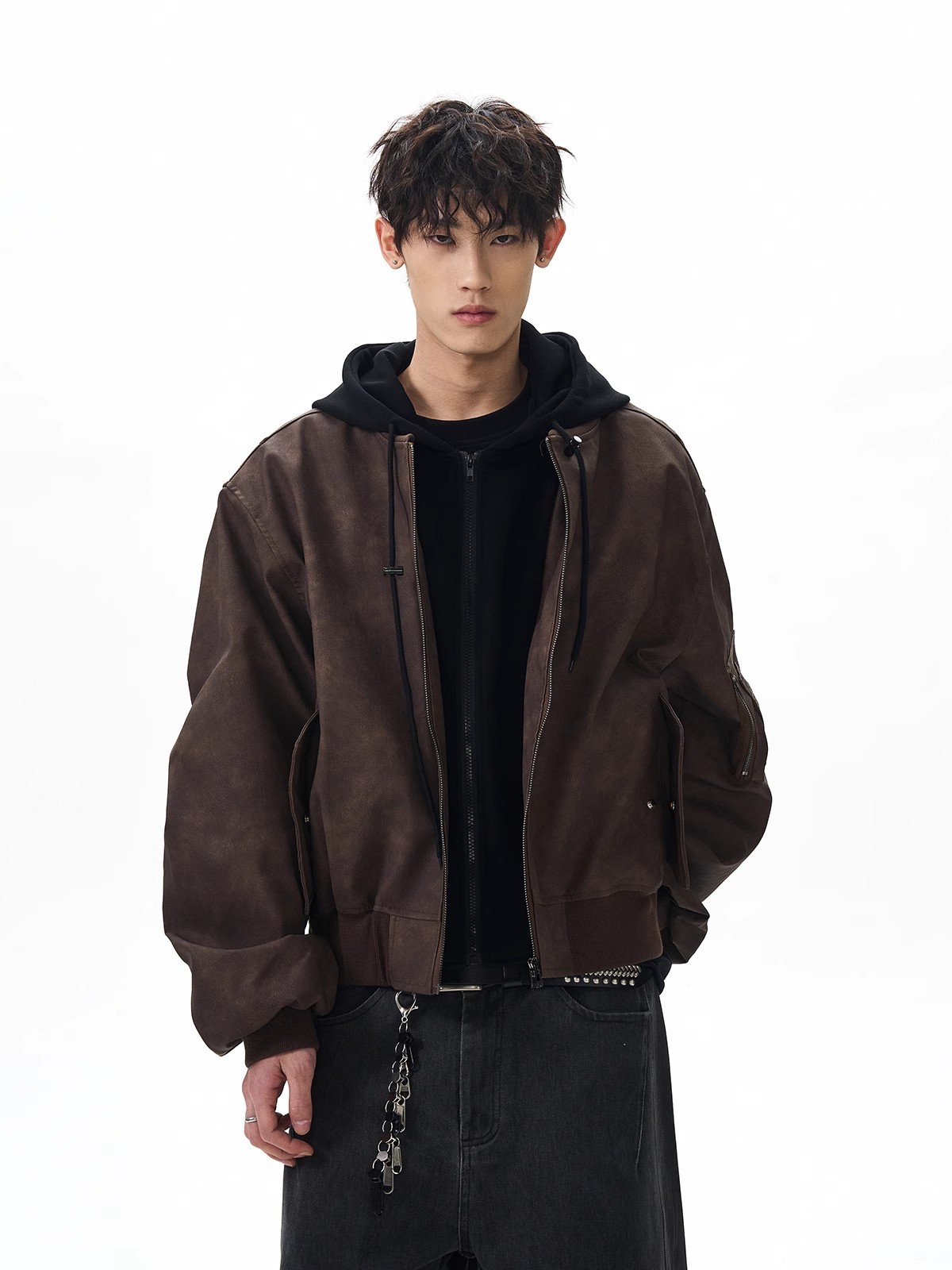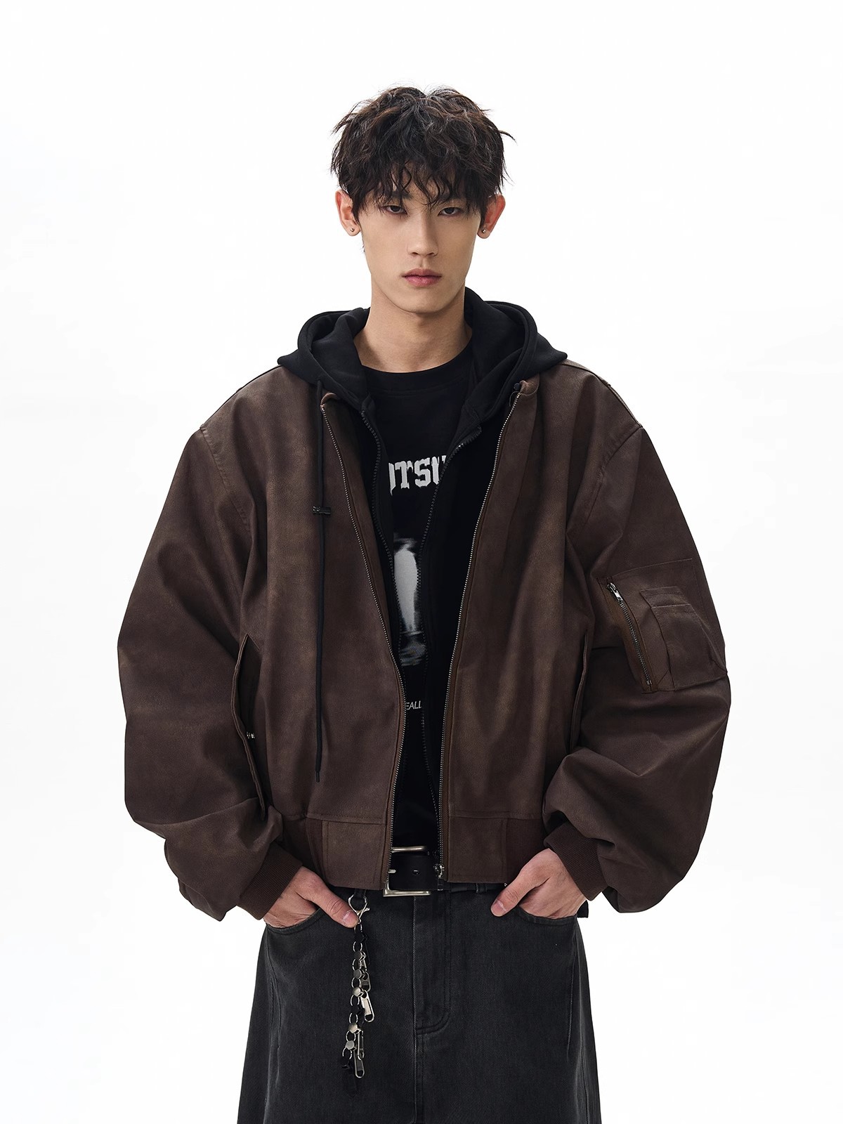 봄버 가짜 투피스 비행 재킷 남성 봄, 가을 느슨한 후드 실루엣 PU 가죽 새로운 복고풍스토어 가기
