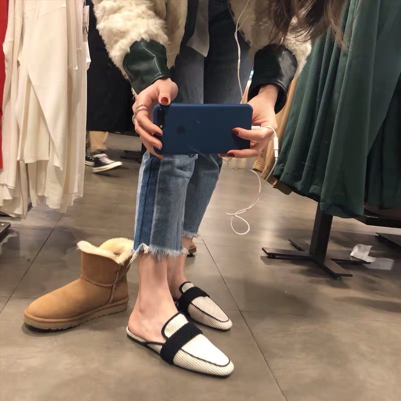 2025 봄 패션 스퀘어 헤드 원 페달 통근 플랫 여성 신발 바느질 뮬러 신발 스트라이프 바오 터 하프 슬리퍼 여성스토어 가기
