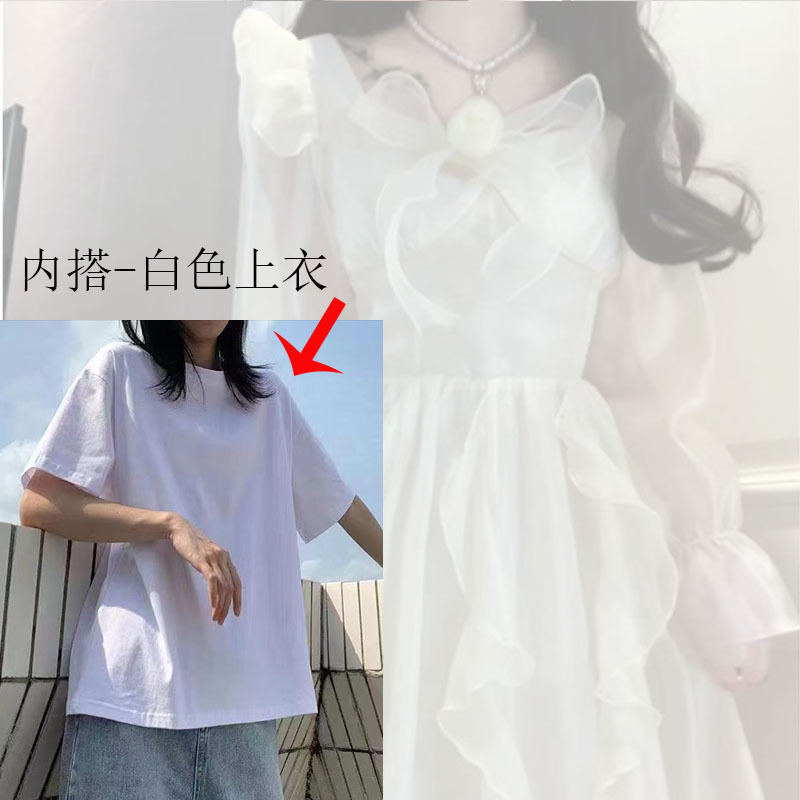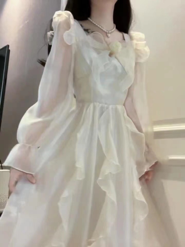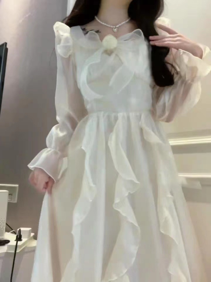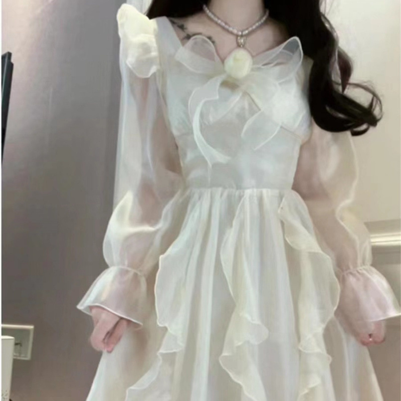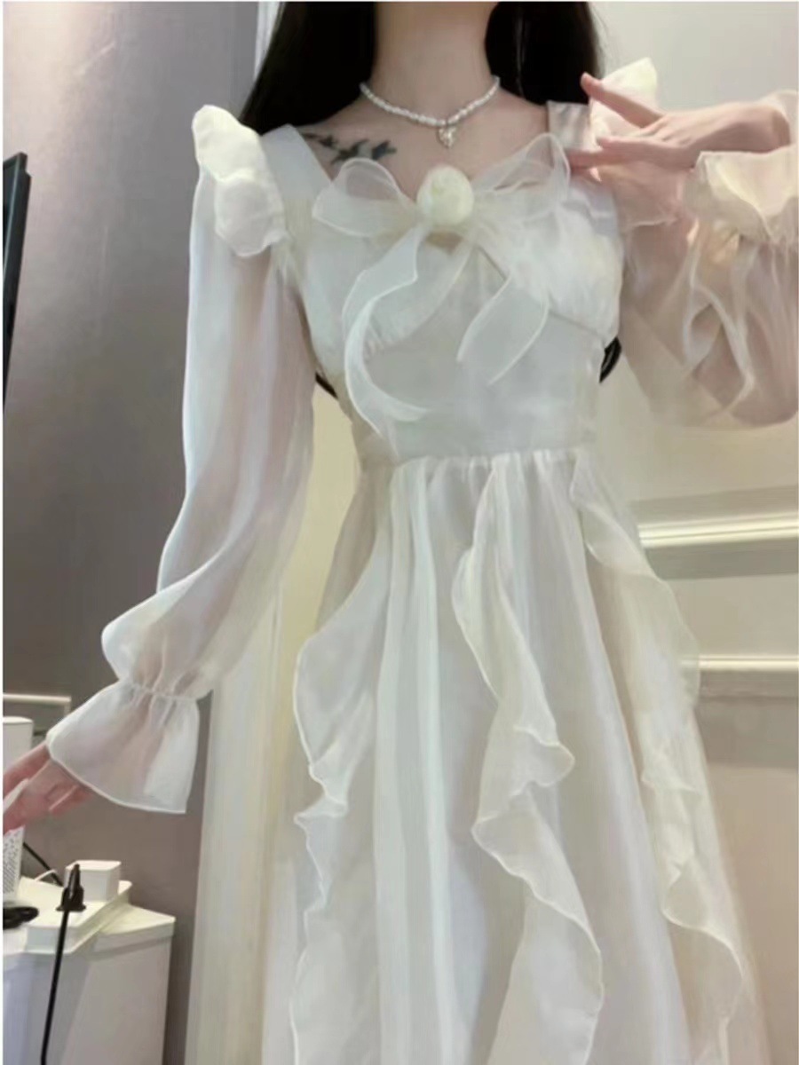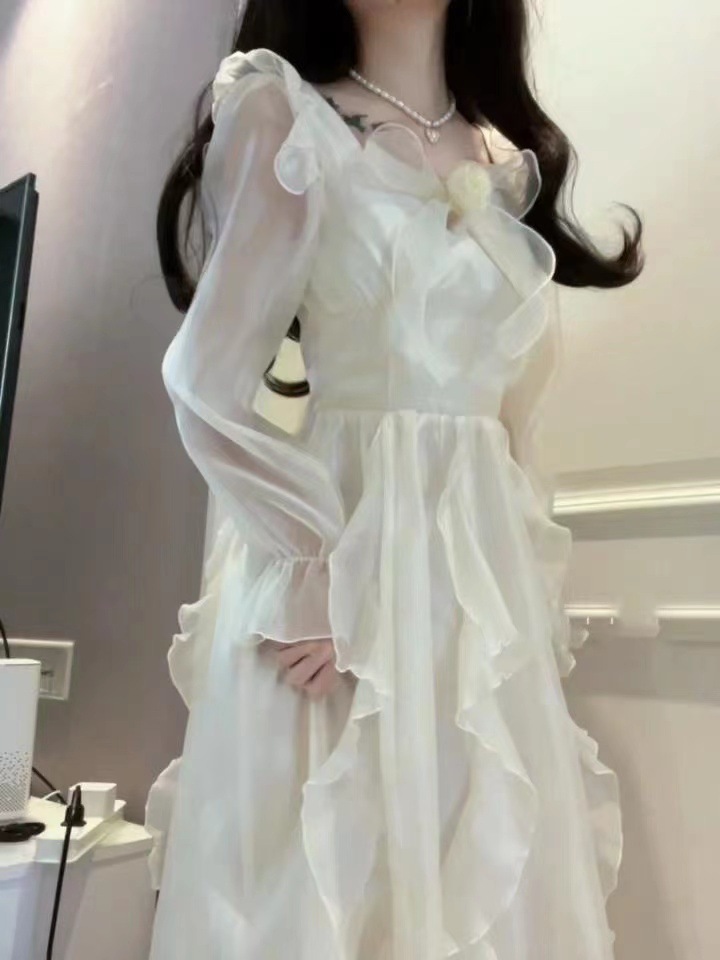 프랑스 스타일 샤넬 스타일 화이트 달빛 긴 원피스 인 라이트 럭셔리 사교계 달콤한 활 허리 슬리밍 슈퍼 페어리 퍼프 원피스