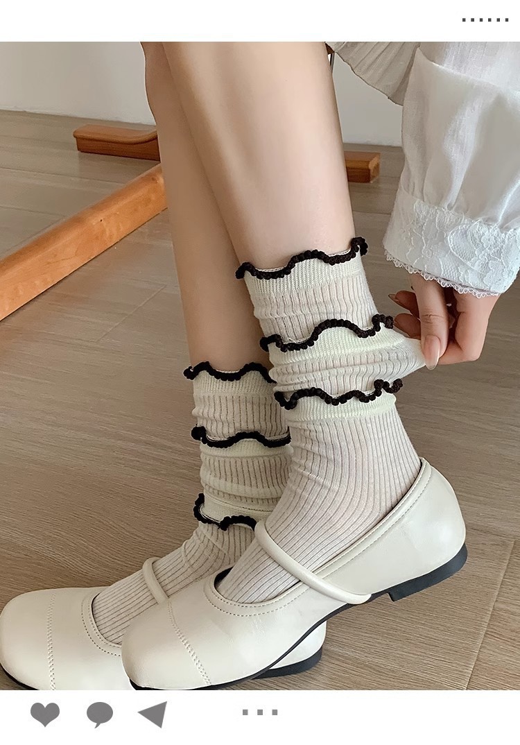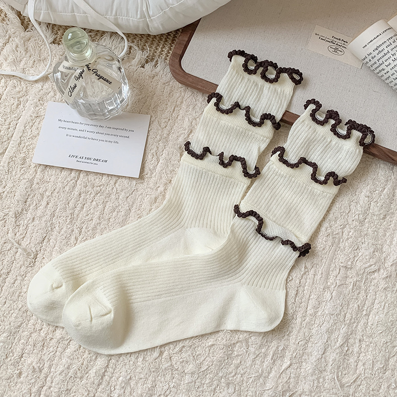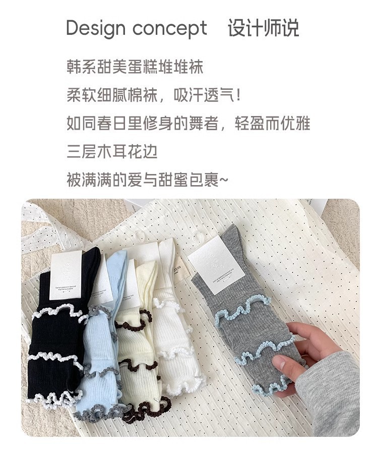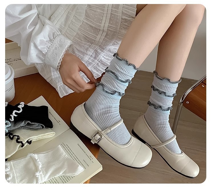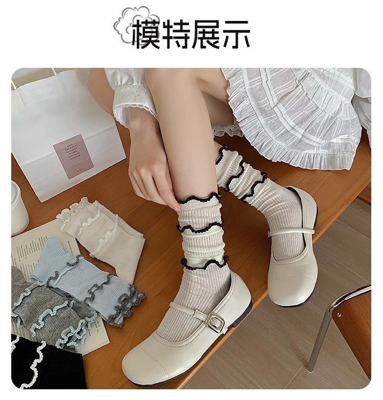 봄과 여름 얇은 단색 더미 양말 여성 일본식 나무 귀 중간 길이 양말 한국식 케이크 레이스 양말 달콤한 대학 스타일