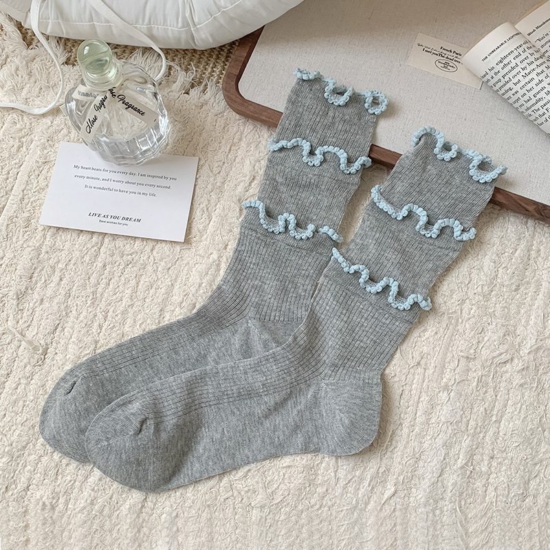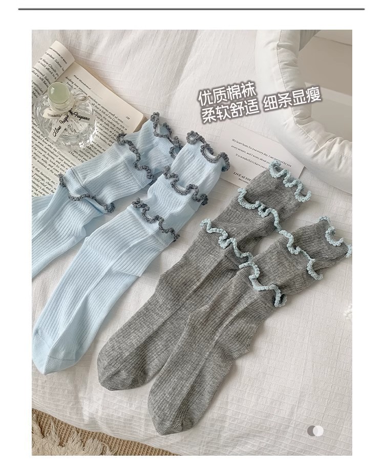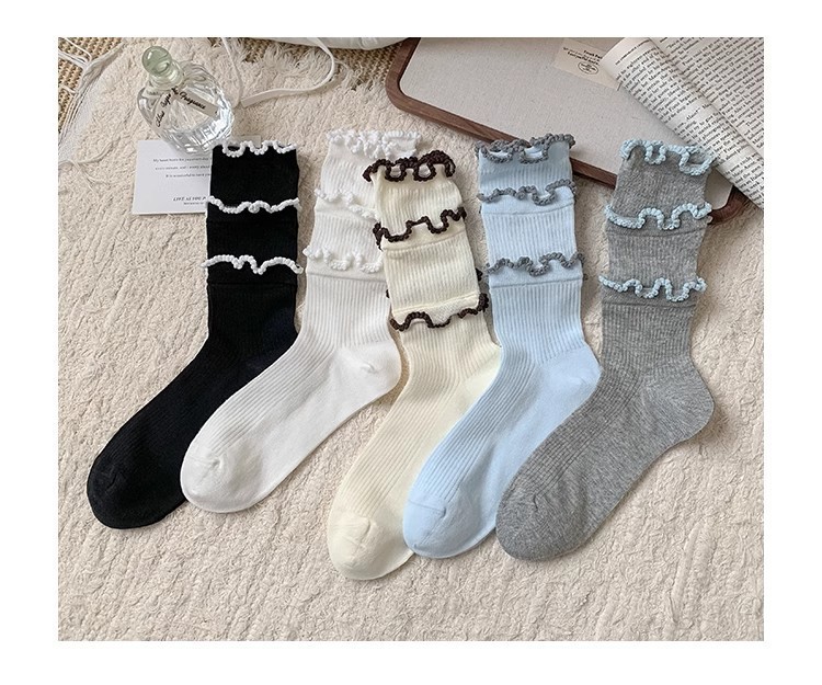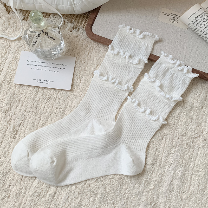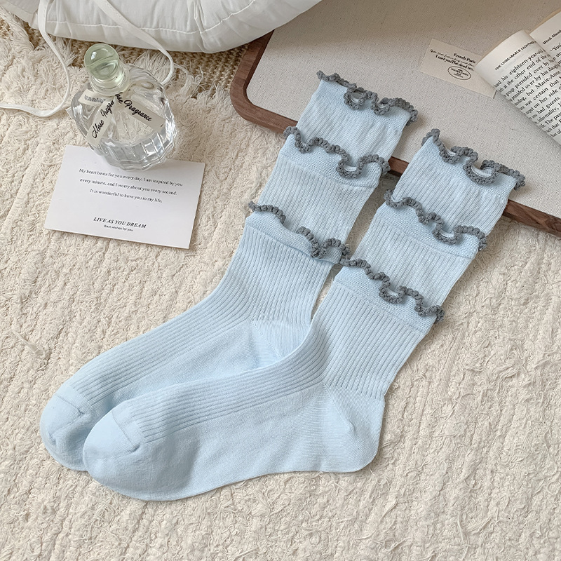 봄과 여름 얇은 단색 더미 양말 여성 일본식 나무 귀 중간 길이 양말 한국식 케이크 레이스 양말 달콤한 대학 스타일