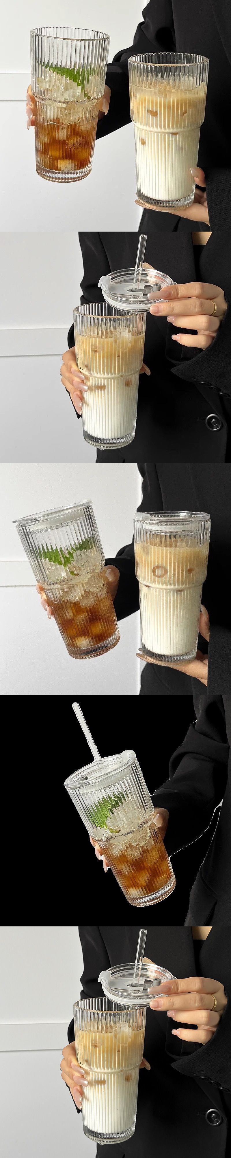 뚜껑과 빨대가 있는 Ins 스타일 대용량 세로 줄무늬 유리 컵, 고급스러운 차가운 음료 컵, 주스 커피 컵, 물컵스토어 가기