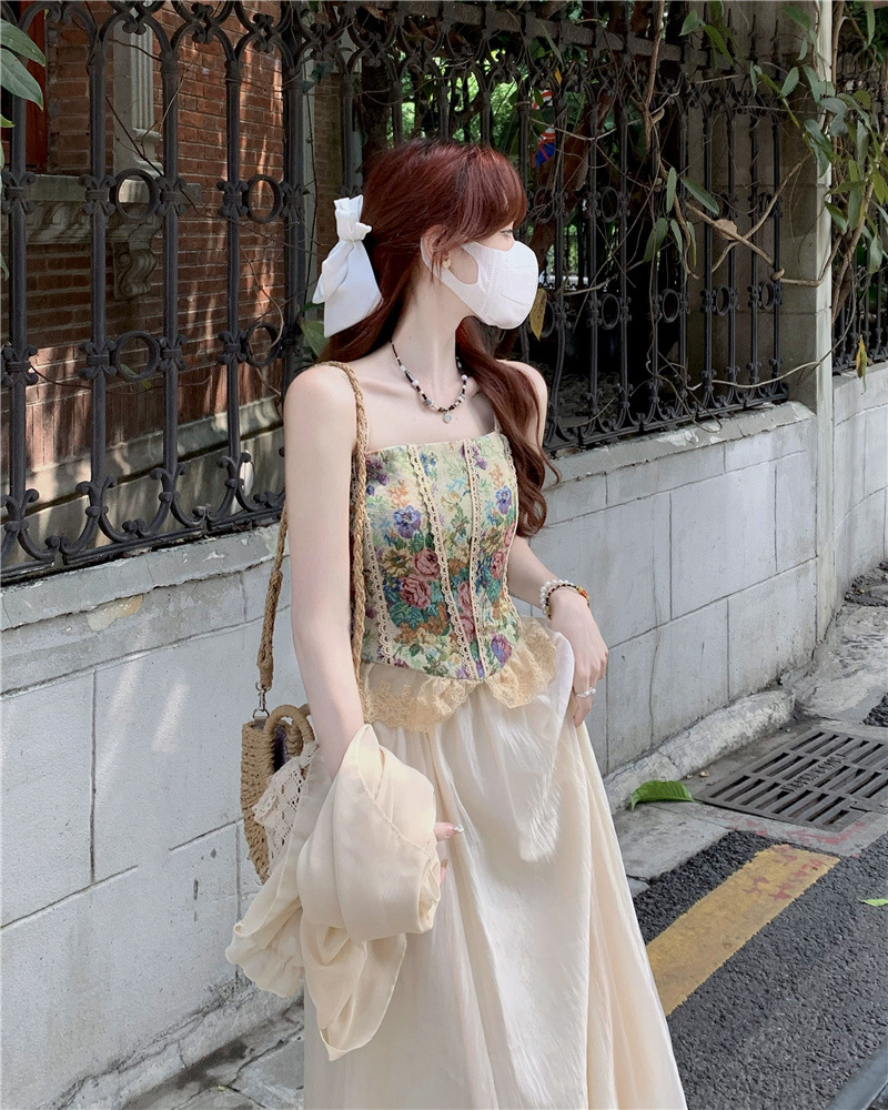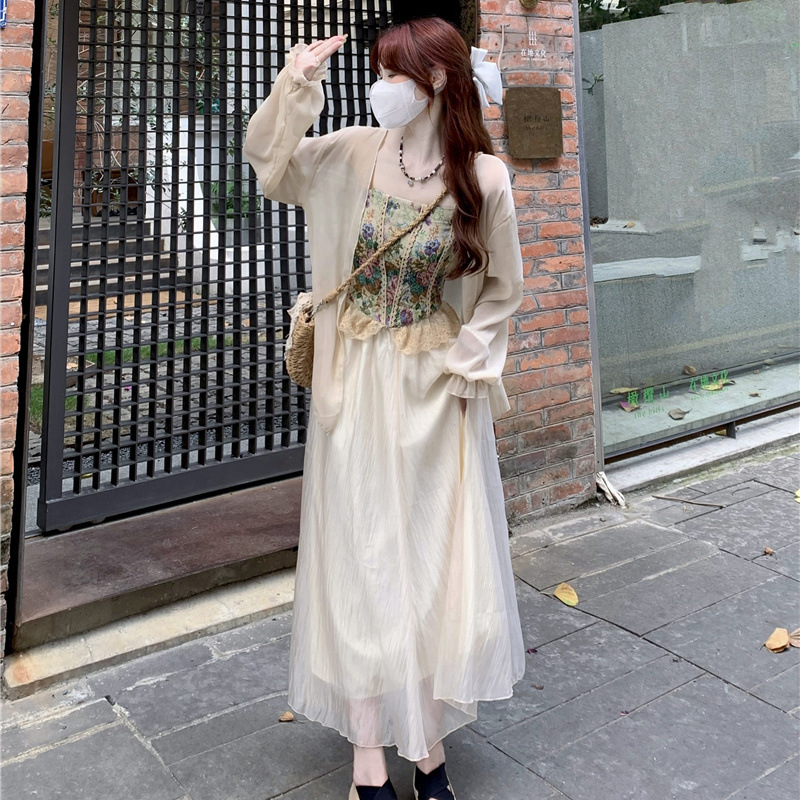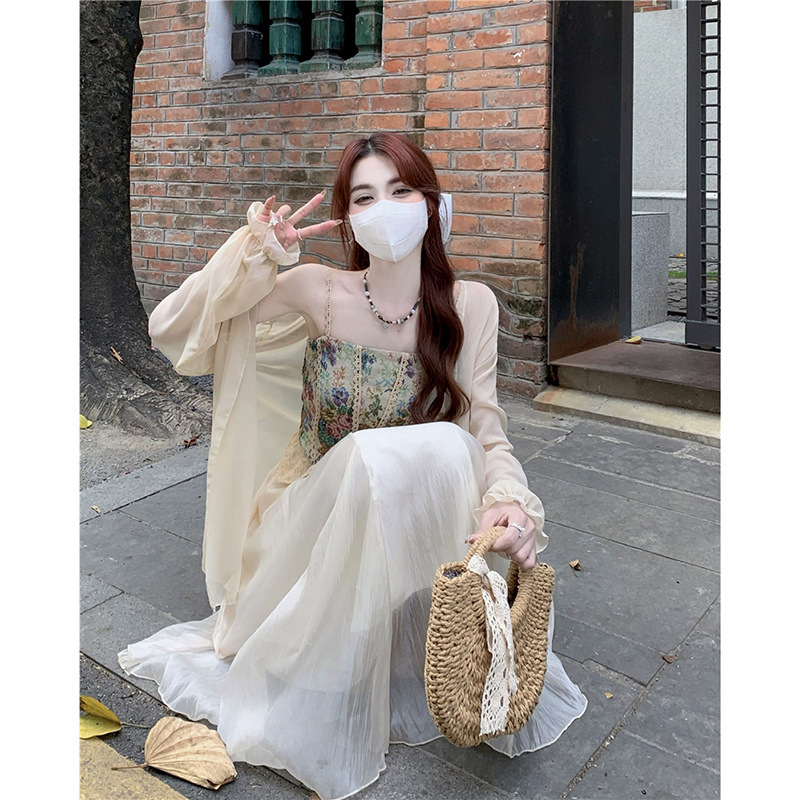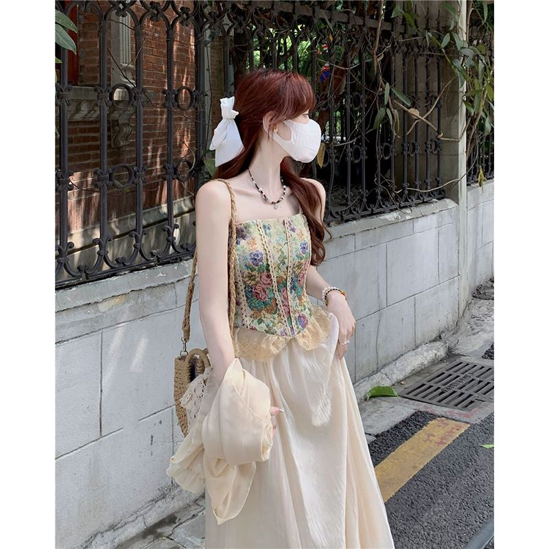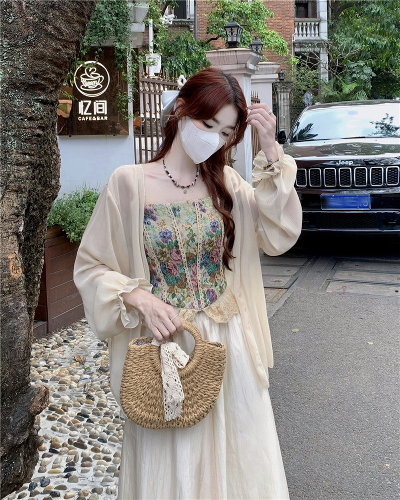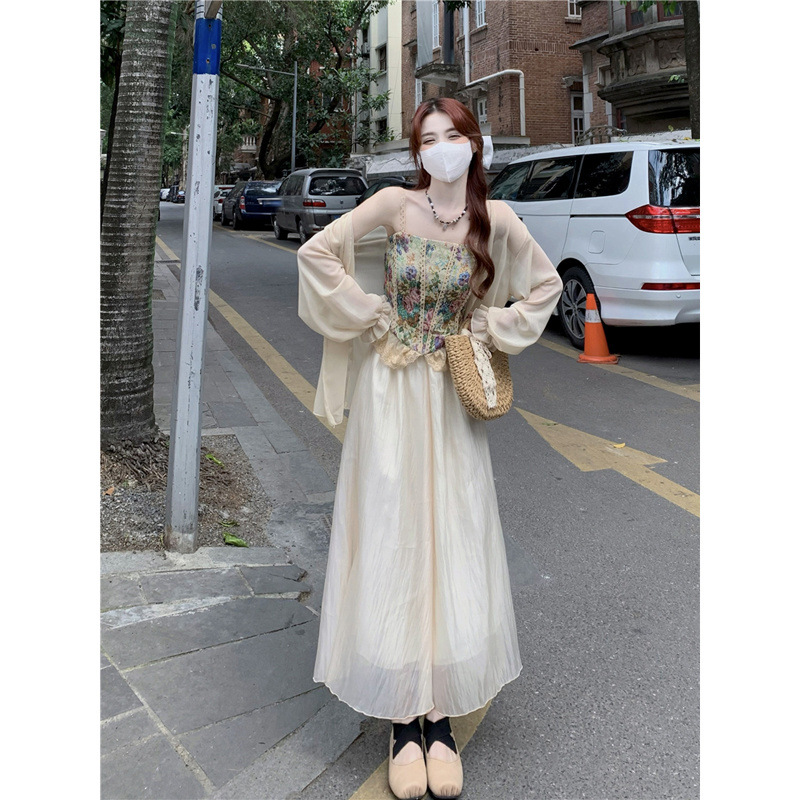 프랑스 빈티지 유화 꽃 조끼 선스크린 셔츠 반쪽 길이 원피스 여성 여름 2025 새로운 패션 세트