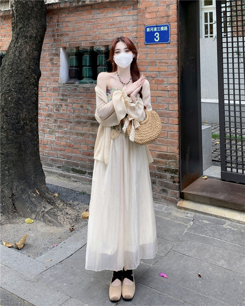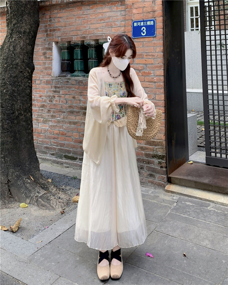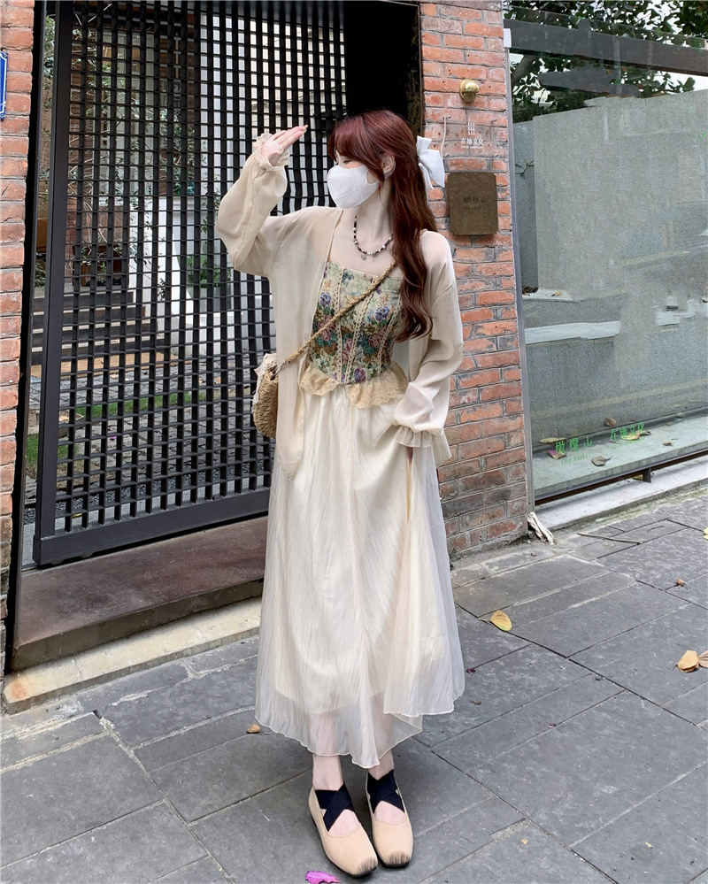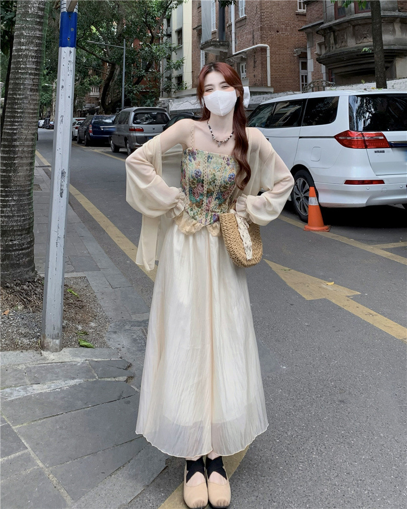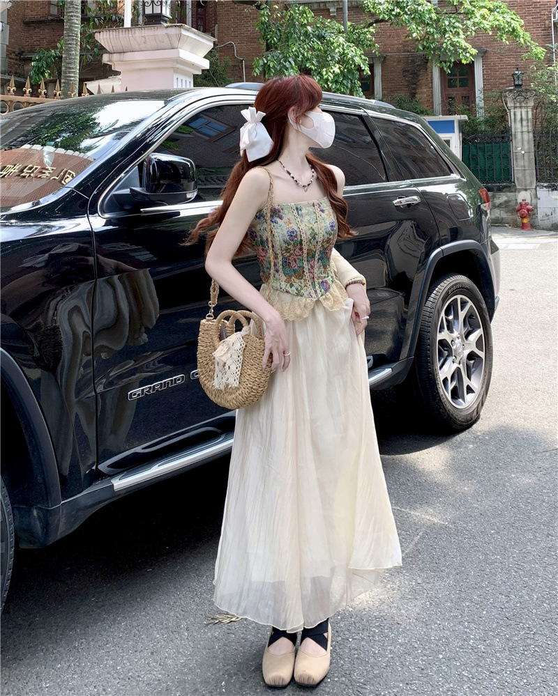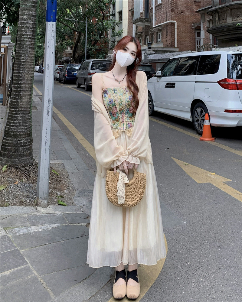 프랑스 빈티지 유화 꽃 조끼 선스크린 셔츠 반쪽 길이 원피스 여성 여름 2025 새로운 패션 세트