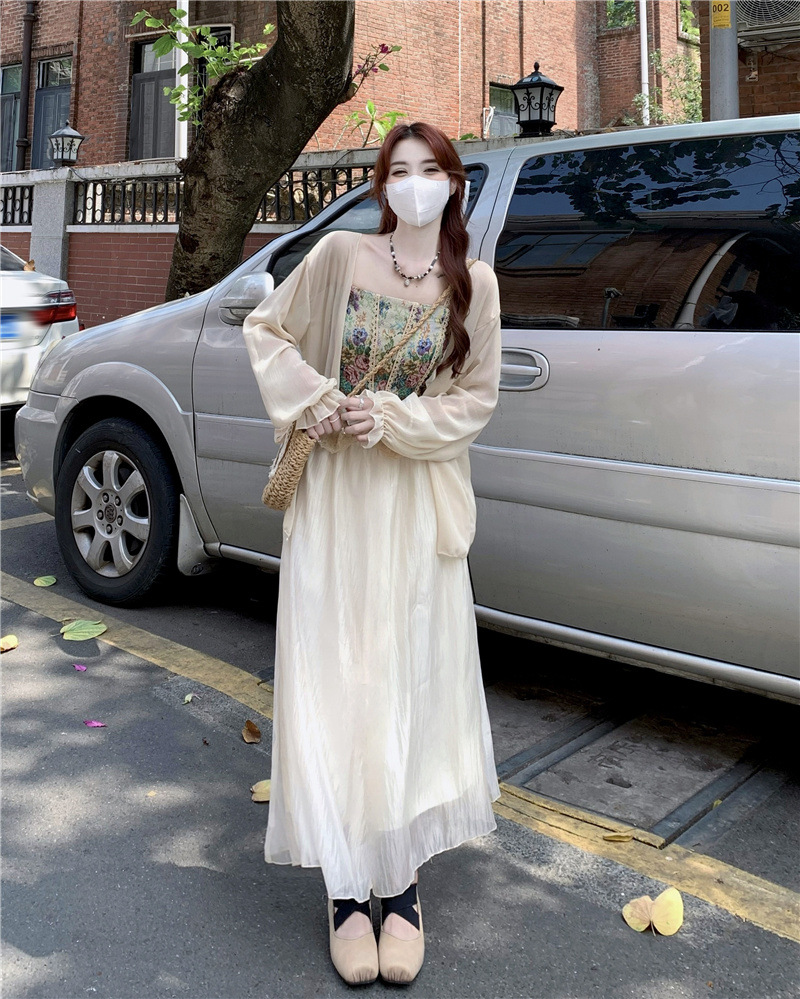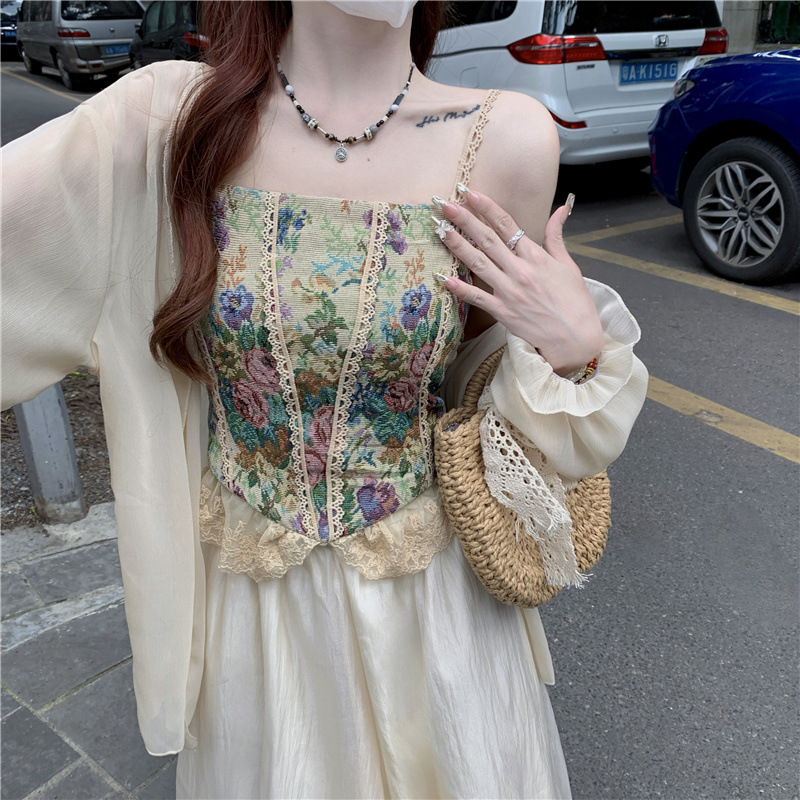프랑스 빈티지 유화 꽃 조끼 선스크린 셔츠 반쪽 길이 원피스 여성 여름 2025 새로운 패션 세트스토어 가기