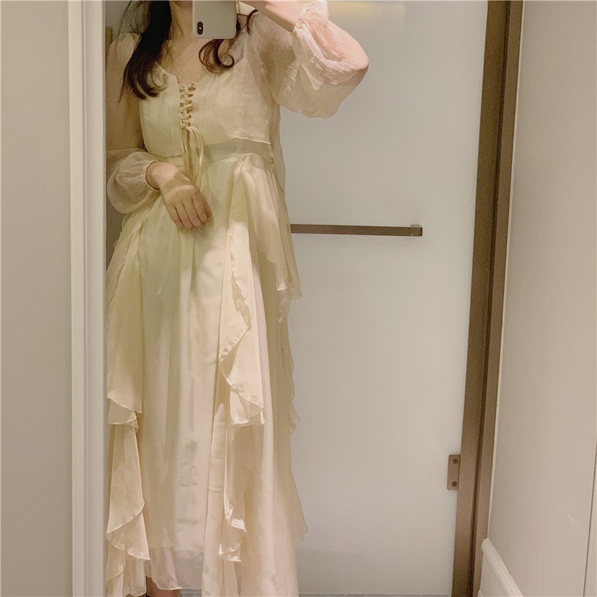 새로운 도착 프랑스 스타일 첫사랑 Platycodon Grandiflorum 요정 스커트 인 슈퍼 페어리 슬림 슬링 긴 소매 원피스 투피스 세트스토어 가기