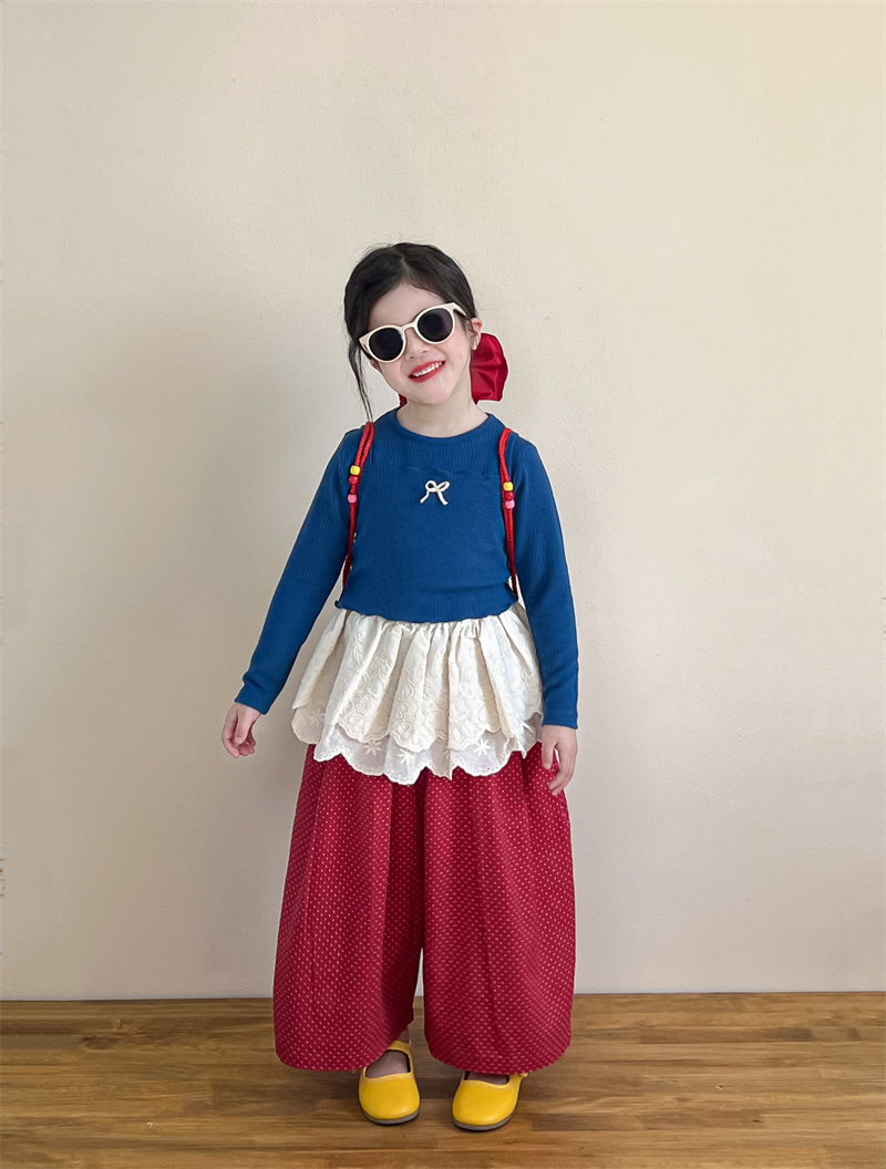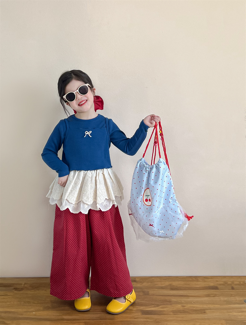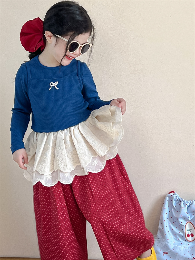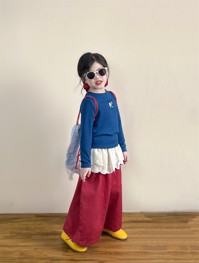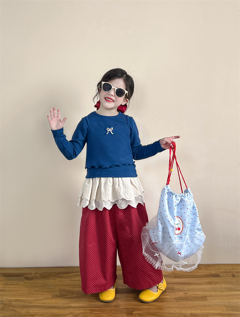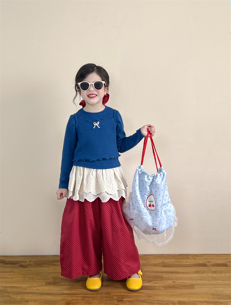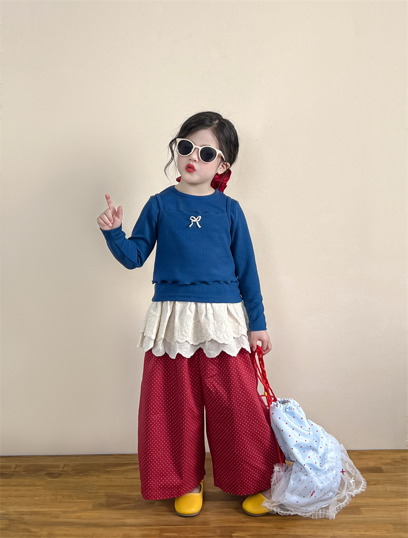 한국 소녀의 봄과 가을 블루 자수 활 스트랩 커버 아트 커튼 레드 웨이브 닷 넓은 다리 바지 세트 별도의 팻